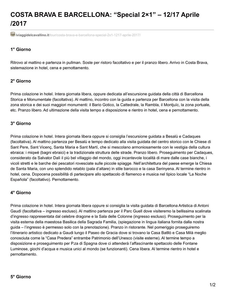 COSTA BRAVA E BARCELLONA: “Special 2×1” – 12/17 Aprile /2017 iviaggidelcavallino.it/tour/costa-brava-e-barcellona-special-2x1-1217-aprile-2017/ 1° Giorno Ritrovo al mattino e partenza in pullman. Soste per ristoro facoltativo e per il pranzo libero. Arrivo in Costa Brava, sistemazione in hotel, cena e pernottamento. 2° Giorno Prima colazione in hotel. Intera giornata libera, oppure dedicata all’escursione guidata della città di Barcellona Storica e Monumentale (facoltativa). Al mattino, incontro con la guida e partenza per Barcellona con la visita della zona storica e dei suoi maggiori monumenti: il Bario Gotico, la Cattedrale, la Rambla, il Montjuïc, la zona portuale, etc. Pranzo libero. Ad ultimazione della visita tempo a disposizione e rientro in hotel, cena e pernottamento. 3° Giorno Prima colazione in hotel. Intera giornata libera oppure si consiglia l’escursione guidata a Besalù e Cadaques (facoltativa). Al mattino partenza per Besalù e tempo dedicato alla visita guidata del centro storico con le Chiese di Sant Pere, Sant Vicenç, Santa Maria e Sant Martí, che si mescolano armoniosamente con le vestigia della cultura ebraica: i miqwé (bagni ebraici) e la tradizionale struttura delle strade. Pranzo libero. Proseguimento per Cadaques, considerato da Salvator Dalì il più bel villaggio del mondo, oggi incantevole località di mare dalle case bianche, i vicoli stretti e le barche dei pescatori rovesciate sulle piccole spiagge. Nell’architettura del paese emerge la Chiesa de Santa Maria, con uno splendido retablo (pala d’altare) in stile barocco e la casa Serinyena. Al termine rientro in hotel, cena. Dopocena possibilità di partecipare allo spettacolo di flamenco e musica nel tipico locale “La Noche Española” (facoltativo). Pernottamento. 4° Giorno Prima colazione in hotel. Intera giornata libera oppure si consiglia la visita guidata di Barcellona Artistica di Antoni Gaudì (facoltativa – ingresso escluso). Al mattino partenza per il Parc Guell dove visiteremo la bellissima scalinata d’ingresso rappresentata dal celebre dragone e la Sala delle Colonne (ingresso escluso). Proseguimento per la visita esterna della maestosa Basilica della Sagrada Familia, (spiegazione in lingua italiana fornita dalla nostra guida – l’ingresso è permesso solo con la prenotazione). Pranzo in ristorante. Nel pomeriggio proseguiremo l’itinerario artistico dedicato a Gaudi lungo il Paseo de Gracia dove si trovano la Casa Batllò e Casa Milà meglio conosciuta come la “Casa Predera” entrambe Patrimonio dell’Unesco (visite esterne). Al termine tempo a disposizione e proseguimento per P.za di Spagna dove ci attenderà l’affascinante spettacolo delle Fontane Luminose, giochi d’acqua e musica unici al mondo (se funzionanti). Cena libera. Al termine rientro in hotel e pernottamento. 5° Giorno 1/2 Prima colazione in hotel. Intera giornata libera, oppure, al mattino escursione guidata e giornaliera a Figueres e Gerona (facoltativa). Al mattino partenza per Figueres, un gioiello del surrealismo, la città di Salvador Dalì. Visita guidata al teatro-museo Dalí (ingresso escluso), l’oggetto surrealista più grande del mondo, presenta l’arte di questo maestro in tutta la sua pienezza, qui sono esposte alcune delle sue opere di maggior pregio, che vale la pena conoscere e che vanno dalle sue prime esperienze artistiche fino alle ultime creazioni. Tutto il percorso rappresenta un’esperienza. Pranzo libero. Proseguimento per la visita guidata di Gerona, città che vanta una storia antica: infatti è situata sulla confluenza di due fiumi con vista su un fertile entroterra affacciato su una costa ricca di porti naturali. Al termine rientro in hotel, cena e pernottamento. 6° Giorno Prima colazione in hotel. Ritrovo dei partecipanti al mattino ed inizio del viaggio di ritorno. Soste per il ristoro facoltativo. Arrivo in serata. Quote di Partecipazione Quota di partecipazione a coppia € 590,00 Supplemento Singola € 120,00 Supplemento partenza Luglio a coppia € 40,00 Supplemento partenza Agosto a coppia € 50,00 Hotel previsto: *** /**** semicentrale I viaggi del Cavallino è un marchio registrato ® by ElleEffe S.r.l. 2017 - P.IVA 01613810470 2/2