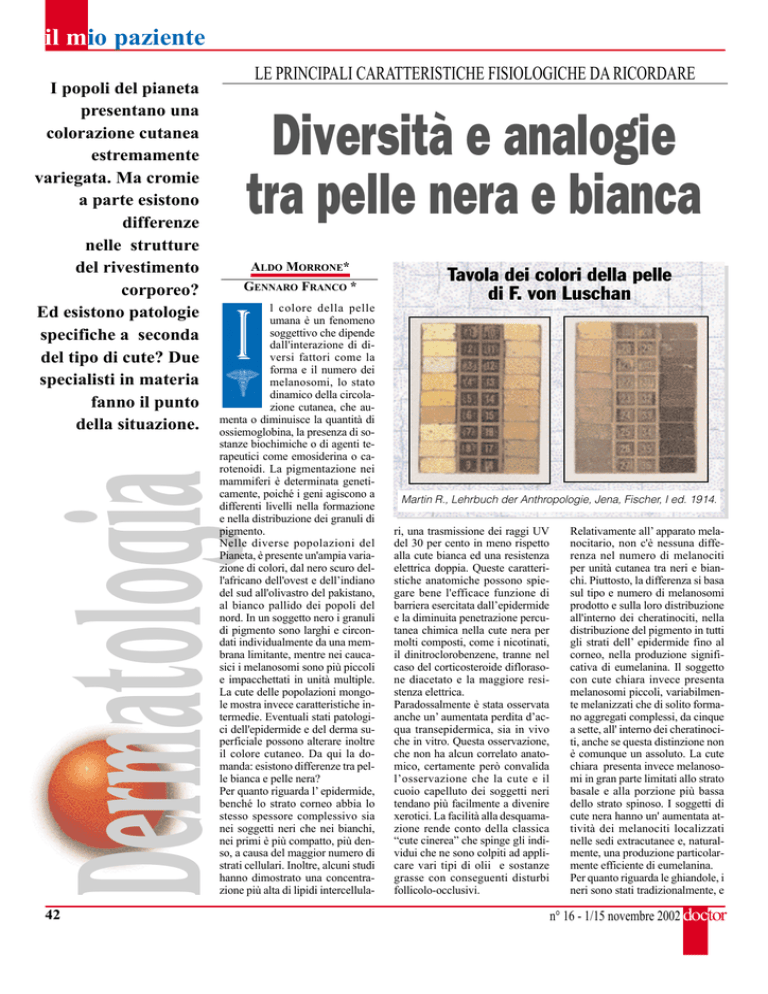 il mio paziente LE PRINCIPALI CARATTERISTICHE FISIOLOGICHE DA RICORDARE Diversità e analogie tra pelle nera e bianca ALDO MORRONE* GENNARO FRANCO * l colore della pelle umana è un fenomeno soggettivo che dipende dall'interazione di diversi fattori come la forma e il numero dei melanosomi, lo stato dinamico della circolazione cutanea, che aumenta o diminuisce la quantità di ossiemoglobina, la presenza di sostanze biochimiche o di agenti terapeutici come emosiderina o carotenoidi. La pigmentazione nei mammiferi è determinata geneticamente, poiché i geni agiscono a differenti livelli nella formazione e nella distribuzione dei granuli di pigmento. Nelle diverse popolazioni del Pianeta, è presente un'ampia variazione di colori, dal nero scuro dell'africano dell'ovest e dell’indiano del sud all'olivastro del pakistano, al bianco pallido dei popoli del nord. In un soggetto nero i granuli di pigmento sono larghi e circondati individualmente da una membrana limitante, mentre nei caucasici i melanosomi sono più piccoli e impacchettati in unità multiple. La cute delle popolazioni mongole mostra invece caratteristiche intermedie. Eventuali stati patologici dell'epidermide e del derma superficiale possono alterare inoltre il colore cutaneo. Da qui la domanda: esistono differenze tra pelle bianca e pelle nera? Per quanto riguarda l’ epidermide, benché lo strato corneo abbia lo stesso spessore complessivo sia nei soggetti neri che nei bianchi, nei primi è più compatto, più denso, a causa del maggior numero di strati cellulari. Inoltre, alcuni studi hanno dimostrato una concentrazione più alta di lipidi intercellula- 42 Tavola dei colori della pelle di F. von Luschan I Dermatologia I popoli del pianeta presentano una colorazione cutanea estremamente variegata. Ma cromie a parte esistono differenze nelle strutture del rivestimento corporeo? Ed esistono patologie specifiche a seconda del tipo di cute? Due specialisti in materia fanno il punto della situazione. Martin R., Lehrbuch der Anthropologie, Jena, Fischer, I ed. 1914. ri, una trasmissione dei raggi UV del 30 per cento in meno rispetto alla cute bianca ed una resistenza elettrica doppia. Queste caratteristiche anatomiche possono spiegare bene l'efficace funzione di barriera esercitata dall’epidermide e la diminuita penetrazione percutanea chimica nella cute nera per molti composti, come i nicotinati, il dinitroclorobenzene, tranne nel caso del corticosteroide diflorasone diacetato e la maggiore resistenza elettrica. Paradossalmente è stata osservata anche un’ aumentata perdita d’acqua transepidermica, sia in vivo che in vitro. Questa osservazione, che non ha alcun correlato anatomico, certamente però convalida l’osservazione che la cute e il cuoio capelluto dei soggetti neri tendano più facilmente a divenire xerotici. La facilità alla desquamazione rende conto della classica “cute cinerea” che spinge gli individui che ne sono colpiti ad applicare vari tipi di olii e sostanze grasse con conseguenti disturbi follicolo-occlusivi. Relativamente all’ apparato melanocitario, non c'è nessuna differenza nel numero di melanociti per unità cutanea tra neri e bianchi. Piuttosto, la differenza si basa sul tipo e numero di melanosomi prodotto e sulla loro distribuzione all'interno dei cheratinociti, nella distribuzione del pigmento in tutti gli strati dell’ epidermide fino al corneo, nella produzione significativa di eumelanina. Il soggetto con cute chiara invece presenta melanosomi piccoli, variabilmente melanizzati che di solito formano aggregati complessi, da cinque a sette, all' interno dei cheratinociti, anche se questa distinzione non è comunque un assoluto. La cute chiara presenta invece melanosomi in gran parte limitati allo strato basale e alla porzione più bassa dello strato spinoso. I soggetti di cute nera hanno un' aumentata attività dei melanociti localizzati nelle sedi extracutanee e, naturalmente, una produzione particolarmente efficiente di eumelanina. Per quanto riguarda le ghiandole, i neri sono stati tradizionalmente, e n° 16 - 1/15 novembre 2002 doctor non correttamente, considerati più sudati, untuosi e maleodoranti ma la densità di ghiandola sudoripare eccrine è la stessa. I neri africani hanno forse il doppio di ghiandole eccrine funzionanti rispetto alla loro controparte americana, il che rappresenta un adattamento di acclimatazione piuttosto che differenze strutturali. Infatti, dato un identico ambiente di vita e di lavoro, sembra che la capacità della traspirazione eccrina sia equivalente in tutti gruppi razziali. A conferma di questo dato si può citare l’ osservazione che la miliaria si osserva raramente negli africani che portano abbigliamenti tradizionale, ma si osserva sempre più spesso negli africani urbanizzati che indossano abiti di stile, taglio e materiale occidentale. L'importanza di fattori ambientali è certamente molto importante . Non sembrano inoltre esistere differenze nella densità di ghiandole sebacee per unità di superficie. Differenze maggiori si osservano nei capelli, soprattutto per quanto riguarda la sezione di taglio e la forma del follicolo pilifero. Le unghie mostrano strie pigmentarie lineari e un aumento del contenuto in azoto, senza significati patologici Per quanto riguarda derma e sottocute, ci sono solo poche informazioni che comparano i diversi gruppi. Alla microscopia ottica la distinzione tra derma papillare e reticolare è meno netta nella cute nera ed è raro osservare elastosi solare, anche nella cute fotoesposta. Le fibre elastiche immature, ossitalaniche ed elauniniche, osservabili alla giunzione dermo-epidermica e nel derma papillare, a differenza della cute bianca, non sembrano essere sistemate in maniera ordinata nelle cosiddette formazioni "candelabralike". Tenendo pertanto ben presente questi concetti, da un punto di vista anatomo-fisiopatologico, è poco conveniente parlare di “dermatologia della pelle nera”. In passato molti autori ha