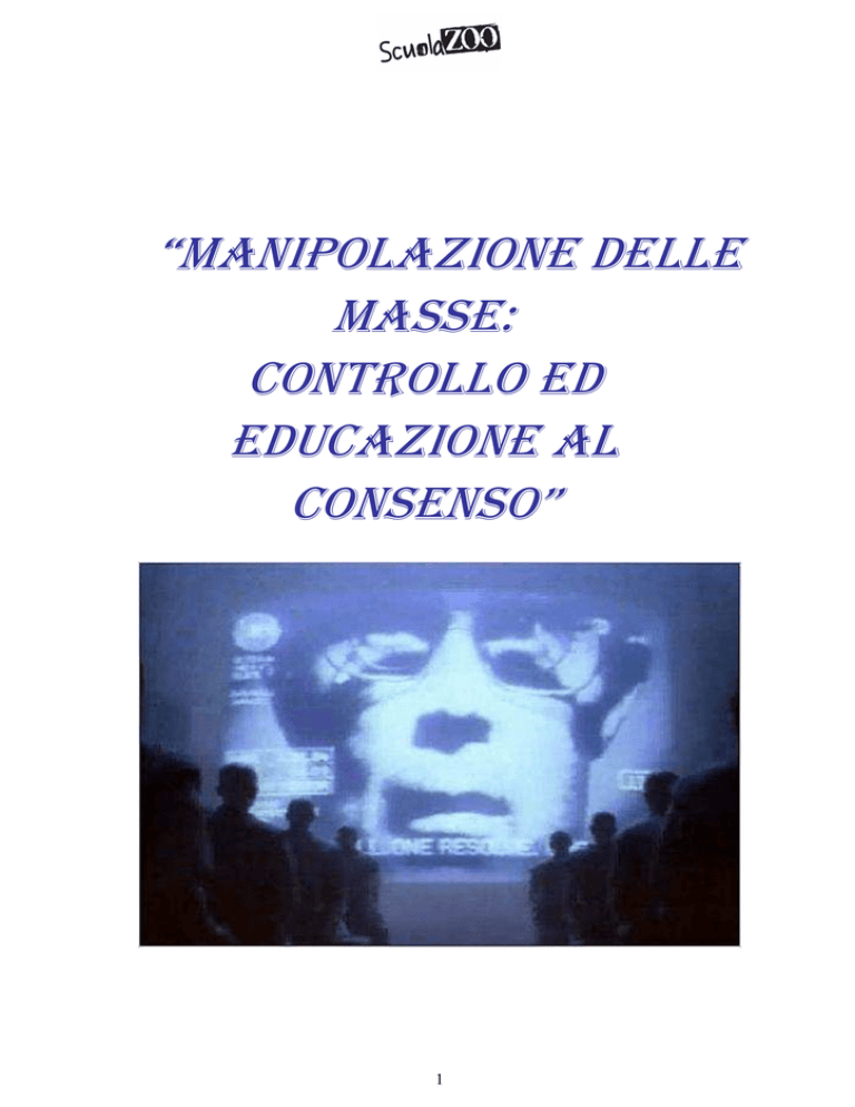 “MANIPOLAZIONE DELLE MASSE: CONTROLLO ED EDUCAZIONE AL CONSENSO” 1 INTRODUZIONE La comunicazione è considerata come quell’atto mediante il quale si ottiene una trasmissione di informazioni da un emittente (colui che invia il messaggio) ad un ricevente (colui che riceve il messaggio). A mio parere, su un principio base poggia il concetto stesso di “comunicazione”: quello secondo il quale “non si può non comunicare”. Nel regno animale, infatti, non c’è componente di qualsiasi specie che , in qualche modo, non cerchi di mettersi in contatto con i suoi simili; che questo contatto lo realizzi con emissioni vocali o atteggiamenti poco importa: in ogni caso, questo vuol dire voler “comunicare”. Soprattutto per l’essere umano, comunicare, oltre che costituire un’attitudine innata per relazionarsi con i suoi simili, come per il resto del mondo animale, ha da sempre rappresentato la risposta istintiva al suo bisogno naturale di affermazione sulla natura e sulle altre speci, nonché alla sua ricerca della sopravvivenza e conservazione della specie. L’uomo, cioè, accortosi che per sopravvivere e difendersi dalla natura ostile, sfruttando la sua superiore intelligenza rispetto alle altre speci, capì che meglio poteva spadroneggiare in quella natura selvaggia se si fosse “coalizzato” con gli altri suoi simili; da qui l’intuizione di organizzarsi in gruppo al quale egli ha saputo dare una struttura “sociale” dove la “comunicazione” tra i membri si rivelò di vitale importanza per l’evoluzione della specie umana. Per comunicare, poi, è stato indispensabile imparare un “linguaggio” che non fosse solo quello dei suoni gutturali e dei comportamenti gestuali, ma che prevedesse anche l’uso di emissioni vocali chiare per meglio esternare idee e sentimenti: ecco la nascita della “parola” senza la quale oggi l’umanità sarebbe rimasta sempre al puro stato animale. Col passare dei millenni e col progredire della “civiltà umana”, i capi ed i potenti di turno, cominciarono ad un certo punto a capire che “la parola”, se fosse stata impressa su di un qualche supporto (pietra, tavoletta di vario materiale, carta, oggi materiali informatici), non solo si sarebbe conservata nel tempo, ma sarebbe anche stata “letta” dal popolo, e non solo “ascoltata” e, pertanto, esso popolo, avendola sempre, diciamo così, presente, meglio ne avrebbe rammentato gli ammonimenti ed i precetti. Comunicando per iscritto il loro volere, i capi meglio poterono indirizzare quella che oggi chiamiamo “volontà popolare” verso l’assoluta obbedienza. Dunque, anche i potenti del passato – re, imperatori o faraoni che fossero, ancor prima di gerarchi nazifascisti e moderni leaders politici – utilizzarono gli strumenti in loro possesso per attuare strategicamente quella che oggi chiamiamo appunto “comunicazione di massa” per orientare la volontà popolare con l’arma subdola della persuasione propagandistica. Se questa non fosse bastata, allora come oggi, il ricorso alla violenza ed alla prepotenza avrebbe risolto tutto. La comunicazione, dunque, da sempre, per l’uomo ha costituito la principale arma di sviluppo sociale: essa ha permesso lo scambio di messaggi tra gli esseri umani per mezzo della “parola” (poesia), dei “movimenti del corpo” (danza), dei “suoni” (musica) e delle “immagini” (arte). Le immagini, in particolare, possono essere considerate un linguaggio universale, quell’ elemento che riesce ad essere compreso facilmente da tutti. La loro universalità, però, è legata soprattutto all’ambito della rappresentazione naturalistica, per cui le immagini propongono una rappresentazione simile a quella che i nostri occhi ci mostrano. La maggior parte dell’arte occidentale ha sempre utilizzato la rappresentazione naturalistica della realtà, facendo dell’arte uno dei mezzi di comunicazione più popolare e diffuso. 2 Oltre all’uso delle immagini, prima forma di comunicazione fin dall’era preistorica, i primi mezzi di trasmissione di messaggi rivolti ad un grande numero di individui nascono durante il XIX secolo, anche se il primo tentativo di “massificare” la cultura si ebbe nel tardo umanesimo con l’invenzione della “stampa a carattere mobili” da parte di Gutemberg. Questa nuova invenzione aprì le porte verso quel mondo non certo nuovissimo, come ho cercato sopra di chiarire, ma sicuramente scientificamente ora perseguito come esclusivo modello di sviluppo sociale: quello della “comunicazione di massa”, appunto. Un mondo che prevedeva ora come suo fondamento di sviluppo la capacità, per un messaggio lanciato, di qualsivoglia natura, di poter raggiungere un pubblico molto vasto. Tale scopo divenne facile da raggiungersi attraverso, ad esempio, la pubblicazione di quotidiani e riviste sulle pagine dei quali, a metà del XVII secolo, cominciarono a comparire i primi annunci pubblicitari. Con essi inizia a diffondersi, come mezzo primario di comunicazione di massa, il cosiddetto “manifesto”, usato soprattutto per proporre al pubblico le merci che le industrie producevano. Nel corso del XIX secolo, i vari progressi scientifici e lo sviluppo della tecnologia favorirono la nascita dei primi mezzi elettrici ed elettronici di comunicazione di massa: ricordiamo il “telegrafo” (Samuel Morse, 1837) il “telefono” (Alexander Bell, 1876), l’invenzione del “microfono” (1878) la produzione di “onde radio” (Hertz), il “cinematografo” (Fratelli Lumière, 1895), la “radio” (Marconi 1895). E’ nel 1906 che iniziano le prime trasmissioni radiofoniche (nel 1924 in Italia) e sempre nei primi anni del XX secolo si effettuano le prime le proiezioni cinematografiche. In breve tempo lo sviluppo dei mass media fu tale che si arrivò a considerarli come il “quarto potere”, dopo i poteri esecutivo, legislativo e giudiziario e, grazie allo sviluppo della tecnologia, l’informazione fu accessibile ad un nu
