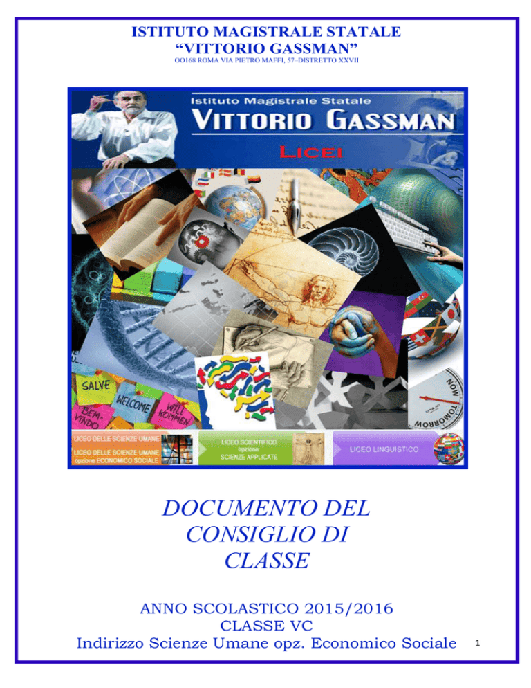 ISTITUTO MAGISTRALE STATALE “VITTORIO GASSMAN” OO168 ROMA VIA PIETRO MAFFI, 57–DISTRETTO XXVII DOCUMENTO DEL CONSIGLIO DI CLASSE ANNO SCOLASTICO 2015/2016 CLASSE VC Indirizzo Scienze Umane opz. Economico Sociale 1 Indice Composizione del Consiglio di classe Contesto territoriale Strutture Principi fondanti Criteri generali per la programmazione educativa Obiettivi formativi Obiettivi didattici generali Obiettivi formativi trasversali di classe Relazione del consiglio di classe Attività e progetti Criteri di valutazione Tipologia delle attività formative per discipline Verifica degli apprendimenti Pag.3 Pag.3 Pag.4 Pag.4 Pag.4 Pag.5 Pag.6 Pag.7 Pag.9 Pag.9 Pag.12 Pag.13 Programmi svolti Italiano Storia Filosofia Scienze Umane Diritto Economia Inglese Francese Storia dell’Arte Matematica Fisica Scienze motorie Religione Pag.14 Pag.17 Pag.19 Pag.20 Pag.22 Pag.23 Pag.24 Pag.25 Pag.27 Pag.29 Pag.31 Pag.32 2 Composizione del Consiglio di Classe (Componente Docenti) DOCENTE Donatella di Palma Italiano STABILITA’ NEL TRIENNIO 3/3 Donatella di Palma Storia 3/3 Filosofia 3/3 Vincenzo Trotta Scienze Umane 2/3 Aldo Martinelli Diritto ed Economia 3/3 Patrizia Carella Inglese 3/3 Francese 2/3 Manuela Reggiani Storia dell’arte 2/3 Patrizia Alderighi Matematica 3/3 Patrizia Alderighi Fisica 3/3 Antonella Longo Scienze Motorie 1/3 Chiara Santoro Religione 3/3 Carlo Crea Ingy Mubiayi Kakese MATERIA Contesto territoriale L’istituto è frequentato da studenti provenienti dal XIV Municipio, da quelli attigui, situati nella periferia nord ovest di Roma, e da alcuni comuni limitrofi. L’utenza è piuttosto eterogenea e multiculturale; molteplici e differenti sono gli ambienti socio-culturali ed i contesti economici di provenienza, tutti concorrenti ad un polimorfismo di identità culturali. Il territorio interessato è connotato dalle presenze dinamiche, in continua e positiva espansione, di alcuni servizi e luoghi dove si fa cultura, biblioteche, cinema, teatri e centri ricreativi, ben collegato con il centro della città di Roma. La scuola pertanto si propone come centro di aggregazione e di incontro tra diverse culture, polo di sviluppo culturale, luogo di formazione umana, crescita individuale e intellettuale. L’azione svolta dall’Istituto è quella di una agenzia formativa aperta alle esigenze del territorio e del mondo della cultura e del lavoro in collaborazione con enti ed istituzioni privati e pubblici aventi la comune finalità di educazione permanente. Strutture L’Istituto è da diversi anni protagonista nel territorio di azioni didattiche-formative tese alla valorizzazione e all’integrazione delle diversità. L'Istituto, costituito dalla sede centrale e da due succursali a poca distanza l'una dall'altra, si trova nella zona nord-ovest della città, nel 14° Municipio: • la sede centrale è situata in via Pietro Maffi n.57; dispone, oltre alle classi, di una biblioteca con funzione di aula magna e alcune postazioni multimediali, di un laboratorio linguistico, di un laboratorio di informatica e di un laboratorio di chimica-fisica, della palestra, del giardino. • la sede succursale in via Prelà dispone di un’aula polivalente multimediale e della palestra, del giardino. 3 • la seconda sede succursale in via Torrevecchia n.683 dispone della palestra e di un cortile. Tutte le classi sono provviste di computer e quasi tutte le classi di LIM. Inoltre sono disponibili videoproiettori in tutte le sedi. Principi fondanti L’Istituto “Vittorio Gassman” è una comunità educante che si richiama ai principi e ai valori della libertà, della democrazia, del rispetto civile e umano, della tolleranza e della comprensione; coltiva e valorizza le eccellenze, supporta e sostiene gli studenti in difficoltà. Compito dell’educazione, secondo la logica interculturale, è operare affinché culture diverse convivano valorizzandosi, in un rapporto fatto di scambi e di prestiti, di reciprocità, di negoziazioni e di formazione continua delle identità dei ragazzi e delle ragazze. Criteri generali per la programmazione educativa 1. 2. 3. 4. Qualità dell’insegnamento da perseguire in un’azione continua di miglioramento; Attività di recupero e sostegno; Incentivazione e sviluppo dell’eccellenza; Interdisciplinarietà e apertura alla partecipazione a progetti con enti esterni accreditati, su temi culturali e sociali rilevanti. Obiettivi formativi Per la realizzazione della crescita dell’alunno come persona e lo sviluppo delle sue attitudini e capacità espressive, comunicative, operative, relazionali, decisionali, motorie, l’Istituto ha individuato le seguenti priorità: 1. Garantire un’attività scolastica regolare e ben organizzata in un clima di relazioni che faciliti l’ascolto, il rispetto reciproco, la comunicazione; 2. Sviluppare le capacità logiche, critiche, espressive, creative, operative; 3. Sviluppare una capacità di comunicazione efficace anche attraverso l’utilizzo di nuove tecnologie; 4. Sviluppare capacità di continuare ad apprendere in una realtà complessa in rapida evoluzione. 5. Promuovere l’autostima e il senso di responsabilità, valorizzando le attitudini personali. 6. Acquisire un rigoroso metodo di lavoro, fondato sull’impegno sistematico e la ricerca costante. 7. Acquisire autonomia di giudizio e padronanza espressiva, intesa come realizzazione di sé e della propria cultura. 8. Promuovere il desiderio di individuare spiegazioni e strategie risolutive, sviluppando abilità, capacità e competenze mirate. 9. Educare alla convivenza civile, alla solidarietà, all’armonia con gli altri, alla cooperazione, nella consapevolezza che la conoscenza è una conquista comune. 10. Armonizzare il proprio sapere con le esigenze della società. 11. Organizzare l’accoglienza degli alunni nel contesto scolastico per favorire l’inclusività di tutti nello svolgersi delle lezioni e progetti e nell’attività di orientamento in entrata e in uscita. 12.