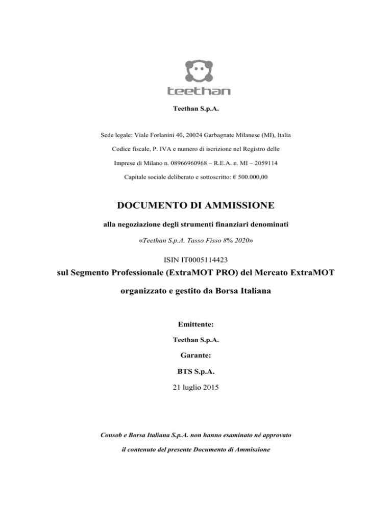 Teethan S.p.A. Sede legale: Viale Forlanini 40, 20024 Garbagnate Milanese (MI), Italia Codice fiscale, P. IVA e numero di iscrizione nel Registro delle Imprese di Milano n. 08966960968 – R.E.A. n. MI – 2059114 Capitale sociale deliberato e sottoscritto: € 500.000,00 DOCUMENTO DI AMMISSIONE alla negoziazione degli strumenti finanziari denominati «Teethan S.p.A. Tasso Fisso 8% 2020» ISIN IT0005114423 sul Segmento Professionale (ExtraMOT PRO) del Mercato ExtraMOT organizzato e gestito da Borsa Italiana Emittente: Teethan S.p.A. Garante: BTS S.p.A. 21 luglio 2015 Consob e Borsa Italiana S.p.A. non hanno esaminato né approvato il contenuto del presente Documento di Ammissione AVVERTENZA L’offerta degli strumenti finanziari Teethan S.p.A. Tasso Fisso 8% 2020 (le “Obbligazioni”) è rivolta esclusivamente a investitori qualificati sul mercato italiano, con esclusione di Stati Uniti d’America, Canada, Giappone e Australia, o di qualsiasi altra giurisdizione nella quale l’offerta o la vendita delle Obbligazioni sia soggetta all’autorizzazione da parte di autorità locali o comunque vietata ai sensi di legge. Le Obbligazioni sono offerte solo ad investitori qualificati (“Investitori Qualificati”) come definiti dalla Direttiva 2003/71/EC, come successivamente modificata dalla Direttiva 2010/73/EU (“Direttiva Prospetti”) e, pertanto, non è richiesta la pubblicazione di un prospetto d’offerta redatto secondo la Direttiva Prospetti. Il presente è un documento di ammissione (il “Documento di Ammissione”) al Segmento Professionale del Mercato ExtraMOT (ExtraMOT PRO), sistema multilaterale di negoziazione organizzato e gestito da Borsa Italiana S.p.A., ed è stato redatto ai sensi del Regolamento del mercato ExtraMOT (il “Regolamento ExtraMOT”). Il presente Documento di Ammissione non costituisce un’offerta al pubblico in Italia avente ad oggetto le Obbligazioni né in altro paese, quale Stati Uniti d’America, Canada, Australia, Giappone, nel quale l’offerta delle Obbligazioni non sia consentita in assenza di autorizzazione da parte delle competenti autorità (gli “Altri Paesi”). La pubblicazione del presente Documento di Ammissione non è stata autorizzata dalla Consob né da Borsa Italiana S.p.A.. Le Obbligazioni sono emesse in regime di esenzione dall’applicazione della disciplina sull’offerta al pubblico, ai sensi dell’articolo 100 del TUF e della normativa secondaria di attuazione, incluso il regolamento adottato da CONSOB con delibera n. 11971 del 14 maggio 1999, come successivamente modificato. Le Obbligazioni non sono state e non saranno registrate ai sensi dello United States Securities Act del 1933, come successivamente modificato, o presso qualsiasi autorità di uno stato degli Stati Uniti d’America o in base alla normativa in materia di strumenti finanziari in vigore in Australia, Canada, Giappone o negli Altri Paesi. Le Obbligazioni non possono essere offerte, vendute o comunque trasferite, direttamente o indirettamente, in Australia, Canada, Giappone, Stati Uniti d’America o in Altri Paesi né potranno essere offerte, venduti o comunque trasferiti, direttamente o indirettamente, per conto o a beneficio di cittadini o soggetti residenti in Australia, Canada, Giappone, Stati Uniti d’America o Altri Paesi. La pubblicazione e la distribuzione del Documento di Ammissione in altre giurisdizioni potrebbero essere soggette a restrizioni di legge o regolamentari. La violazione di tali restrizioni potrebbe costituire una violazione della normativa applicabile in materia di strumenti finanziari nella giurisdizione di competenza. Le informazioni sull’ammissione alle negoziazioni delle Obbligazioni e il Documento di Ammissione sono accessibili esclusivamente a soggetti che (a) sono residenti in Italia e non sono domiciliati né comunque si trovano attualmente negli Stati Uniti o altrove (ad eccezione che 2 in Italia) e (b) non sono U.S. Person secondo la definizione contenuta nella Regulation S dello United States Securities Act del 1933, come successivamente modificato. In nessuna circostanza, è consentito far circolare, direttamente o tramite terzi, il Documento di Ammissione o altre informazioni sulle Obbligazioni, al di fuori dell’Italia, in particolare negli Stati Uniti d’America, in Canada, in Australia, in Giappone o in Altri Paesi, né distribuire il Documento di Ammissione o altre informazioni sulle Obbligazioni, a persone non residenti in Italia. 3 INDICE AVVERTENZA ...................................................................................................................................................... 2 INDICE ................................................................................................................................................................... 4 DEFINIZIONI ......................................................................................................................................................... 5 GLOSSARIO .........................................................................................................................................................10 1. PERSONE RESPONSABILI ...................................................................................................................11 2. FATTORI DI RISCHIO...........................................................................................................................12 2.1 RISCHI CONNESSI ALL’EMITTENTE ..........................................................................................12 2.2 RISCHI CONNESSI AL SETTORE IN CUI L’EMITTENTE E IL GARANTE OPERANO ..........19 2.3 FATTORI DI RISCHIO RELATIVI ALLE OBBLIGAZIONI .........................................................21 3. INFORMAZIONI RELATIVE ALL’EMITTENTE................................................................................25 4. STRUTTURA ORGANIZZATIVA DELL’EMITTENTE ...............................................