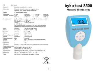 15 byko-test 8500 Dati Tecnici Sonda Fe Misure su substrati in ferro e acciaio Sonda NFe Misure su substrati metallici non-magnetici, come Alluminio, Zinco, Rame, Ottone, Acciaio inox Range V. specifiche delle sonde Risoluzione 0.1 !m (impostaz. standard) 1 !m 0.01 mm 0-99.9 !m 100-999 !m " 1.00 mm 0.01 mil 0.1 mil 1 mil Manuale di Istruzione 0-9.99 mil 10-100 mil > 100 mil Accuratezza (calibraz. di fabbrica su piastre standard fornite con lo strumento) ± (1 !m + 2%*) 0 - 2000 !m ± (0.04 mil + 2%*) 0 - 80 mil ± 3.5%* > 2000 !m (80 mil) (* della lettura) Con la calibrazione ad un punto o a due punti l’accuratezza può essere ancora migliorata usando i fogli di calibrazione opzionali. Area Minima Sonda Fe Sonda NFe 10 x 10 mm# (0.4" x 0.4") 6 x 6 mm# (0.24" x 0.24") Curvatura Minima convesso concavo 5 mm (0.2") 30 mm (1.2") Spessore Substrato Minimo Sonda Fe Sonda NFe 0.2 mm (8 mil) 0.05 mm (2 mil) Capacità Memoria Letture Batches Calibrationi Basic 100 1 1 Premium fino a 13,000 (max. 2000 letture per batch) 999 100 Interfaccia wireless 2.4 GHz, range max. 10 m (30ft) in ambiente non disturbato Range di temperatura Conservazione da -10°C a 60°C (da 14°F a 140°F) Esercizio da 0°C a 50°C (da 32°F a 122°F) Alimentazione 2 batterie (AA) 1.5V Alcaline, o 2 batterie ricaricabili (AA) 1.2V Dimensioni Peso 124 mm x 67 mm x 33 mm ( 4.9" x 2.6" x 1.3") ca. 120 g (4.3 oz) strumento con batterie e sonda 15 MAIN MENU Measuring Mode Select Substrate Fe / NFe Fe NFe C ombined Measurement Measurement Type Single Measurement C ontinuous Upper Limit Mode Set Input Limit D elete OK Value C ancel Lower Limit Set Input Limit D elete OK Value = selection C ancel Averaging by scrolling through list = basic model OFF Input N o. of R eadings D elete All Memory OFF D ata Memory N ew Batch Input N ame of Select Batch Select Display Batch R eadings R eadings Info Info D ate / Time D elete R eading D ate / Time Upper Limit Set Input Limit D elete OK OK C ancel Value C ancel Lower Limit Set Input Limit D elete OK Value C ancel R ename Batch Modify Batch N ame D elete Batch OK C ancel Statistics MAIN MENU C alibration Select Batch for D isplay Custom C alibration continued Select Statistic Parameters D elete All R eset to Factory C alibration D efine N ew C alibration Input N ame Select C alibration Select C alibrate One Point C al Perform C alibration Two Point C al Average Zero OFF Input N o. of Zero R eadings R ename C alibration Modify N ame D elete C alibration OK C ancel Setup Display Unit !m mil C oarse R esolution N ormal Fine Backlight Auto OFF Orientation N ormal Flip Wireless Interface ON OFF Display System Info = basic model Language Select Languag e Buzzer ON OFF D ate / Time Set Time Set D ate 2 = selection by scrolling through list 5 Impostazione dello standard zero Quando si usa una sonda per la prima volta, dopo un cambio di pile, con applicazione che variano, o dopo un lungo periodo di inutilizzo, è necessario effettuare un azzeramento. Premere il tasto !. Quindi porre la sonda su una delle piastre di riferimento nella custodia o su un appropriato substrato Fe o NFe non verniciato. Sul display viene mostrato un numero di controllo. Quindi alzare la sonda per almeno 5 cm (2"). Dopo che appare brevemente un secondo numero di controllo sul display, lo strumento mostra 0.0!m (mil). I numeri di controllo non sono importanti per l’utente. Il processo di azzeramento è ora completo. Nota: L’azzeramento si può anche fare posizionando prima la sonda e poi premendo !. Per l’azzeramento su superfici ruvide V. § 7.1.2. 6 Modo di misurazione Lo strumento offre diverse opzioni per scegliere il modo di misurazione. L’impostazione del modo di misurazione può essere fatto usando il menu normale (V. § 7.2.1). Si può accedere alle impostazioni direttamente anche usando il tasto" quando il menu non è attivo. Per quelle applicazioni con un tipo di substrato ben definito, il Modo Fe o NFe: modo di misura può essere fissato a Fe o NFe rispettivamente. Per le applicazioni con vari substrati (substrati Fe e Nfe) si Modo Fe / NFe: dovrebbe impostare il modo Fe/NFe. Ad esempio se il substrato cambia da acciaio ad alluminio e la sonda viene posta sul nuovo substrato per la prima volta, lo strumento mostra il messaggio "No Fe-substrate – ripetere". Quando la sonda viene di nuovo posizionata, la nuova misura viene presa nel modo NFe. La procedura è a seconda se si passa da un subrato NFe ad uno Fe. Quando si accende, lo strumento inizia con il modo di misura che era usato prima dello spegnimento. Questo modo può essere usato ad esempio quando un oggetto Modo Combinato: di acciaio viene galvanizzato con zinco e poi verniciato. Lo strumento mostra lo spessore del rivestimento di zinco e della vernice separatamente. IMPORTANTE: Nel modo combinato il substrato NFE deve avere uno spessore minimo di 50 #m (2 mil) al fine di avere delle letture corrette. 6 Indice 1 2 Generale Cambio delle sonde 5 5 3 Alimentazione e cambio delle batterie 5 4 5 Utilizzo Impostazione dello standard zero 5 6 6 Modo di misurazione 6 7 7.1 Menu Calibrazione 7 7 7.1.1 7.1.1.1 Calibrazione personalizzata Cancellazione di tutte le calibrazioni personalizzate 7 7 7.1.1.2 Calibrazione di fabbrica 7 7.1.1.3 7.1.1.4 Creazione di una nuova calibrazione personalizzata Selezione di una calibrazione personalizzata 7 8 7.1.1.4.1 Attivazione di una calibrazione personalizzata 8 7.1.1.4.2 Metodo di calibrazione 7.1.1.4.2.1 Calibrazione ad un punto 8 8 7.1.1.4.2.2 Calibrazione a due punti 7.1.1.4.3 Rinomina della calibrazione personalizzata 8 8 7.1.1.4.4 Cancellazione della calibrazione personalizzata 8 7.1.2 7.2 Azzeramento mediato su superfici grezze (BMR) Impostazioni del modo di misurazione 8 9 7.2.1 Scelta del substrato 9 7.2.2 7.2.3 Misura singola / Misura continua Limite superiore 9 9 7.2.3.1 7.2.3.2 Impostazione del limite superiore Cancellazione del limite superiore 9 9 7.2.4 Limite inferiore 9 7.2.5 7.3 Media delle letture Modo mem