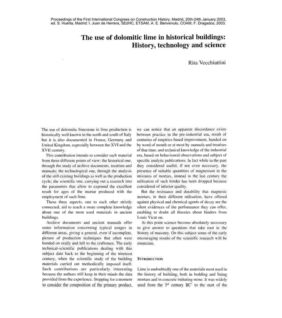 Proceedings of the First International Congress on Construction History, Madrid, 20th-24th January 2003, ed. S. Huerta, Madrid: I. Juan de Herrera, SEdHC, ETSAM, A. E. Benvenuto, COAM, F. Dragados, 2003. The use of dolomitic lime in historical buildings: History, technology and science Rita Vecchiattini The use of dolomitic limestone in lime production is historically well known in the north and south ofTtaly but it is also documented in France, Germany and United Kingdom, especially between the XVI and the XVII century. This contribution intends to consider such material from three different points of view: the historical one, through the study of archi ve documents, treatises and manuals; the technological one, through the analysis of the still existing buildings as well as the production cycJe; the scientific one, carrying out a research into the parameters that allow to expound the excellent result for ages of the mortar produced with the employment of such lime. These three aspects, one to each other strictly connected, aid to reach a more complete knowledge about one of the most used material s in ancient buildings. Archive documents and ancient manuals offer some information concerning typical usages in different areas, giving a general, even if incomplete, picture of production techniques that often were handed on orally and left to the craftsmen. The early technical-scientific publications dealing with this subject date back to the beginning of the nineteen century, when the scientific study of the building materials carried out methodically imposed itself. Such contributions are particularly interesting because the authors still keep in their minds the data provided from the experience. Stopping for a moment to consider the composition of the primary product, we can notice that an apparent discordance exists between practice in the pre-industrial era, result of centuries of empirics based improvement, handed on by word of mouth or at most by manual s and treatises of that time, and technical knowledge of the industrial era, based on behavioural observations and subject of specific analytic publications. In fact while in the past they considered useful, if not even necessary, the presence of suitable quantities of magnesium in the mixtures of mortars, instead in the last century the utilisation of such binder has been dropped because considered of inferior quality. But the resistance and durability that magnesic mortars, in their different utilisation, have offered against physical and chemical agents of decay are the silent evidences of the performance they can offer, enabling to doubt all theories about binders from Louis Vicat on. At this point science become absolutely necessary to give answer to questions that take root in the history of masonry. On this subject some of the early encouraging results of the scientific research will be enunciate. INTRODUCTlON Lime is undoubtedly one ofthe materials most used in the history of building, both in bedding and lining mortars and in concrete imitating stone. It was widely used from the 3rd century BCI to the start of the 2066 R. Vecchiattini twentieth century, after which lime was graduaJIy replaced by cement, in the conviction that the «new» material was better than the old in every respec1. Actually, restoration experience has shown that, apart from aesthetic problems, specific physical characteristics of cement2 do not make it compatible with lime-based structures and linings. Today lime is once again present on the market, to satisfy the requirements of people working in the restoration field, who are continually in search of products respecting the theorised criteria of compatibility and reversibility. However, it does not seem that the lime produced and cast today is able to provide objects that are as efficient and resistant as the majority of the old ones were. During the decades it took for people to become certain that in preindustrial construction it was not advisable to use cement, except for structural purposes, know-how referring to the production and employment of lime was irremediably 10s1. Hence architects and restorers are now concentrating their attention more and more on historic mortars, both to copy their recipes in order to solve design problems, and to study and characterise them simply in order to know more about them. The present paper fits into this broad panorama of studies, since it looks in some depth at a particular type of lime, dolomitic, deriving from the decomposition of dolomite limestone, a rock constituted by a double carbonate of caIcium and magnesium' CaMg(CO,)2' It appears interesting to analyse it since the use of this rock for the production of lime, now abandoned -although dolomitic limestone constitutes more than 50% of the carbonates on earth- was historically very common in the North and South of Italy but is al so documented in Spain, France, Germany and England (Newton 1987; Manzano et al. 2000), above all from the 16thto the 17thcenturies. Indeed, numerous analyses, aiming above all at characterising mortars present in historie buildings, bear witness to the use of dolomitic lime even where this was not the only material available, nor even the most convenient to use. This observation, together with the finding of archive documents (Vecchiattini 1998; Fieni 2000) specifically requesting lime from dolomitic limestone quarries, and the empirical datum that dolomitic limestone-based mortars do very weJI in the «test of time», makes it possible to consider the choice of this material one made in full awareness and not by chance, that is to say one due to convenience or to incapacity of operators to make the right selection. lnteresting and revealing, regarding the capacity to choose binders, is the case of the celebrated Porta Bozzolo villa at Casalzuigno (Varese province) (Bassani e Cassani 1994; Fieni 1995, 64--68), in which the lining mortars were done with care and attention var