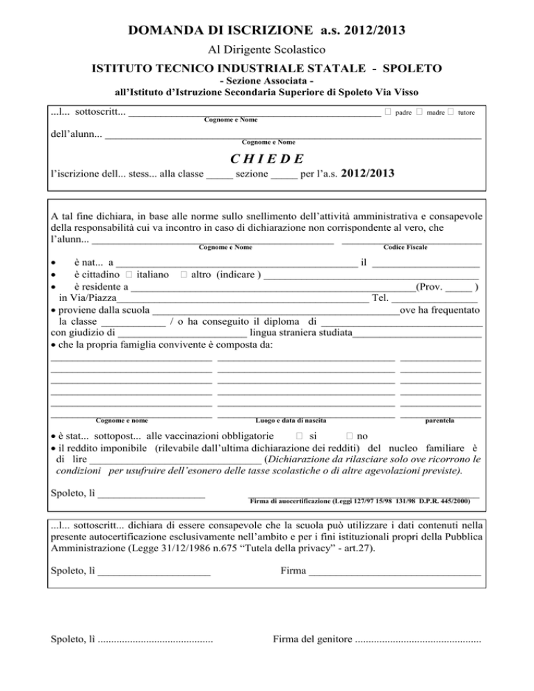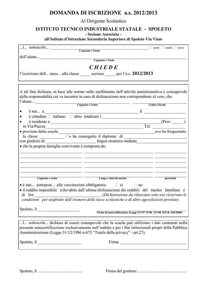 DOMANDA DI ISCRIZIONE a.s. 2012/2013 Al Dirigente Scolastico ISTITUTO TECNICO INDUSTRIALE STATALE - SPOLETO - Sezione Associata all’Istituto d’Istruzione Secondaria Superiore di Spoleto Via Visso ...l... sottoscritt... _______________________________________________ padre madre tutore Cognome e Nome dell’alunn... ______________________________________________________________________ Cognome e Nome CHIEDE l’iscrizione dell... stess... alla classe _____ sezione _____ per l’a.s. 2012/2013 A tal fine dichiara, in base alle norme sullo snellimento dell’attività amministrativa e consapevole della responsabilità cui va incontro in caso di dichiarazione non corrispondente al vero, che l’alunn... _____________________________________________ __________________________ Cognome e Nome Codice Fiscale è nat... a _____________________________________________ il ____________________ è cittadino italiano altro (indicare ) ________________________________________ è residente a _____________________________________________________(Prov. _____ ) in Via/Piazza_______________________________________________ Tel. ________________ proviene dalla scuola ______________________________________________ove ha frequentato la classe ____________ / o ha conseguito il diploma di ______________________________ con giudizio di ________________________ lingua straniera studiata________________________ che la propria famiglia convivente è composta da: ______________________________ _________________________________ _______________ ______________________________ _________________________________ _______________ ______________________________ _________________________________ _______________ ______________________________ _________________________________ _______________ ______________________________ _________________________________ _______________ ______________________________ _________________________________ _______________ Cognome e nome Luogo e data di nascita parentela è stat... sottopost... alle vaccinazioni obbligatorie si no il reddito imponibile (rilevabile dall’ultima dichiarazione dei redditi) del nucleo familiare è di lire ________________________________ (Dichiarazione da rilasciare solo ove ricorrono le condizioni per usufruire dell’esonero delle tasse scolastiche o di altre agevolazioni previste). Spoleto, lì ____________________ ___________________________________________ Firma di auocertificazione (Leggi 127/97 15/98 131/98 D.P.R. 445/2000) ...l... sottoscritt... dichiara di essere consapevole che la scuola può utilizzare i dati contenuti nella presente autocertificazione esclusivamente nell’ambito e per i fini istituzionali propri della Pubblica Amministrazione (Legge 31/12/1986 n.675 “Tutela della privacy” - art.27). Spoleto, lì _____________________ Firma ________________________________ Spoleto, lì ........................................... Firma del genitore ............................................... Sezione riservata per l’esercizio del diritto di scegliere se avvalersi o non avvalersi dell’insegnamento della religione cattolica per l’anno scolastico 2011/2012 ALUNNO Premesso che lo Stato assicura l’insegnamento della religione cattolica nelle scuole di ogni ordine e grado in conformità all’accordo che apporta modifiche al Concordato Lateranense (art.9.2) il presente modulo costituisce richiesta dell’autorità scolastica in ordine all’esercizio del diritto di scegliere se avvalersi o non avvalersi dell’insegnamento della religione cattolica. La scelta operata all’atto dell’iscrizione ha effetto per l’intero anno scolastico cui si riferisce e per i successivi anni di corso nei casi in cui sia prevista l’iscrizione d’ufficio, compresi quindi gli istituti comprensivi, fermo restando, anche nella modalità di applicazione, il diritto di scegliere ogni anno se avvalersi o non avvalersi dell’insegnamento della religione cattolica. Scelta di avvalersi dell’insegnamento della religione cattolica Scelta di non avvalersi dell’insegnamento della religione cattolica Firma del genitore _______________________ Firma dell’alunno __________________________ Art. 9 n..2 dell’Accordo, con protocollo addizionale, tra la Repubblica Italiana e la Santa Sede firmato il 18 febbraio 1894, ratificato con la legge 25 marzo 1985, n.121, che apporta modificazioni al Concordato Lateranense dell’11 febbraio 1929: “La Repubblica Italiana, riconoscendo il valore della cultura religiosa e tenendo conto che i principi del cattolicesimo fanno parte del patrimonio storico del popolo italiano, continuerà ad assicurare, nel quadro della finalità della scuola l’insegnamento della religione cattolica nelle scuole pubbliche non universitarie di ogni ordine e grado. Nel rispetto della libertà di coscienza e della responsabilità educativa dei genitori, è garantito a ciascuno il diritto di scegliere se avvalersi o non avvalersi di detto insegnamento. All’atto dell’iscrizione gli studenti o i loro genitori eserciteranno tale diritto, su richiesta dell’autorità scolastica, senza che la loro scelta possa dar luogo ad alcuna forma di discriminazione”. Sezione riservata per le scelte degli alunni che non si avvalgono dell’insegnamento della religione cattolica per l’anno scolastico 2011/2012 ALUNNO a) b) c) d) Attività didattiche e formative Attività di studio e/o ricerche individuali assistite Libera attività di studio e/o ricerca Uscita dalla scuola Firma del genitore __________________________Firma dell’alunno ________________________ Comunicazione assenze Si fa presente che le assenze verranno comunicate alle famiglie tramite SMS. Al momento della conferma dell’iscrizione dovrà essere depositato in segreteria il numero di cellulare e la ricevuta di versamento di Euro 6,00 per contributo spese. Firma del genitore __________________________ Sezione riservata per la scelta dell’indirizzo ..l... sottoscritt..., inoltre, sulla base delle