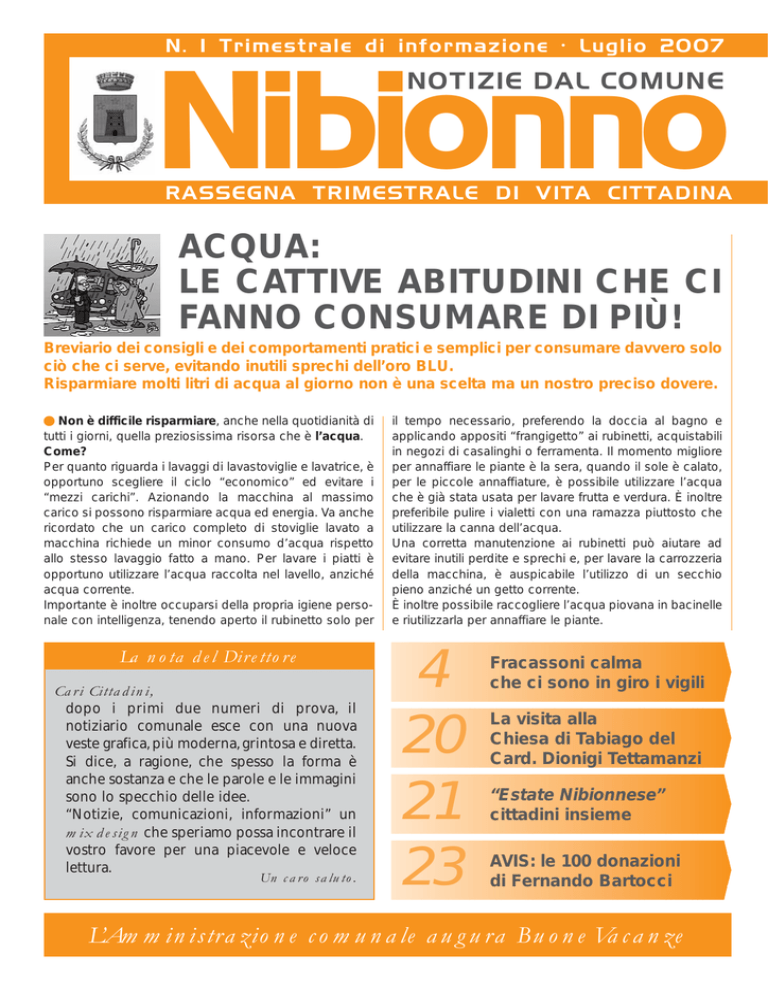 N. 1 Trimestrale di informazione · Luglio 2007 Nibionno NOTIZIE DAL COMUNE RASSEGNA TRIMESTRALE DI VITA CITTADINA ACQUA: LE CATTIVE ABITUDINI CHE CI FANNO CONSUMARE DI PIÙ! Breviario dei consigli e dei comportamenti pratici e semplici per consumare davvero solo ciò che ci serve, evitando inutili sprechi dell’oro BLU. Risparmiare molti litri di acqua al giorno non è una scelta ma un nostro preciso dovere. Non è difficile risparmiare, anche nella quotidianità di tutti i giorni, quella preziosissima risorsa che è l’acqua. Come? Per quanto riguarda i lavaggi di lavastoviglie e lavatrice, è opportuno scegliere il ciclo “economico” ed evitare i “mezzi carichi”. Azionando la macchina al massimo carico si possono risparmiare acqua ed energia. Va anche ricordato che un carico completo di stoviglie lavato a macchina richiede un minor consumo d’acqua rispetto allo stesso lavaggio fatto a mano. Per lavare i piatti è opportuno utilizzare l’acqua raccolta nel lavello, anziché acqua corrente. Importante è inoltre occuparsi della propria igiene personale con intelligenza, tenendo aperto il rubinetto solo per La nota del Direttore Cari Cittadini, dopo i primi due numeri di prova, il notiziario comunale esce con una nuova veste grafica, più moderna, grintosa e diretta. Si dice, a ragione, che spesso la forma è anche sostanza e che le parole e le immagini sono lo specchio delle idee. “Notizie, comunicazioni, informazioni” un mix design che speriamo possa incontrare il vostro favore per una piacevole e veloce lettura. Un caro saluto. il tempo necessario, preferendo la doccia al bagno e applicando appositi “frangigetto” ai rubinetti, acquistabili in negozi di casalinghi o ferramenta. Il momento migliore per annaffiare le piante è la sera, quando il sole è calato, per le piccole annaffiature, è possibile utilizzare l’acqua che è già stata usata per lavare frutta e verdura. È inoltre preferibile pulire i vialetti con una ramazza piuttosto che utilizzare la canna dell’acqua. Una corretta manutenzione ai rubinetti può aiutare ad evitare inutili perdite e sprechi e, per lavare la carrozzeria della macchina, è auspicabile l’utilizzo di un secchio pieno anziché un getto corrente. È inoltre possibile raccogliere l’acqua piovana in bacinelle e riutilizzarla per annaffiare le piante. 4 20 21 23 Fracassoni calma che ci sono in giro i vigili La visita alla Chiesa di Tabiago del Card. Dionigi Tettamanzi “Estate Nibionnese” cittadini insieme AVIS: le 100 donazioni di Fernando Bartocci L’Amministrazione comunale augura Buone Vacanze Nibionno NOTIZIE DAL COMUNE Acqua www.comune.nibionno.lc.it LE INIZIATIVE DEL COMUNE PER SENSIBILIZZARE I CITTADINI Questa, forse più di quelle passate, sarà un’estate dove più che mai bisognerà prestare attenzione al consumo e all’utilizzo dell’acqua potabile. L’Amministrazione comunale di Nibionno vuole essere particolarmente sensibile al tema della crisi idrica e ha pertanto deciso di organizzare una serie di iniziative e di prendere diversi provvedimenti per stimolare la popolazione e cercare, nella quotidianità della vita del paese, di risparmiare, ove possibile, questa importantissima risorsa. Le piogge di maggio/giugno ci hanno forse aiutato ma non dobbiamo illuderci più di tanto ed infatti il risparmio di acqua durante il periodo estivo è indispensabile. Anche Nibionno ha aderito, lo scorso 22 marzo, alla Giornata Mondiale dell’Acqua; un’iniziativa promossa dalle Nazioni Unite fin dal 1993 e il cui tema, quest’anno, era proprio: “Fronteggiare la scarsità d’acqua”. Se per noi il problema dello scorretto utilizzo dell’acqua è infatti di grande importanza, per moltissimi paesi al mondo la scarsità d’acqua rappresenta addirittura la causa della decimazione della popolazione. Appare pertanto necessario intraprendere un cammino volto ad assicurare una gestione sostenibile delle ormai scarse risorse idriche. Proprio per incamminarsi lungo questo difficile ma necessario percorso, l’amministrazione comunale di Nibionno ha deciso di mettere in atto una serie di iniziative. Innanzitutto verranno distribuiti dei “riduttori di flusso” da applicare alle docce di casa per consumare meno acqua a parità di getto, verrà inoltre distribuito un opuscolo nel quale si spiega come risparmiare acqua e, all’occorrenza, il sindaco emetterà un’ordinanza per fronteggiare la carenza idrica. Sempre inerente al tema del risparmio di acqua, l’amministrazione ha organizzato lo scorso 12 maggio, lo spettacolo teatrale “H2Oro” presso il Teatro don Olimpio Moneta di Tabiago. È inoltre presente un focus sul tema della crisi idrica sul sito del comune: www.comune.nibionno.lc.it Recenti dati dicono che il 18% della popolazione mondiale non ha accesso ad acqua potabile e non può di conseguenza contare sui basilari impianti sanitari. Ogni giorno circa 6000 persone muoiono per cause legate all’acqua, dalla sua assenza alla sua carenza di igiene. Perfino in Italia la mancanza d’acqua rappresenta spesso un problema. Nel dicembre del 2006 in Italia erano caduti in media 8,4 mm di pioggia; l’86% in meno rispetto allo stesso mese dell’anno precedente. Siamo pertanto tenuti a risparmiare, ove possibile, l’acqua delle nostre case e cercare di fare un piccolo passo per arginare quello che sembra sia ormai diventato un problema più vicino di quanto potessimo pensare. DETRAZIONE DI IMPOSTA PER LA SOSTITUZIONE DI FRIGORIFERI E CONGELATORI La legge finanziaria 2007 ha introdotto una nuova detrazione all’IRPEF, limitata al periodo di imposta 2007, per chi sostituisce FRIGORIFERI E CONGELATORI CON APPARECCHI DI CLASSE ENERGETICA NON INFERIORE AD A+. Così come previsto dalla circolare n. 24/E del 27.04.2007 dell’Agenzia delle Entrate, per il riconoscimento della detrazione il contribuente deve essere in possesso di: · fattura o scontrino attestante l’acquisto dell’apparecchio · apposita autodichiarazione. P