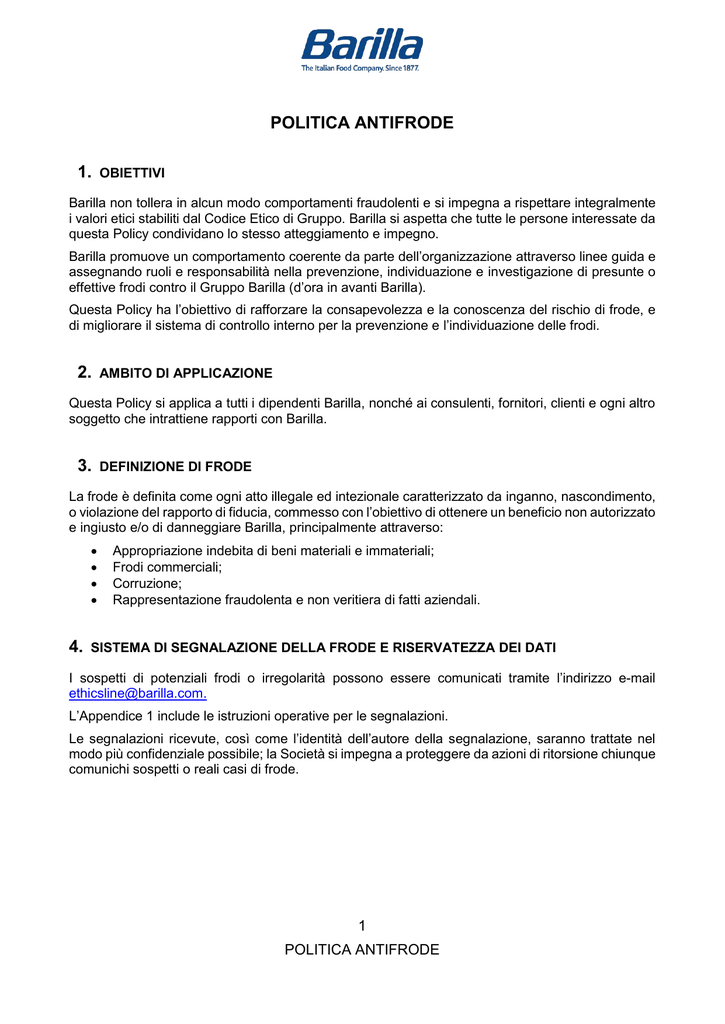 POLITICA ANTIFRODE 1. OBIETTIVI Barilla non tollera in alcun modo comportamenti fraudolenti e si impegna a rispettare integralmente i valori etici stabiliti dal Codice Etico di Gruppo. Barilla si aspetta che tutte le persone interessate da questa Policy condividano lo stesso atteggiamento e impegno. Barilla promuove un comportamento coerente da parte dell’organizzazione attraverso linee guida e assegnando ruoli e responsabilità nella prevenzione, individuazione e investigazione di presunte o effettive frodi contro il Gruppo Barilla (d’ora in avanti Barilla). Questa Policy ha l’obiettivo di rafforzare la consapevolezza e la conoscenza del rischio di frode, e di migliorare il sistema di controllo interno per la prevenzione e l’individuazione delle frodi. 2. AMBITO DI APPLICAZIONE Questa Policy si applica a tutti i dipendenti Barilla, nonché ai consulenti, fornitori, clienti e ogni altro soggetto che intrattiene rapporti con Barilla. 3. DEFINIZIONE DI FRODE La frode è definita come ogni atto illegale ed intezionale caratterizzato da inganno, nascondimento, o violazione del rapporto di fiducia, commesso con l’obiettivo di ottenere un beneficio non autorizzato e ingiusto e/o di danneggiare Barilla, principalmente attraverso: 4. Appropriazione indebita di beni materiali e immateriali; Frodi commerciali; Corruzione; Rappresentazione fraudolenta e non veritiera di fatti aziendali. SISTEMA DI SEGNALAZIONE DELLA FRODE E RISERVATEZZA DEI DATI I sospetti di potenziali frodi o irregolarità possono essere comunicati tramite l’indirizzo e-mail [email protected]. L’Appendice 1 include le istruzioni operative per le segnalazioni. Le segnalazioni ricevute, così come l’identità dell’autore della segnalazione, saranno trattate nel modo più confidenziale possibile; la Società si impegna a proteggere da azioni di ritorsione chiunque comunichi sospetti o reali casi di frode. 1 POLITICA ANTIFRODE 5. APPENDICE 1 – ISTRUZIONE PER LA SEGNALAZIONE DELLE FRODI Segnalazioni su potenziali frodi e irregolarità devono essere riportate utilizzando l’indirizzo di posta elettronica a questo scopo riservato e strettamente confidenziale [email protected]. Nel riportare la segnalazione occorre attenersi alle le seguenti indicazioni: 1. Lingua: la comunicazione può essere fatta nella lingua madre della persona che effettua la segnalazione. 2. Contenuto: la segnalazione dovrebbe includere come minimo se possibile, informazioni su: Descrizone del fatto; Persona/e coinvolta/e; Valore della transazione irregolare / fraudolenta, se conosciuto. 3. Condotta: La segnalazione deve essere effettuata in buona fede. 6. APPENDICE 2 – GLOSSARIO Approprazione indebita di beni aziendali: L’appropriazione indebita è il furto di beni aziendali, materiali e immateriali. Può essere compiuta con diverse modalità, e include l’appropriazione di incassi, il furto di beni o denaro aziendali, o facendo pagare la società per beni o servizi non ricevuti. Esempi di appropriazione indebita sono: Furto, distruzione, rimozione, sottrazione, uso improprio e/o a fini personali di denaro, dati, materiali, attrezzature o altri beni aziendali. Divulgazione di informazioni riservate e/o proprietarie a terzi. Frodi commerciali: Esempi di frodi commerciali sono: contraffazione, frodi relative alla qualità dei prodotti e frodi contro il consumatore. Sono azioni svolte con intenzionalità e inganno al fine di manomettere e alterare i prodotti, contraffare marchi e diritti proprietari di opere dell’ingegno e d’autore, rappresentare in modo non veritiero la qualità dei prodotti, così come al fine di minacciare la salute dei consumatori e danneggiare i marchi e la reputazione di Barilla. Corruzione: offrire, dare, ricevere o sollecitare la ricezione o la offerta di beni di valore (denaro, omaggi, o altri vantaggi con un controvalore monetario superiore al limite definito dal Codice Etico e dalle politiche aziendali sulla ricezione e offerta di omaggi e spese di rappresentanza) al fine di influenzare l’azione di un pubblico ufficiale, o di un privato che operi a qualsiasi livello di un’organizzazione privata, ottenendo un vantaggio ingiusto e non giustificato; incoraggiare investimenti di Barilla in affari dove i dipendenti della società hanno interessi economici e/o familiari (c.d. conflitto di interessi). Dipendente: ogni persona che lavora a tempo pieno o parziale, in base ad un contratto di lavoro a tempo indeterminato o determinato, per fornire a Barilla un servizio continuativo in cambio di una retribuzione. 2 POLITICA ANTIFRODE Frode: Può essere definita come: Ogni atto intenzionale od omissione, finalizzato ad ingannare e con l’effetto di causare una perdita a danno di chi ha subito tale atto od omissione, e/o un guadagno a favore di chi lo ha commesso1. e/o Ogni atto illegale caratterizzato da inganno, nascondimento, o violazione di un rapporto di fiducia. Questi atti non sono necessariamente compiuti con l’utilizzo di violenza o forza fisica. Le frodi sono commesse da persone, entità ed organizzazioni al fine di ottenere denaro, proprietà di beni, o servizi; di evitare il pagamento o la perdita dei servizi, e/o di assicurarsi un vantaggio personale o economico2. Rappresentazione fraudolenta e non veritiera di fatti aziendali: 1. Falso in bilancio: false ed intenzionali dichiarazioni od omissioni di ammontari nei prospetti di bilancio, al fine di truffare i destinatari dello stesso, quando ciò comporti una rappresentazione degli aspetti materiali del bilancio stesso, non in linea con i principi contabili generalmente accettati (GAAP). Questa attività fraudolenta può essere realizzata attraverso: Manipolazione, falsificazione o alterazione di registrazioni contabili o dei documenti di supporto, su cui si basa la preparazione del bilancio; Rappresentazione non veritiera e corretta, o omissione intenzionale nei prospetti di bilancio di eventi, transazioni o altre informazioni rilevanti; Intenzionale imp