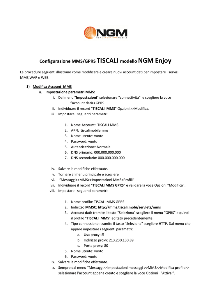 Configurazione MMS/GPRS TISCALI modello NGM Enjoy