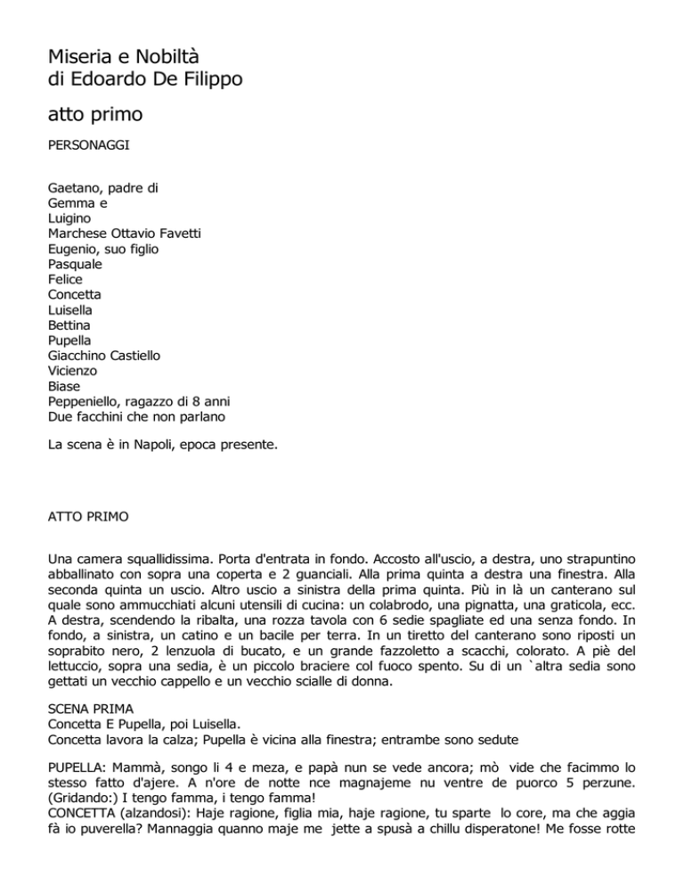 Miseria e Nobiltà di Edoardo De Filippo atto primo PERSONAGGI Gaetano, padre di Gemma e Luigino Marchese Ottavio Favetti Eugenio, suo figlio Pasquale Felice Concetta Luisella Bettina Pupella Giacchino Castiello Vicienzo Biase Peppeniello, ragazzo di 8 anni Due facchini che non parlano La scena è in Napoli, epoca presente. ATTO PRIMO Una camera squallidissima. Porta d'entrata in fondo. Accosto all'uscio, a destra, uno strapuntino abballinato con sopra una coperta e 2 guanciali. Alla prima quinta a destra una finestra. Alla seconda quinta un uscio. Altro uscio a sinistra della prima quinta. Più in là un canterano sul quale sono ammucchiati alcuni utensili di cucina: un colabrodo, una pignatta, una graticola, ecc. A destra, scendendo la ribalta, una rozza tavola con 6 sedie spagliate ed una senza fondo. In fondo, a sinistra, un catino e un bacile per terra. In un tiretto del canterano sono riposti un soprabito nero, 2 lenzuola di bucato, e un grande fazzoletto a scacchi, colorato. A piè del lettuccio, sopra una sedia, è un piccolo braciere col fuoco spento. Su di un `altra sedia sono gettati un vecchio cappello e un vecchio scialle di donna. SCENA PRIMA Concetta E Pupella, poi Luisella. Concetta lavora la calza; Pupella è vicina alla finestra; entrambe sono sedute PUPELLA: Mammà, songo li 4 e meza, e papà nun se vede ancora; mò vide che facimmo lo stesso fatto d'ajere. A n'ore de notte nce magnajeme nu ventre de puorco 5 perzune. (Gridando:) I tengo famma, i tengo famma! CONCETTA (alzandosi): Haje ragione, figlia mia, haje ragione, tu sparte lo core, ma che aggia fà io puverella? Mannaggia quanno maje me jette a spusà a chillu disperatone! Me fosse rotte li gamme quanno jette ncoppa a lo Municipio! Da che m'aggio spusato a isso, sto passanno nu sacco de guaje! Mò nce ha cumbinato chist'auto piat tino. Steveme sule a casa, e chellu poco che tenevemo, nce lo sparteveme a magnà nuje sule, puteveme sfucà na chiacchiera senza che nisciuno nce senteva; a maggio truvaje sti 2 cammere e se vulette aunì cu chill'auto disperatone de D Felice, ma stasera la faccio fernuta, vi! PUPELLA: Oh! Po' sà che ve dico, mammà, avisate a mugliera de D. Felice che nun me ncuitasse. CONCETTA: Chi mugliera? PUPELLA: Comme chi mugliera? D.a Luisella! CONCETTA: Ah! già, mugliera! (Chella è la nnammurata). Pecché, che è stato? PUPELLA: Ajssera io steva affacciata a la fenesta, aspettanno quanno passava chillo giuvinotto che va pazzo pe me, tutto nzieme venette essa e se mettette alluccà dicenno che nun steva bene a fà ammore da coppa la fenesta. CONCETTA: Uh! Teh, teh, ha fatto scrupolo D. Luisella! E chello che fà essa sta bene? E tu pò sì figlia a me, haje da dà cunto sula a me dinto a sta casa e a nisciuno chiù! (Luisella esce.) Vuje vedite addò nce steva aspettato stu guaio! LUISELLA: Mò avite ditto buono D. Concè, overo che avimmo passato lo guaio, e me parene mill'anne che passene sti 4 mise... Ne voglio fà miglia! Mamma mia, e che gente disperate e superbe! CONCETTA: Nuie si vulimmo essere superbe, nun avimma dà cunto a nisciuno! Pe riguardo po' a disperazione, vuje nun putite parlà... PUPELLA: Sempe cchiù disperate de nuie state! LUISELLA: Eh, avete ragione, che v'aggia dicere, me l'aggia pighà sulamente cu chillu sfureato che m'ha miso a chesto, ma va trova quà iuomo de chisto, femesce malamente dinto a sta casa! CONCETTA: Guè! D. Luisè, tu senza che faje la guappa, fernesce malamente, e nun fernesce malamente, nuie nun simme fatte gente de mieze a la strata, che ghiammo truvanno de fà chiasso Zitto zitto, te piglie la robiecila toia e te ne vaie, sà! LUISELLA: Me piglio la rrubicella e me ne vaco? D.a Concè, io credo che staie Cu li pazzielle neapo! Ve ne iate vuie ma no nuie. PUPELLA: Ve ne jate vuie, pecché papà facette l'affitto, isso firmaie. LUISELLA: Neh? E lo patrone de casa pecché nce la dette? Pecché Feliciello facette lo garante... chillo piezzo de stupito! Intanto mò lo patrone de casa avanza 5 mesate, voglio vedé chi li caccia sti denari, ha da pensà primma me spignà li pigne, e specialmente l'aniello cu li turchine che me lo impignaje pe ve fà magnà. CONCETTA: E io lo sapevo che a chesto avevama ascì! L'aniello cu li turchine!... Comme avesse ditto stu grand'oggetto, n'anelluccio tutto strutto, nun saccio quanto pesaje, chillo povero mpignatore pe me da 5 lire, nce vulette la mano de lo Cielo! LUISELLA: E che vulite? Io chill'oggetto teneva, a la fine na sarta era, e chellu ppoco d'oro me lo facevo cu la fatica... Si avesse fatto ammore io pure cu nu signurino... (Marcato.) PUPELLA: Mammà, l'have cu mico? CONCETTA: (Ma tiene mente! Chesta comme vò ncuità la gente!) Guè, D. Luisè, si figliema fà ammore cu nu signurino, nce fà ammore onestamente, e tu nun sì degna de parlà de sta guagliona, sà, pecché li fatte tuoie se sanno. LUISELLA: D. Concè, i fatte miei so' chiari, e parla comme haje da parlà, si nò te rompo la capa! CONCETTA: A me me rumpe la capa? Vattenne, zantraglia! LUISELLA: Ufi! Vi chi parla! Ma che, te sì scurdata che fratete è solachianiello? PUPELLA: Uh! zi-zio è solachianiello, neh, mammà? CONCETTA: Nun la dà udienza, figlia mia, chillo fà li scarpe de raso a tutte li ballerine de S Carlo, e quanno s'annommena Masto Mmalora, nun se passa cchiù nnanzc. LUISELLA: Oh, chesto è overo, chillo fà buon'affare cu li ballerine... CONCETTA: Luisè, statte zitta, sino ogge te tiro tutte li capille dacapa. LUISELLA: Tu a chi tire i capille, a chi? (Gridando.) CONCETTA: A te, a te! (Gridando.) PUPELLA: A te! Sì, a te! (Gridando. Di dentro suona il campanello.) CONCETTA: Io chiacchiere nun ne faccio, me piace de fà i fatte! LUISELLA: E io pure, D. Concè, perciò, pe tutto dimane, vedimmo da nce spartere, si no succede brutto! (Pausa. Di dentro suona di nuovo il campanello.) PUPELLA: Mammà, la porta! (Tutto e tre seggono.) (Chisto po' essere che è D. Felice, non le voglio arapì). (Alla madre.) CONCETTA: (E io manco 
