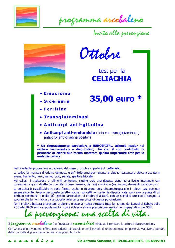programma arcobaleno Invito alla prevenzione Ottobre test per la CELIACHIA • Emocromo 35,00 euro * • Sideremia • Ferritina • Transglutaminasi • Anticorpi anti-gliadina • Anticorpi anti-endomisio (solo con transglutaminasi / anticorpi anti-gliadina positivi) * Un ringraziamento particolare a EUROSPITAL, azienda leader nel settore farmaceutico e diagnostico, che con il suo contributo ci permette di offrire alla tariffa mostrata questo importante test per la malattia celiaca. Nell’offerta del programma arcobaleno del mese di ottobre si parlerà di celiachia. La celiachia, malattia di origine genetica, è un’intolleranza permanente al glutine, sostanza proteica presente in avena, frumento, farro, kamut, orzo, segale, spelta e triticale. Nei celiaci l’introduzione di alimenti contenenti glutine crea una risposta abnorme a livello intestinale con conseguenze gravi, dirette (es. perdita di peso, anemia, diarrea) e indirette (es. linfomi, dermatiti, osteoporosi). La celiachia è classificabile in varie forme, anche in funzione della sintomatologia che in alcuni casi può non essere evidente. Proprio per queste caratteristiche i soggetti con celiachia diagnosticata sono solo la punta di un icerberg sommerso e molto più esteso; l’arcobaleno di ottobre ti aiuterà, con un semplice prelievo di sangue, a scoprire che tu non faccia parte proprio della parte nascosta di questa popolazione. Per il prelievo basterà presentarsi a digiuno presso la nostra struttura tutte le mattine dal Lunedì al Sabato dalle 7.30 alle 10.00 senza appuntamento. Non è richiesta alcuna prescrizione medica né l’impegnativa del SSN. La prevenzione: una scelta di vita. Il programma arcobaleno è un’iniziativa di neomedica mirata ad incentivare la cultura della prevenzione. Con Arcobaleno ti verranno offerte con cadenza bimestrale e per il periodo di un intero mese proposte via via diverse per fare della tua scelta di prevenzione un vero e proprio stile di vita. n e o m e d i c a Via Antonio Salandra, 6 Tel.06.4883015, 06.4885183