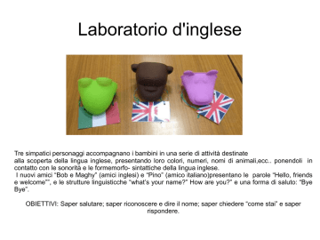 Laboratorio d'inglese Tre simpatici personaggi accompagnano i bambini in una serie di attività destinate alla scoperta della lingua inglese, presentando loro colori, numeri, nomi di animali,ecc.. ponendoli in contatto con le sonorità e le formemorfo- sintattiche della lingua inglese. I nuovi amici “Bob e Maghy” (amici inglesi) e “Pino” (amico italiano)presentano le parole “Hello, friends e welcome””, e le strutture linguisticche “what’s your name?” How are you?” e una forma di saluto: “Bye Bye”. OBIETTIVI: Saper salutare; saper riconoscere e dire il nome; saper chiedere “come stai” e saper rispondere. Laboratorio d'Inglese Giocare con i colori Le palette palloncino e le flash – card dei colori offrono divertenti spunti per diversi giochi di ascolto, riconoscimento e denominazione dei colori Obiettivo: conoscere e ripetere i nomi dei colori. Laboratorio d'Inglese alla scoperta dei numeri Oggetti, situazioni e numeri si esprimono con suoni diversi, ma il loro uso e significato non è differente da quello usato nella lingua madre. Il modo più semplice per imparare i numeri è quello di giocarci: per contare, ma anche per scoprire un gioco antico: IL GIOCO DELLA CAMPANA Obiettivo: conoscere e ripetere i numeri. Laboratorio d'Inglese I giocattoli … E altri giochi ancora ... Presentazione dei giocattoli attraverso giochi: “il gioco del giocattolaio” e “ il gioco con la benda” Obiettivo: identificare e denominare i giocattoli Laboratorio d'Inglese Gli animali I nostri amici animali suscitano nei bambini curiosità e tenerezza Presentazione degli animali della fattoria con animaletti- puppetts e attività con flashcards degli animali. Obiettivo:Saper riconoscere e denominare gli animali della fattoria Laboratorio d'Inglese Gli animali Domino degli animali. Cartellone “the farm” Obiettivo: saper riconoscere gli animali della fattoria . Laboratorio d'Inglese giochi per ricapitolare Il gioco dell'oca Obiettivo:Saper denominare in maniera corretta i numeri, i nomi degli animali e dei giocattoli Laboratorio d'Inglese Il nostro corpo Obiettivo: Saper nominare le parti del corpo.
