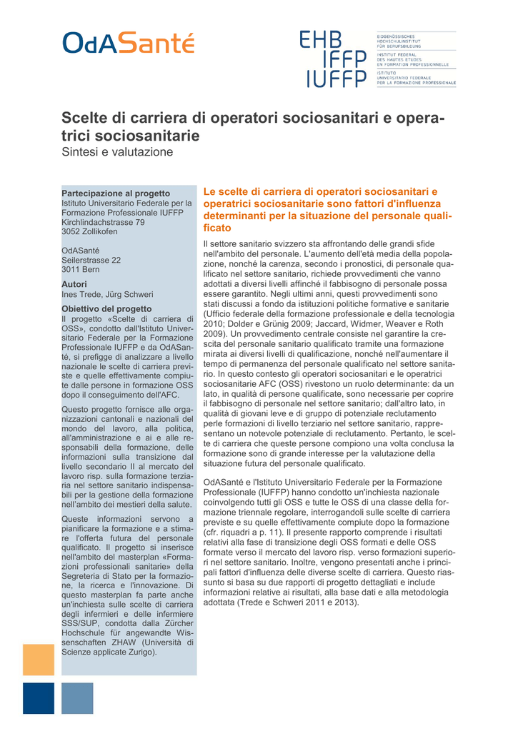 Scelte di carriera di operatori sociosanitari e operatrici sociosanitarie Sintesi e valutazione Partecipazione al progetto Istituto Universitario Federale per la Formazione Professionale IUFFP Kirchlindachstrasse 79 3052 Zollikofen OdASanté Seilerstrasse 22 3011 Bern Autori Ines Trede, Jürg Schweri Obiettivo del progetto Il progetto «Scelte di carriera di OSS», condotto dall'Istituto Universitario Federale per la Formazione Professionale IUFFP e da OdASanté, si prefigge di analizzare a livello nazionale le scelte di carriera previste e quelle effettivamente compiute dalle persone in formazione OSS dopo il conseguimento dell'AFC. Questo progetto fornisce alle organizzazioni cantonali e nazionali del mondo del lavoro, alla politica, all'amministrazione e ai e alle responsabili della formazione, delle informazioni sulla transizione dal livello secondario II al mercato del lavoro risp. sulla formazione terziaria nel settore sanitario indispensabili per la gestione della formazione nell’ambito dei mestieri della salute. Queste informazioni servono a pianificare la formazione e a stimare l'offerta futura del personale qualificato. Il progetto si inserisce nell'ambito del masterplan «Formazioni professionali sanitarie» della Segreteria di Stato per la formazione, la ricerca e l'innovazione. Di questo masterplan fa parte anche un'inchiesta sulle scelte di carriera degli infermieri e delle infermiere SSS/SUP, condotta dalla Zürcher Hochschule für angewandte Wissenschaften ZHAW (Università di Scienze applicate Zurigo). Le scelte di carriera di operatori sociosanitari e operatrici sociosanitarie sono fattori d'influenza determinanti per la situazione del personale qualificato Il settore sanitario svizzero sta affrontando delle grandi sfide nell'ambito del personale. L'aumento dell'età media della popolazione, nonché la carenza, secondo i pronostici, di personale qualificato nel settore sanitario, richiede provvedimenti che vanno adottati a diversi livelli affinché il fabbisogno di personale possa essere garantito. Negli ultimi anni, questi provvedimenti sono stati discussi a fondo da istituzioni politiche formative e sanitarie (Ufficio federale della formazione professionale e della tecnologia 2010; Dolder e Grünig 2009; Jaccard, Widmer, Weaver e Roth 2009). Un provvedimento centrale consiste nel garantire la crescita del personale sanitario qualificato tramite una formazione mirata ai diversi livelli di qualificazione, nonché nell'aumentare il tempo di permanenza del personale qualificato nel settore sanitario. In questo contesto gli operatori sociosanitari e le operatrici sociosanitarie AFC (OSS) rivestono un ruolo determinante: da un lato, in qualità di persone qualificate, sono necessarie per coprire il fabbisogno di personale nel settore sanitario; dall'altro lato, in qualità di giovani leve e di gruppo di potenziale reclutamento perle formazioni di livello terziario nel settore sanitario, rappresentano un notevole potenziale di reclutamento. Pertanto, le scelte di carriera che queste persone compiono una volta conclusa la formazione sono di grande interesse per la valutazione della situazione futura del personale qualificato. OdASanté e l'Istituto Universitario Federale per la Formazione Professionale (IUFFP) hanno condotto un'inchiesta nazionale coinvolgendo tutti gli OSS e tutte le OSS di una classe della formazione triennale regolare, interrogandoli sulle scelte di carriera previste e su quelle effettivamente compiute dopo la formazione (cfr. riquadri a p. 11). Il presente rapporto comprende i risultati relativi alla fase di transizione degli OSS formati e delle OSS formate verso il mercato del lavoro risp. verso formazioni superiori nel settore sanitario. Inoltre, vengono presentati anche i principali fattori d'influenza delle diverse scelte di carriera. Questo riassunto si basa su due rapporti di progetto dettagliati e include informazioni relative ai risultati, alla base dati e alla metodologia adottata (Trede e Schweri 2011 e 2013). Un anno dopo la conclusione della formazione: l'80% delle persone diplomate rimane attivo nel settore sanitario, il 50% di queste persone attivo come OSS Complessivamente, a un anno dalla conclusione della formazione (quindi nell'estate 2012) l'80% di tutte le persone diplomate è attivo nel settore sanitario. La maggior parte di queste persone è attiva 1 come OSS (42%) oppure frequenta una formazione di livello terziario SSS/SUP nel settore cure (35%). La quota delle persone che frequentano una formazione di livello terziario nel settore cure ammonta al 38% in Svizzera tedesca e al 12% in Svizzera romanda (cfr. ill. 1). Una percentuale relativamente piccola (4%) frequenta una formazione sanitaria, sia di livello terziario sia di livello secondario II, che non rientra nel settore cure. Le persone che frequentano formazioni in un altro settore (3%) si inseriscono per lo più negli ambiti sociale e pedagogico. Il 10% delle persone interrogate in tutta la Svizzera frequenta una scuola di maturità professionale 2 (SMP) , sebbene risultino parecchie differenze regionali (cfr. ill. 1). Se in questa percentuale venissero incluse tutte le maturità professionali conseguite durante la formazione professionale di base, la quota della maturità professionale raggiungerebbe il 23% a livello nazionale, il 35% nei Cantoni francofoni e il 20% nei Cantoni germanofoni. In Ticino la quota relativa alla maturità professionale è pari al 42%; questa percentuale più elevata si spiega con il fatto che in Ticino una SMP è stata integrata nella formazione professionale di base quadriennale OSS. Il campo «Altre attività» (8%) è stato scelto soprattutto in relazione ad attività transitorie quali i soggiorni all'estero, i soggiorni linguistici e la scuola reclute, oppure in relazione a indicazioni non chiare, ecc. Illustrazione 1: scelte di carriera compiute nelle diverse regioni; un anno dopo la conclusione della formazione OSS; dati in % con n=1068. 1 
