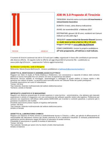 JOB IN 3.0 Proposte di Tirocinio TIPOLOGIA: tirocinio extra-curriculare di inserimento e reinserimento lavorativo DURATA: 6 mesi, salvo diversa indicazione AVVIO: da novembre2016 a febbraio 2017 DESTINATARI: giovani 18-35 anni, residenti nei Comuni indicati sul sito jobin.bg.it REQUISITI: essere esclusi da Garanzia Giovani (ovvero se: studi, lavori p.time o hai tra i 30 e i 35 anni). Maggiori dettagli su www.jobin.bg.it/tirocini COME CANDIDARSI: inviare la propria candidatura all’’ente proponente, all’indirizzo e-mail indicato. Il numero di tirocini sostenuti da Job In 3.0 sarà pari a otto, organizzati in base alle candidature pervenute alle diverse offerte. Di seguito tutte le offerte ad oggi disponibili (il presente file – pubblicato su www.jobin.bg.it/tirocini - rappresenta l’ultimo aggiornamento): Da Mestieri Lombardia , sede di Bergamo Referente: Maria Grazia Bettineschi . Inviare candidature a [email protected] ADDETTO AL MONTAGGIO E ASSEMBLAGGIO ELETTRICO Ragazzi con titolo di studio di Perito Elettrico o Elettronico, con conoscenza e capacità di lettura dello schema elettrico e buona manualità fine con almeno 2/3 anni di esperienza nel settore Mansione: tecnico addetto al montaggio, assemblaggio e cablaggio di quadri elettrici di bassa media e alta tensione con utilizzo di tester. La persona sarà coinvolta anche nel collaudo finale dei quadri predisposti. Possibile assunzione nel ruolo di collaudatore. Tempo: full time Tipo Azienda: Azienda multinazionale del settore elettromeccanico Territorio: ambito di Seriate IMPIEGATO LOGISTICO E DI MAGAZZINO Ragazzi con diploma quiquennale di scuola superiore in area tecnica – amministrativa, che abbiano già maturato esperienza in ambito di magazzino con una conoscenza dei software specifici relativi alla logistica. Preferenza per persone con esperienza nell’utilizzo della pistola BARCODE per inventari e controllo giacenze, e persone già in possesso di patentino del muletto. Possibile assunzione presso reparto di logistica dell’azienda Tempo: full time Tipo azienda: Azienda multinazionale del settore elettromeccanico Ambito di Seriate ADDETTO AL LABORATORIO CHIMICO Ragazzi con Diploma di Perito chimico e preferibilmente laurea in Chimica, o affini, per attività di affiancamento al responsabile del laboratorio chimico per analisi chimiche di olii e lubrificanti industriali. È richiesta preferibilmente esperienza (anche attraverso stage) all’interno di laboratori di analisi chimica. Possibilità di assunzione in qualità di analista di laboratorio. Tempo: full time Tipo azienda: Società per azioni che ha clienti a livello internazionale Ambito di Dalmine ADDETTO MARKETING DI PRODOTTO Ragazzi con diploma in ragioneria indirizzo marketing, o Laurea in marketing e comunicazione per attività di addetto marketing di prodotto. Attività a supporto del responsabile dell’ufficio, con richiesta di esperienza nell’utilizzo di software per la grafica, e una prima conoscenza delle indagini di mercato. Richiesta conoscenza della lingua inglese. Tirocinio solo formativo che non prevede possibilità assuntive. Tempo: full time Tipo azienda: azienda internazionale con certificazione qualità e processi ben strutturati. Ambito di Seriate *************************************************************************************** Da A.F.P. Patronato San Vincenzo – Bergamo Referente: Federica Pedrali. Inviare candidature a [email protected] COOPERATIVA SOCIALE PATRONATO SAN VINCENZO – FAB LAB BERGAMO Il candidato verrà inserito presso lo spazio di Fabbricazione Digitale gestito dalla Cooperativa presso un punto vendita di Seriate Dovrà gestire il front desk, ascoltare le esigenze dei clienti ed indirizzarli verso il professionista o il servizio adeguato. Sarà sua cura la gestione delle prenotazioni per le consulenze e per l’utilizzo assistito dei macchinari. Se possibile (dal punto di vista tecnico) potrà svolgere talvolta piccoli lavori utilizzando i macchinari (tagliatrice laser e stampante 3D). Criteri: formazione impiegatizia o laureandi in ingegneria o facoltà tecniche affini. Luogo: Seriate e Bergamo via Gavazzeni, 3 WEB AGENCY RICERCA PER UFFICIO WEB MARKETING E COPY. Requisiti Base: - Laurea in comunicazione marketing o affini (anche laureandi) ottima capacità di comprensione e di scrittura testi anche in ottica SEO. almeno conoscenza base logiche social, di comunicazione e di marketing. Si richiede disponibilità immediata Luogo: Bergamo, zona Boccaleone Orari: da lunedì a venerdì orario a giornata. Grande azienda di produzione Ufficio contabilità, paghe e simili. Criteri: diplomati in ragioneria o affini Luogo: San Paolo d’Argon (BG) Orari: da lunedì a venerdì dalle 8.30 alle 17.30 circa *************************************************************************************** Da Fondazione Ikaros -Et Labora Referente: Miriam Fumagalli, [email protected] tel. 035/225308. Inviare candidature a Ricerchiamo per nostra azienda partner con sede ad Albano Sant’Alessandro (Bg), giovane impiegato commerciale, ottima conoscenza della lingua inglese. Requisiti necessari: ottimo utilizzo del pacchetto Office, inglese commerciale fluente, competenze amministrative, buone competenze relazionali, precisione e metodicità nel lavoro. Preferenza per candidati residenti nelle zone limitrofe. L’offerta prevede un periodo di stage di 6 mesi. Verranno considerati esclusivamente i profili in possesso dei requisiti richiesti. Si prega di rispondere via mail allegando il proprio curriculum. Ricerchiamo per azienda specializzata in servizio catering con sede a Urgnano (Bg), diplomato settore alberghiero/aiuto cuoco in possesso di qualifica/diploma alberghiero, automunito, disponibile full time. Richiesta disponibilità e flessibilità oraria, gradito attestato HACCP; preferenza per candidati residenti nelle zone limitrofe. L’offerta prevede un breve periodo di prova in stage di 6 mesi e successiva assunzione diretta in azienda