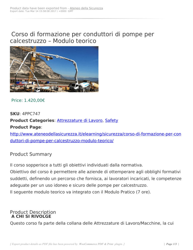 Product data have been exported from - Ateneo della Sicurezza Export date: Tue Mar 14 15:58:08 2017 / +0000 GMT Corso di formazione per conduttori di pompe per calcestruzzo – Modulo teorico Price: 1.420,00€ SKU: 4PPC747 Product Categories: Attrezzature di Lavoro, Safety Product Page: http://www.ateneodellasicurezza.it/elearning/sicurezza/corso-di-formazione-per-con duttori-di-pompe-per-calcestruzzo-modulo-teorico/ Product Summary Il corso sopperisce a tutti gli obiettivi individuati dalla normativa. Obiettivo del corso è permettere alle aziende di ottemperare agli obblighi formativi suddetti, definendo un percorso che fornisca, ai lavoratori incaricati, le competenze adeguate per un uso idoneo e sicuro delle pompe per calcestruzzo. Il seguente modulo teorico va integrato con il Modulo Pratico (7 ore). Product Description A CHI SI RIVOLGE Questo corso fa parte della collana delle Attrezzature di Lavoro/Macchine, la cui [ Export product details as PDF file has been powered by WooCommerce PDF & Print plugin. ] | Page 1/3 | Product data have been exported from - Ateneo della Sicurezza Export date: Tue Mar 14 15:58:08 2017 / +0000 GMT formazione è obbligatoria e normata dall'art. 73 del D. Lgs. 81/08 e CSR n. 53 del 22/02/2012. In particolare, questo percorso formativo è rivolto a tutti coloro che durante la normale attività lavorativa utilizzano pompe per calcestruzzo. OBIETTIVI Il corso sopperisce a tutti gli obiettivi individuati dalla normativa. Obiettivo del corso è permettere alle aziende di ottemperare agli obblighi formativi suddetti, definendo un percorso che fornisca, ai lavoratori incaricati, le competenze adeguate per un uso idoneo e sicuro delle pompe per calcestruzzo. Il seguente modulo teorico va integrato con il Modulo Pratico (7 ore). CONTENUTI MODULO GIURIDICO - NORMATIVO Presentazione del corso. Cenni di normativa generale in materia di igiene e sicurezza del lavoro con particolareriferimento ai lavori relativi ai cantieri temporanei o mobili (D.Lgs. n. 81/2008). Responsabilità dell'operatore. MODULO TECNICO Categorie di pompe: i vari tipi di pompe e descrizione delle caratteristiche generali e specifiche. Componenti strutturali:sistemi di stabilizzazione, livellamento, telaio. Dispositivi di comando e di sicurezza: individuazione dei dispositivi dicomando e loro funzionamento, individuazione dei dispositivi di sicurezza e loro funzione. Controlli da effettuare primadell'utilizzo: controlli visivi e funzionali, dei dispositivi di comando, di segnalazione e di sicurezza previsti dal costruttorenel manuale di istruzioni. Modalità di utilizzo in sicurezza e rischi: analisi e valutazione dei rischi più ricorrenti nell'utilizzodelle pompe (rischi di elettrocuzione, rischi ambientali, rischi dovuti ad urti e cadute a livello, rischio di schiacciamento,ecc.). Spostamento e traslazione, posizionamento e stabilizzazione, azionamenti e manovre, parcheggio in modo sicuroa fine lavoro. Partenza dalla centrale di betonaggio, trasporto su strada, accesso al cantiere: caratteristiche tecniche deimezzo; controlli preliminari alla partenza; modalità di salita sui mezzo; norme di comportamento sulla viabilità ordinaria;norme di comportamento nell'accesso e transito in sicurezza in cantiere; DPI da utilizzare. Norme di comportamento perle operazioni preliminari allo scarico: [ Export product details as PDF file has been powered by WooCommerce PDF & Print plugin. ] | Page 2/3 | Product data have been exported from - Ateneo della Sicurezza Export date: Tue Mar 14 15:58:08 2017 / +0000 GMT controlli su tubazioni e giunti; piazzamento e stabilizzazione del mezzo mediantestabilizzatori laterali e bolla di livello; sistemazione delle piastre ripartitrici; controllo di idoneità del sito di scaricocalcestruzzo; apertura del braccio della pompa. Norme di comportamento per lo scarico del calcestruzzo; precauzionida adottare per il pompaggio in presenza di linee elettriche, pompaggio in prossimità di vie di traffico; movimentazionedel braccio della pompa mediante radiocomando; inizio del pompaggio; pompaggio del calcestruzzo. Pulizia del mezzo:lavaggio tubazione braccio pompa, lavaggio corpo pompa. Manutenzione straordinaria della pompa: verifica delletubazioni di mandata, del sistema di pompaggio e della tramoggia. SUPERAMENTO Al termine di questo modulo teorico, come richiesto dalla normativa, è previsto un test finale che verifica l'apprendimento con domande a risposta singola e multipla riguardo l'intero contenuto del corso fruito. CERTIFICAZIONE Il corso prevede una certificazione in base alle disposizioni espresse nel Testo Unico D. Lgs. 81/2008 e rafforzate in sede di Conferenza Stato-Regioni. Product Attributes - Durata: 7 ore - Fruibilità: 6 mesi [ Export product details as PDF file has been powered by WooCommerce PDF & Print plugin. ] | Page 3/3 |