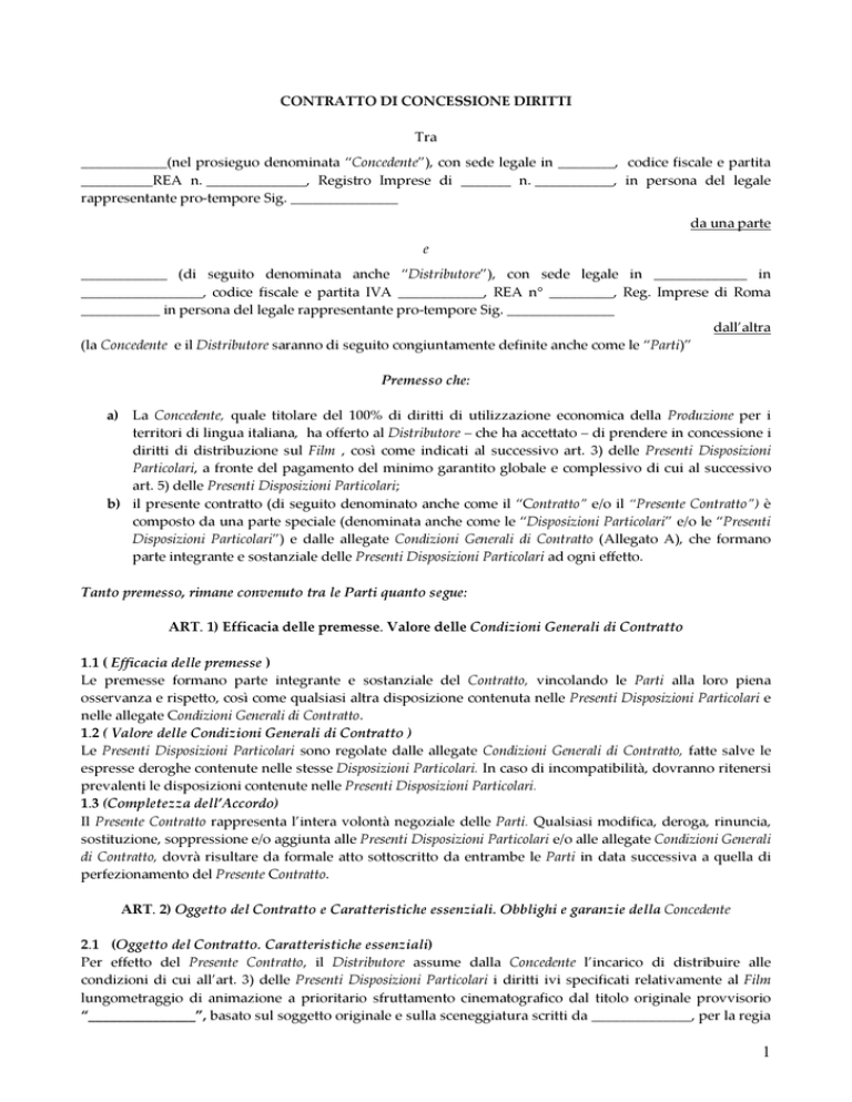 CONTRATTO DI CONCESSIONE DIRITTI Tra ____________(nel prosieguo denominata “Concedente”), con sede legale in ________, codice fiscale e partita __________REA n. ______________, Registro Imprese di _______ n. ___________, in persona del legale rappresentante pro-tempore Sig. _______________ e da una parte ____________ (di seguito denominata anche “Distributore”), con sede legale in _____________ in _________________, codice fiscale e partita IVA ____________, REA n° _________, Reg. Imprese di Roma ___________ in persona del legale rappresentante pro-tempore Sig. _______________ dall’altra (la Concedente e il Distributore saranno di seguito congiuntamente definite anche come le “Parti)” Premesso che: a) La Concedente, quale titolare del 100% di diritti di utilizzazione economica della Produzione per i territori di lingua italiana, ha offerto al Distributore – che ha accettato – di prendere in concessione i diritti di distribuzione sul Film , così come indicati al successivo art. 3) delle Presenti Disposizioni Particolari, a fronte del pagamento del minimo garantito globale e complessivo di cui al successivo art. 5) delle Presenti Disposizioni Particolari; b) il presente contratto (di seguito denominato anche come il “Contratto” e/o il “Presente Contratto”) è composto da una parte speciale (denominata anche come le “Disposizioni Particolari” e/o le “Presenti Disposizioni Particolari”) e dalle allegate Condizioni Generali di Contratto (Allegato A), che formano parte integrante e sostanziale delle Presenti Disposizioni Particolari ad ogni effetto. Tanto premesso, rimane convenuto tra le Parti quanto segue: ART. 1) Efficacia delle premesse. Valore delle Condizioni Generali di Contratto 1.1 ( Efficacia delle premesse ) Le premesse formano parte integrante e sostanziale del Contratto, vincolando le Parti alla loro piena osservanza e rispetto, così come qualsiasi altra disposizione contenuta nelle Presenti Disposizioni Particolari e nelle allegate Condizioni Generali di Contratto. 1.2 ( Valore delle Condizioni Generali di Contratto ) Le Presenti Disposizioni Particolari sono regolate dalle allegate Condizioni Generali di Contratto, fatte salve le espresse deroghe contenute nelle stesse Disposizioni Particolari. In caso di incompatibilità, dovranno ritenersi prevalenti le disposizioni contenute nelle Presenti Disposizioni Particolari. 1.3 (Completezza dell’Accordo) Il Presente Contratto rappresenta l’intera volontà negoziale delle Parti. Qualsiasi modifica, deroga, rinuncia, sostituzione, soppressione e/o aggiunta alle Presenti Disposizioni Particolari e/o alle allegate Condizioni Generali di Contratto, dovrà risultare da formale atto sottoscritto da entrambe le Parti in data successiva a quella di perfezionamento del Presente Contratto. ART. 2) Oggetto del Contratto e Caratteristiche essenziali. Obblighi e garanzie della Concedente 2.1 (Oggetto del Contratto. Caratteristiche essenziali) Per effetto del Presente Contratto, il Distributore assume dalla Concedente l’incarico di distribuire alle condizioni di cui all’art. 3) delle Presenti Disposizioni Particolari i diritti ivi specificati relativamente al Film lungometraggio di animazione a prioritario sfruttamento cinematografico dal titolo originale provvisorio “_______________”, basato sul soggetto originale e sulla sceneggiatura scritti da ______________, per la regia 1 di____________, di nazionalità italiana, in lingua italiana, per una durata di circa ____ minuti primi per il Periodo di Licenza (come definito dal successivo articolo 3.5) e per il Territorio (come definito dal successivo articolo 3.1). Le caratteristiche del Film descritte nel presente art. 2.1) devono intendersi quali elementi essenziali del Presente Contratto. Pertanto la mancanza di uno o più di tali elementi essenziali costituirà grave inadempimento da parte della Concedente, anche ai sensi di quanto previsto dall’art. 12) delle allegate Condizioni Generali di Contratto (clausola risolutiva espressa). 2.2 (Obblighi e garanzie della Concedente) La Concedente dichiara a garantisce che: - la produzione del Film inizierà il ____________ e dovrà concludersi, ivi compreso il montaggio ed il missaggio, entro e non oltre il _______________; - i materiali di cui al successivo art. 5) dovranno essere consegnati al Distributore entro e non oltre il termine, per lo stesso Distributore essenziale, del __________, per una prima uscita cinematografica prevista per il________________. - il Film verrà realizzato nel rispetto di tutto quanto previsto nel Presente Contratto. In particolare, il Film dovrà essere realizzato nel sostanziale rispetto della sceneggiatura definitiva che è stata visionata ed approvata dal Distributore, per la regia del direttore artistico sopra indicato; - il Film sarà tale da ottenere il nulla osta alla visione per tutti in Italia in sede di prima revisione. ART. 3)Mandato di distribuzione del Film 3.1 (Distribuzione cinematografica in Italia. Mandato al Distributore. Recupero Costi della distribuzione cinematografica e minimo garantito ) In virtù del Presente Contratto, la Concedente concede al Distributore, che accetta, a fronte di un Minimo Garantito pari a complessivi € __________________la distribuzione del Film in sede cinematografica (theatrical, non theatrical, public video, ecc.) e in sede audiovisiva home e commercial video in Italia, Città del Vaticano e Repubblica di San Marino e per il solo home e commercial video anche il Principato di Monaco in lingua italiana e la Svizzera in lingua italiana (il “Territorio”). La distribuzione in sede cinematografica si intende affidata al Distributore alle seguenti condizioni essenziali: a) la provvigione del Distributore sarà pari al ___% (________ per cento) del fatturato di noleggio cinematografico; b) verrà investito nella distribuzione (copie e lancio), un importo non inferiore ad Euro ________________ (___________________/00); c) verrà