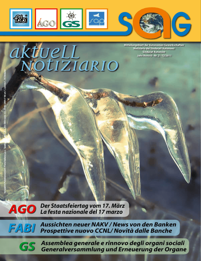 Versand im Postabonnement / Poste Italiane s.p.a. - Spedizione in A.P. -D.L. 353/2003 (conv. in L. 27/02/2004 n° 46) art. 1, comma 1, DC Bolzano aktuell Notiziario Mitteilungsblatt der Autonomen Gewerkschaften Notiziario dei Sindacati Autonomi Sindacat Autonóm Jahr/Anno 6 - Nr. 2 - 12/2011 AGO Der Staatsfeiertag vom 17. März La festa nazionale del 17 marzo FABI GS Aussichten neuer NAKV / News von den Banken Prospettive nuovo CCNL/ Novità dalle Banche Assemblea generale e rinnovo degli organi sociali Generalversammlung und Erneuerung der Organe Aktuell Notiziario Impressum Verantwortlicher Direktor Direttore Responsabile Sabine Pichler Inhalt - sommario Editorial/e Auf der Suche nach dem Gleichgewicht Chefredakteurin Capo redattore Sabine Pichler Cercando l’equilibrio ..........................................................................................................................3 Eingetragen beim Landesgericht Bozen am 07.12.1992, Nr. 29/92 R.St. Autorizzazione del Tribunale di Bolzano Nr. 29/92 R.St. del 07/12/1992 Dichiarazione unificata di reddito e patrimonio (DURP) .......................................................5 Grafik/Layout Tamara Tavella Portugal – Kulturreise 2012 / Vorschau und vorläufiges Programm..................................7 Druck/Tipografia Europrint Vahrn Bildnachweis/Immagini da www.pixelio.de www.google.com Eigentümer FABI - Autonome Bankgewerkschaft Gerbergasse 24, 39100 Bozen Proprietario FABI - Sindacato Autonomo Bancari Via Conciapelli 24, 39100 Bolzano SAG Redaktion/Redazione Robert Holzer Salvatore Lauria Giovanna Monauni Sabine Pichler Mit Namen gekennzeichnete Artikel entsprechen nicht unbedingt den Ansichten der Redaktion. Gli articoli firmati impegnano solo gli autori e ne rappresentano il pensiero. Einheitliche Einkommens- und Vermögenserklärung (EEVE) ...................................................4 AGO 17. März – Staatsfeiertag / 17 marzo – festa nazionale............................................................6 Portogallo – Viaggio culturale 2012 / Programma provvisorio . .........................................8 FABI Non ci sono banche … senza bancari ..........................................................................................9 Neue Vorgehensweise bei Ansuchen um Mutterschaft und Elternurlaub.................... 10 Nuova procedura per la richiesta del congedo di maternità e del congedo parentale..................................................................................................................... 11 News Volksbank – Banca Popolare / News Banca Popolare – Volksbank . ................... 12 Raiffeisen-aktuell: Die autonome Gewerkschaft Si.A.Di.C.C. der Führungskräfte............................................................................................................................ 13 Il sindacato autonomo Si.A.Di.C.C. per i dirigenti................................................................... 14 Novità dall’ultimo incontro in Cassa di Risparmio di Bolzano SpA.................................. 14 Neuigkeiten vom Treffen mit der Südtiroler Sparkasse AG................................................ 16 GS Care/i iscritte/i – il saluto del presidente / Liebe Mitglieder! – Grußworte des Präsidenten............................................................................................................ 18 Esito delle elezioni / Wahlergebnisse......................................................................................... 19 Rinnovo del CCI / Erneuerung des BÜKV .................................................................................. 19 Convegno – Discorso di apertura del presidente . ............................................................... 20 Tagung – Eröffnungsrede des Präsidenten.............................................................................. 21 Ethik als öffentliche Verantwortung – Vortrag von Walter A. Lorenz............................. 22 Tra l’incudine della politica e il martello della responsabilità amministrativa Relazione del dott. Robert Schülmers......................................................................................... 24 Allo stato attuale… / Zum jetzigen Zeitpunkt … ................................................................. 26 Fiskus – Neuheiten bei Renovierungsarbeiten / Fisco – Novità recupero edilizio..... 27 Assicurazione integrativa................................................................................................................ 28 Zusatzversicherung........................................................................................................................... 29 Vademecum / Alcuni numeri su cui riflettere.......................................................................... 31 Formular Beitrittserklärung / Modulo iscrizione sindacale................................................. 32 ChildFund Deutschland................................................................................................................... 33 Neuheiten Konventionen / Novità convenzioni..................................................................... 34 Titelbild/Copertina Foto www.pixelio.de 2 Stars and Stripes – VipBaby / Werbung Hotel Mon Pays..................................................... 39 Aktuell Notiziario Editorial - Editoriale Auf der Suche nach dem Gleichgewicht „Das Familienleben unserer Mitarbeiter liegt uns besonders am Herzen. Deshalb halten wir unser Geschäft am 8. Dezember geschlossen.“ Dieser Text klebte im Schaufenster und an der Eingangstür und der Inhaber dieses Geschäftes ist sicherlich einer der wenigen Vertreter seiner Kategorie, welche in der Vorweihnachtszeit ihre Verkaufsstellen, wenn sie könnten, sogar nachts noch geöffnet ließen. Aber zum Glück gibt es auch diese guten Beispiele und immer mehr Betriebe haben festgestellt, dass es sich am Ende bezahlt macht, mehr Gewicht dem Gleichgewic