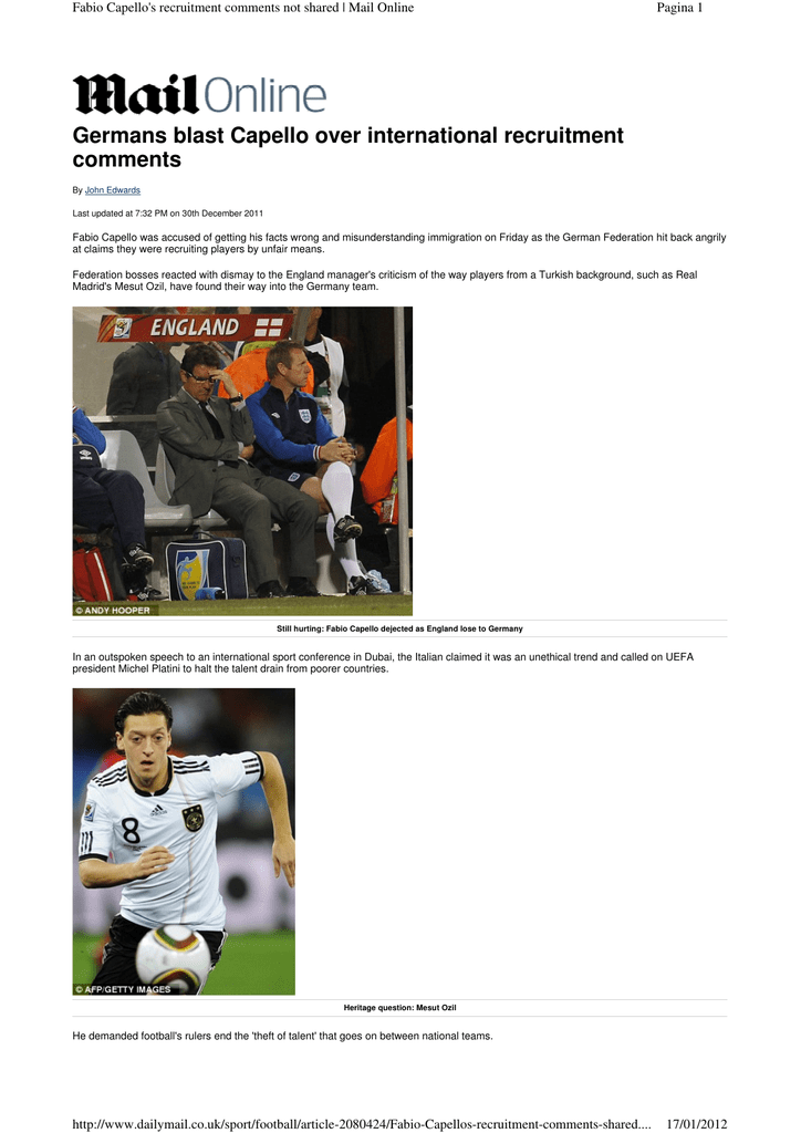 Fabio Capello's recruitment comments not shared | Mail Online Pagina 1 Germans blast Capello over international recruitment comments By John Edwards Last updated at 7:32 PM on 30th December 2011 Fabio Capello was accused of getting his facts wrong and misunderstanding immigration on Friday as the German Federation hit back angrily at claims they were recruiting players by unfair means. Federation bosses reacted with dismay to the England manager's criticism of the way players from a Turkish background, such as Real Madrid's Mesut Ozil, have found their way into the Germany team. Still hurting: Fabio Capello dejected as England lose to Germany In an outspoken speech to an international sport conference in Dubai, the Italian claimed it was an unethical trend and called on UEFA president Michel Platini to halt the talent drain from poorer countries. Heritage question: Mesut Ozil He demanded football's rulers end the 'theft of talent' that goes on between national teams. http://www.dailymail.co.uk/sport/football/article-2080424/Fabio-Capellos-recruitment-comments-shared.... 17/01/2012 Fabio Capello's recruitment comments not shared | Mail Online Pagina 2 But Federation sporting director Matthias Sammer insisted Germany were blameless and that Capello had failed to grasp how immigrants settling there deserved equal opportunities. Ozil was born in Gelsenkirchen, as a third-generation immigrant, and although his World Cup team-mates Lukas Podolski and Miroslav Klose were born in Poland, they moved to Germany as small children. 'Immigration is a social development that we react to in a proper way and I can assure Capello that we never entice players away from other countries,' said Sammer. 'That is something we would never even contemplate and I simply cannot understand what he is saying. It is the duty of sport to welcome players under these circumstances. 'When our country opens its doors to immigrants, so does the Federation and that is only right.' Published by Associated Newspapers Ltd Part of the Daily Mail, The Mail on Sunday & Metro Media Group © Associated Newspapers Ltd http://www.dailymail.co.uk/sport/football/article-2080424/Fabio-Capellos-recruitment-comments-shared.... 17/01/2012 Capello calls for action over stealing young talent | Sport | Reuters Pagina 1 Capello calls for action over stealing young talent Thu Dec 29, 2011 2:45pm GMT Fabregas returned to the Nou Camp this year for an initial fee of 29 million euros, a significantly larger sum than Arsenal paid originally to prise him away. But there have been many other examples and the Italian said the rewards being offered to young players by the richest clubs to sign with them were often too good to turn down. Full Size 1 of 1 "These clubs are offering players and their families a lot of financial support. If the family is poor and it will contribute to the family, they will be happy to move abroad," he said. Capello, 65, has vast experience of how the transfer system affects young players having coached at Real Madrid, AC Milan, AS Roma and Juventus before taking over as England manager in 2008. He is leaving the position after next year's European Championship. View article on single page Previous Page 1 | 2 Next Page © Thomson Reuters 2012 All rights reserved af.reuters.com: Help and Contact Us | Advertise With Us Thomson Reuters Corporate: Copyright | Disclaimer | Privacy Policy | Careers International Editions : Africa | Arabic | Argentina | Brazil | Canada | China | France | Germany | India | Italy | Japan | Latin America | Mexico | Russia | Spain | United Kingdom | United States Thomson Reuters is the world's largest international multimedia news agency, providing investing news, world news, business news, technology news, headline news, small business news, news alerts, personal finance, stock market, and mutual funds information available on Reuters.com, video, mobile, and interactive television platforms. Thomson Reuters journalists are subject to an Editorial Handbook which requires fair presentation and disclosure of relevant interests. http://af.reuters.com/article/sportsNews/idAFJOE7BS05920111229?pageNumber=2&virtualBrandChann... 17/01/2012 The Witness Pagina 1 Capello hits out at ‘stealing’ young players 30 Dec 2011 DUBAI — Tighter rules should be introduced by Fifa to stop European clubs from “stealing” talented young players from other countries, England manager Fabio Capello said yesterday. The Italian said the globalisation of football meant clubs were filling their youth teams with players sourced from all over the world, often to the detriment of their long-term development. “A line needs to be drawn,” Capello (65) told a football conference in Dubai. “Clubs are talentscouting all over the world and are stealing young players. Fifa should pass new rules. I’ve spoken to [Uefa president Michel] Platini and in the future clubs will be forbidden to steal players when they are very young.” Fifa does have a statute, Rule 19, banning the international transfer of players under 18, but one aspect of it allows transfers to take place if the player’s parents move to the country in which the new club is located for reasons not linked to football. A rule banning U16 transfers exists as far as European Union transfers are concerned, but this is often flouted through other exceptions. Top European clubs have long been accused of using financial muscle to harvest the best young players from abroad, with English clubs and the likes of Real Madrid and Barcelona in Spain often cited as doing so. Ironically, one of the most famous examples of the practice saw Cesc Fabregas leave Barcelona for Arsenal in 2003, at the age of 16, with the Catalan club complaining that the English club had poached him from their academy. Fabregas returned to the Nou Camp this year. But there have been many other examples and the Italian said the rewards being offered to young players by the richest clubs to sign with them