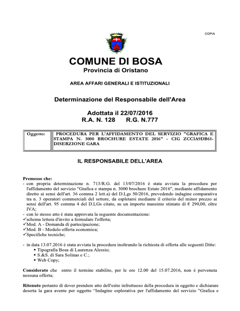 COPIA COMUNE DI BOSA Provincia di Oristano AREA AFFARI GENERALI E ISTITUZIONALI Determinazione del Responsabile dell'Area Adottata il 22/07/2016 R.A. N. 128 R.G. N.777 Oggetto: PROCEDURA PER L'AFFIDAMENTO DEL SERVIZIO "GRAFICA E STAMPA N. 3000 BROCHURE ESTATE 2016" - CIG ZCC1A9DB61DISERZIONE GARA IL RESPONSABILE DELL'AREA Premesso che: - con propria determinazione n. 713/R.G. del 13/07/2016 è stata avviata la procedura per l'affidamento del servizio "Grafica e stampa n. 3000 brochure Estate 2016", mediante affidamento diretto ai sensi dell'art. 36 comma 2 lett.a) del D.Lgs 50/2016, prevedendo indagine comparativa tra n. 3 operatori commerciali del settore, da espletarsi mediante il criterio del minor prezzo ai sensi dell'art. 95 comma 4 del D.LGs citato, su un importo massimo stimato di € 290,00, oltre IVA; - con lo stesso atto è stata approvata la seguente documentazione: schema lettera d'invito a formulare l'offerta; Mod. A - Domanda di partecipazione; Mod. B - Modulo offerta economica; Specifiche tecniche; - in data 13.07.2016 è stata avviata la procedura inoltrando la richiesta di offerta alle seguenti Ditte: § Tipografia Bosa di Laurenza Alessio; § S.&S. di Sara Solinas e C.; § Web Copy; Considerato che entro il termine stabilito, per le ore 12.00 del 15.07.2016, non è pervenuta nessuna offerta; Ritenuto pertanto di dover prendere atto dell'esito infruttuoso della procedura in oggetto e dichiarare deserta la gara avente per oggetto “Indagine esplorativa per l'affidamento del servizio "Grafica e stampa di n. 3000 brochure Estate 2016” CIG ZCC1A9DB61; Visto il D.lgs.vo n. 50/2016; Visto il d.lgs.vo n. 267/2000; DETERMINA La narrativa che precede s'intende interamente richiamata e conseguentemente: - di prendere atto dell'esito infruttuoso della procedura e dichiarare deserta la gara avente per oggetto "Indagine esplorativa per l'affidamento del servizio "Grafica e stampa n. 3000 brochure Estate 2016" - CIG ZCC1A9DB61 Il Responsabile del Procedimento F.to FRANCA MASALA Il Responsabile dell'Area F.to ANTONIO MASTINU ------------------------------------------------VISTO DI REGOLARITA' CONTABILE --------------------------------------------CERTIFICATO DI PUBBLICAZIONE Copia della presente determinazione viene pubblicata mediante pubblicazione all'Albo Pretorio on-line del Comune in data odierna per rimanervi quindici giorni consecutivi, ai sensi dell'art. 32 comma 1, della legge 18/6/2009 n. 69. Il Responsabile dell'Area ANTONIO MASTINU