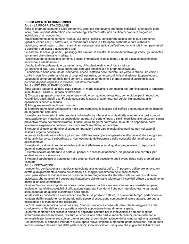 REGOLAMENTO DI CONDOMINIO Art. 1 - LA PROPRIETÀ COMUNE Sono di proprietà comune a tutti i condomini, proprietà che devono intendersi indivisibili, tutte quelle parti, locali, cose, impianti dell'edificio che, in base agli atti d'acquisto, non risultino di proprietà singola ed individuale di un condomino. Specificatamente sono comuni: l'area su cui sorge l'edificio, considerata tutt'una con le sue pertinenze (giardini, cortile ecc.), il sottosuolo, le fondamenta e tutte le altre opere destinate a dare stabilità al fabbricato, i muri maestri, pilastri e architravi necessari alla statica dell'edificio, nonché tutti i muri perimetrali e quelli dei vani scala e ascensori e tetti. Gli androni, le scale, gli anditi, i passaggi alle cantine, le finestre, le opere decorative, gli infissi, gli impianti e serramenti che si trovano in tali parti. I locali lavanderia, stenditoio comune, il locale immondizie, il gioco bimbi, e quelli occupati dagli impianti ascensore e riscaldamento. L'impianto di riscaldamento e canne fumarie, gli impianti elettrici e di forza motrice. Gli impianti di gas, luce, acqua, fognatura, sino agli attacchi con le proprietà individuali. É considerato bene comune dei condomini anche l'estetica delle facciate, sia verso la strada, sia verso il cortile in ogni loro parte, anche se di proprietà esclusiva, come balconi, infissi, ringhiere, tapparelle, ecc. La quota di comproprietà delle parti comuni di ciascun condomino è proporzionata al valore della sua porzione di piano espressa in millesimi nel titolo d'acquisto. Art. 2 - USO DELLE PARTI COMUNI Sono vietati i seguenti usi delle cose comuni, in modo tassativo e con facoltà dell'amministratore di applicare la multa di cui all'art. 5, in caso di infrazione: 1) Occupare gli spazi comuni in qualunque modo e con qualunque oggetto, come bidoni per immondizie, vasi di fiori, bauli, mobili ecc. Fa solo eccezione la sosta di automezzi nel cortile, limitatamente alle operazioni di carico e scarico. 2) Alloggiare animali negli spazi comuni. 3) Stendere panni fuori dai balconi o nelle parti comuni sulle facciate dell'edificio o comunque senza rispetto dei regolamenti comunali. É vietato fare innovazioni nelle proprietà individuali che interessino in via diretta o indiretta le parti comuni (occupazione con materiale da costruzione, apertura di porte o finestre simili, modifiche alle tubazioni) senza preventivo avviso dell'amministratore, il quale, entro 10 giorni dall'avviso, se lo riterrà opportuno, potrà intimare la sospensione dei lavori, e convocare l'assemblea per decidere. É vietato al singolo condomino di eseguire riparazioni delle parti e impianti comuni, se non nel caso di assoluta urgente necessità. In questa ipotesi dovrà notificare gli estremi dell'intrapresa opera o riparazione all'amministratore e ogni suo diritto al rimborso sarà subordinato al riconoscimento dell'urgenza e della necessità dei lavori da parte dell'assemblea. É vietato ai condomini proprietari delle cantine di effettuare scavi di qualunque genere e di depositarvi materiali comunque pericolosi. É vietato lasciare aperte tutte le porte e i portoni di accesso al fabbricato, sia pedonali che carrabili, per evidenti ragioni di sicurezza. É vietato il parcheggio di automezzi nelle aree cortilizie ad eccezione degli aventi diritto nelle aree ad essi riservate. Art. 3 - INNOVAZIONI I condomini, con la speciale maggioranza indicata alla lettera b) dell'art. 7, possono deliberare innovazioni dirette al miglioramento o all'uso più comodo o al maggior rendimento delle cose comuni. Sono però vietate le innovazioni che possono recare pregiudizio alla stabilità o alla sicurezza statica del fabbricato, che ne alterino il decoro architettonico o che rendano talune parti inservibili all'uso o al godimento anche di un solo condomino. Qualora l'innovazione importi una spesa molto gravosa o abbia carattere voluttuario e consista in opere, impianti e manufatti suscettibili di utilizzazione separata, i condomini che non intendono trarne vantaggio sono esonerati da qualsiasi contributo nella spesa. In tale ipotesi i condomini e i loro eredi o aventi causa possono tuttavia, in qualunque tempo, partecipare ai vantaggi dell'innovazione (contribuendo nelle spese di esecuzione computate al valore attuale, pro quota millesimale e di manutenzione dell'opera). Se l'utilizzazione separata non è possibile, l'innovazione non è consentita salvo che la maggioranza dei condomini che l'ha deliberata e accettata intenda sopportarne integralmente la spesa. Le norme contenute nel presente articolo si applicano soltanto per le innovazioni e non per le spese straordinarie di conservazione, restauro e ricostruzione delle parti e impianti comuni, per le quali non è ammissibile per la minoranza dissenziente sottrarsi al contributo, adducendo la voluttuarietà o la gravosità. Per innovazioni si debbono intendere quelle opere nuove, impianti o manufatti prima inesistenti, che mutano la consistenza e destinazione delle parti comuni; sono innovazioni utili quelle che migliorano l'utilizzazione delle parti e impianti comuni (esempio la costruzione di una guardiola, l'installazione di una antenna televisiva comune); sono innovazioni voluttuarie quelle che attengono soltanto al decoro (esempio statue e fontane); sono innovazioni vietate quelle che interessano anche indirettamente la struttura portante di cemento armato o che pregiudicano i diritti anche di un solo condomino (esempio la muratura di una porta che consentiva, attraverso un passaggio comune, di accedere ad una proprietà individuale, quand'anche a questa si possa accedere ad un'altra parte). Sono innovazioni suscettibili di godimento separato quelle che possono essere poste al servizio anche di una sola parte dei condomini (esempio impianto centralizzato di acqua calda); sono innovazioni gravose quelle che comportano una spesa superiore a L. .................... aumentata o diminuita in proporzione alle variazioni dell'