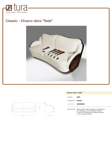 Classic - Divano deco "fede" Divano deco "fede" Articolo: 2597 Collezione: Classic L x D x H: 203X90X85 Descrizione: Divano deco "fede" rivestito in pergamena (rif. catalogo: col. 007 tabacco lucida). Tessuti vari disponibili a catalogo oppure c.o.m. (tessuto cliente)