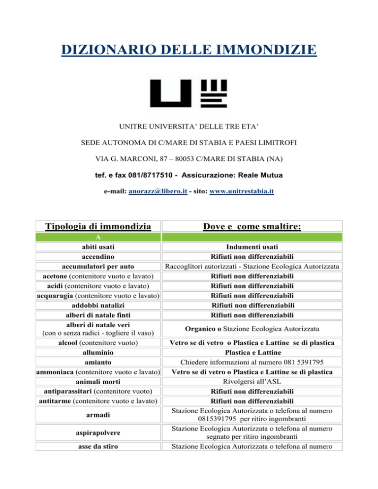 DIZIONARIO DELLE IMMONDIZIE UNITRE UNIVERSITA’ DELLE TRE ETA’ SEDE AUTONOMA DI C/MARE DI STABIA E PAESI LIMITROFI VIA G. MARCONI, 87 – 80053 C/MARE DI STABIA (NA) tef. e fax 081/8717510 - Assicurazione: Reale Mutua e-mail: [email protected] - sito: www.unitrestabia.it Tipologia di immondizia Dove e come smaltire: A abiti usati Indumenti usati accendino Rifiuti non differenziabili Raccoglitori autorizzati - Stazione Ecologica Autorizzata accumulatori per auto acetone (contenitore vuoto e lavato) Rifiuti non differenziabili acidi (contenitore vuoto e lavato) Rifiuti non differenziabili acquaragia (contenitore vuoto e lavato) Rifiuti non differenziabili addobbi natalizi Rifiuti non differenziabili alberi di natale finti Rifiuti non differenziabili alberi di natale veri Organico o Stazione Ecologica Autorizzata (con o senza radici - togliere il vaso) alcool (contenitore vuoto) Vetro se di vetro o Plastica e Lattine se di plastica alluminio Plastica e Lattine Chiedere informazioni al numero 081 5391795 amianto ammoniaca (contenitore vuoto e lavato) Vetro se di vetro o Plastica e Lattine se di plastica Rivolgersi all’ASL animali morti antiparassitari (contenitore vuoto) Rifiuti non differenziabili antitarme (contenitore vuoto e lavato) Rifiuti non differenziabili Stazione Ecologica Autorizzata o telefona al numero armadi 0815391795 per ritiro ingombranti Stazione Ecologica Autorizzata o telefona al numero aspirapolvere segnato per ritiro ingombranti Stazione Ecologica Autorizzata o telefona al numero asse da stiro assorbenti astucci attaccapanni in ferro attaccapanni in legno attaccapanni in plastica B bacinelle in plastica bambole bambù bandiere barattoli in alluminio e acciaio (per olio pelati, tonno, etc.) barattoli in latta (scatole di pelati ecc) barattoli per alimenti in polvere barattoli per articoli da cancelleria barattoli per detersivi barattoli per rullini fotografici barattoli per salviette umide barattolini di crema barre da imballaggio in polistirolo espanso batuffoli e bastoncini di cotone bauli biancheria intima bicchieri in plastica bicchieri in vetro biciclette bistecchiera blister in plastica (confezione di compresse, pasticche ecc.) bombole del gas bombolette spray (contenitore vuoto) bombolette spray con simbolo T e/o F (contenitore vuoto) borse di plastica borse in cuoio segnato per ritiro ingombranti Rifiuti non differenziabili Rifiuti non differenziabili Stazione Ecologica Autorizzata o telefona al numero segnato per ritiro ingombranti Stazione Ecologica Autorizzata o telefona al numero segnato per ritiro ingombranti Plastica o telefona al numero segnato per ritiro ingombranti Plastica e Lattine Rifiuti non differenziabili Organico Indumenti usati Plastica e Lattine Plastica e Lattine Plastica e Lattine Plastica e Lattine Plastica e Lattine se di plastica o Carta o Cartone se di cartone Plastica e Lattine Plastica e Lattine Vetro se di vetro e Plastica e Lattine se di plastica Plastica e Lattine Rifiuti non differenziabili Stazione Ecologica Autorizzata o telefona al numero segnato per ritiro ingombranti Indumenti usati Rifiuti non differenziabili Vetro Stazione Ecologica Autorizzata o telefona al numero segnato per ritiro ingombranti Stazione Ecologica Autorizzata Plastica e Lattine se vuoto altrimenti contenitore farmaci Fornitori e rivenditori autorizzati Rifiuti non differenziabili Rifiuti non differenziabili Plastica e Lattine Indumenti usati bottiglie di plastica per acqua, olio, succhi bottiglie in vetro bottoni box per bambini bronzo buste e sacchetti per alimenti in genere (pasta, riso, ecc.) buste in plastica C calcinacci calcolatrici con componenti elettroniche calze di nylon, lana, cotone candeggina (contenitore vuoto e lavato) canne per irrigazione capelli cappelli carbone spento carrozzine carta carbone carta cerata carta delle caramelle carta patinata carta per affettati carta per formaggio carta plastificata carta sporca di colla o altre sostanze carta stagnola (alluminio) carta umida carta unta carta vetrata cartoncino cartone da imballaggio cartone per alimenti - tetrapak (per latte, succhi di frutta, etc.) cartucce per stampanti cassette audio e video cassette di legno cassette di plastica Plastica e Lattine Vetro Rifiuti non differenziabili Stazione Ecologica Autorizzata o telefona al numero segnato per ritiro ingombranti Stazione Ecologica Autorizzata Plastica e Lattine Plastica e Lattine Impianti autorizzati Stazione Ecologica Autorizzata Indumenti usati Plastica e Lattine se di plastica o Vetro se di vetro Rifiuti non differenziabili Rifiuti non differenziabili Indumenti usati Organico Stazione Ecologica Autorizzata o telefona al numero segnato per ritiro ingombranti Rifiuti non differenziabili Rifiuti non differenziabili Rifiuti non differenziabili Carta o Cartone Rifiuti non differenziabili Rifiuti non differenziabili Rifiuti non differenziabili Rifiuti non differenziabili Plastica e Lattine Carta e Cartone Organico Rifiuti non differenziabili Carta e Cartone Carta e Cartone Plastica e Lattine Stazione Ecologica Autorizzata – Raccoglitori (per aziende) Rifiuti non differenziabili Stazione Ecologica Autorizzata o Organico Plastica e Lattine o Stazione Ecologica Autorizzata cassette per ortofrutta e carni cd e cd-rom cellophane Cenere spente cera cerini chips da imballaggio in polistirolo espanso cinture in plastica, stoffa e cuoio colle e collanti combustibili liquidi computer confezioni in plastica rigide o flessibili congelatori Plastica e Lattine o Stazione Ecologica Autorizzata Rifiuti non differenziabili Plastica e Lattine Organico Rifiuti non differenziabili Rifiuti non differenziabili Plastica e Lattine Indumenti usati Chiedi informazioni al numero 081 5391795 Chiedi informazioni al numero 081 5391795 Stazione Ecologica Autorizzata o telefona al numero segnato per ritiro ingombranti Plastica e Lattine Stazione Ecologica Autorizzata o telefona al numero segnato per ritiro ingombranti contenitori per alimenti in alluminio e Plasti