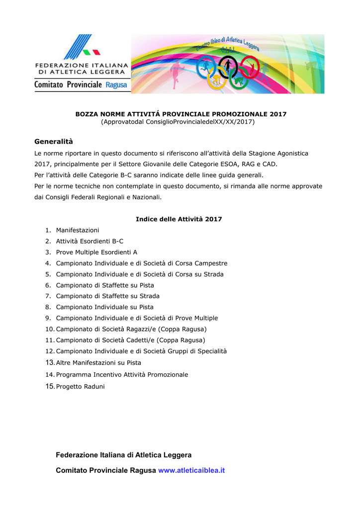 BOZZA NORME ATTIVITÁ PROVINCIALE PROMOZIONALE 2017 (Approvatodal ConsiglioProvincialedelXX/XX/2017) Generalità Le norme riportare in questo documento si riferiscono all’attività della Stagione Agonistica 2017, principalmente per il Settore Giovanile delle Categorie ESOA, RAG e CAD. Per l’attività delle Categorie B-C saranno indicate delle linee guida generali. Per le norme tecniche non contemplate in questo documento, si rimanda alle norme approvate dai Consigli Federali Regionali e Nazionali. Indice delle Attività 2017 1. Manifestazioni 2. Attività Esordienti B-C 3. Prove Multiple Esordienti A 4. Campionato Individuale e di Società di Corsa Campestre 5. Campionato Individuale e di Società di Corsa su Strada 6. Campionato di Staffette su Pista 7. Campionato di Staffette su Strada 8. Campionato Individuale su Pista 9. Campionato Individuale e di Società di Prove Multiple 10. Campionato di Società Ragazzi/e (Coppa Ragusa) 11. Campionato di Società Cadetti/e (Coppa Ragusa) 12. Campionato Individuale e di Società Gruppi di Specialità 13. Altre Manifestazioni su Pista 14. Programma Incentivo Attività Promozionale 15. Progetto Raduni Federazione Italiana di Atletica Leggera Comitato Provinciale Ragusa www.atleticaiblea.it Manifestazioni Le Manifestazioni Istituzionali saranno organizzate dal Comitato Atletica Iblea. Le Manifestazioni non Istituzionali saranno organizzate esclusivamente dalle Società ma dovranno comunque essere approvate dal Comitato Atletica Iblea. L’Assegnazione delle Manifestazioni alle Società richiedenti sarà in funzione di criteri che saranno discussi in seno al Comitato. Allo scopo di ottimizzare la ripartizione dei costi e potenziare nello stesso tempo l’utilizzo di risorse e attrezzature a favore degli Atleti, il Comitato suggerisce l’organizzazione di Manifestazioni congiunte tra più Società Organizzatrici. Attività Esordienti B-C L’attività per questa fascia d’età è da considerarsi “Ludica”, non saranno pertanto istituiti Campionati Provinciali. Nelle Manifestazioni Provinciali sarà possibile comunque l’inserimento di Attività dedicate a questa fascia di età, le cui specialità saranno da concordare caso per caso con i Fiduciari Tecnici Provinciali. Le Attività di base dovranno comunque avere come obiettivo principale quello di far provare ai bambini il maggior numero di esperienze motorie possibili, senza mai tralasciare l’aspetto ludico delle attività, per un sano sviluppo psico-fisico ed educativo, oltre che creare interesse nei genitori. A tal fine le premiazioni di questa categoria non saranno basate sul tradizionale agonismo, inteso come tempi di arrivo/distanze realizzate, ma sulla partecipazione e l’impegno dimostrato in gara. Il Comitato Provinciale incoraggerà e supporterà questo genere di attività, specie se realizzate in collaborazione con Enti Scolastici o Enti di Promozione Sportiva, mettendo a disposizione Servizi Logistici, la Promozione dell’evento, la ricerca di Infrastrutture idonee, la fornitura di Attrezzi per Giochi, eccetera, tutte iniziative che tendono a favorire e promuovere l’atletica giovanile. Particolare attenzione deve essere riservata agli studenti della Categoria ESOB, poiché in questa fascia d’età si riescono a trasmettere in maniera ludica i concetti del “Saltare”, “Lanciare” e “Correre” e quindi propedeutici alle Specialità vere e proprie dell’Atletica Leggera. Grand Prix Provinciale Giovanile Esordienti ABC Ragazzi-Cadetti vedi programma Grand Prix. Campionato Individuale e di Società di Corsa Campestre Campionato Individuale e di Società di Corsa su Strada Ogni Società potrà partecipare ai Campionati Individuali e di Società, di Corsa Campestre, di Corsa su Strada, con un numero illimitato di Atleti. Le distanze di gara in funzione della Categoria degli Atleti, dovranno essere come di seguito indicato: Federazione Italiana di Atletica Leggera Comitato Provinciale Ragusa www.atleticaiblea.it Esordienti A M/F: 500m Ragazze: 1000m; Ragazzi: 1000m. Cadette: 2000m; Cadetti: 2000m. I Campionati Individuali si svolgeranno in un’unica giornata. I Campionati Societari potranno svolgersi in un’unica giornata oppure in due giornate distinte, in funzione alle richieste pervenute e alle esigenze di Calendario. Nella stessa giornata del Campionato Individuale, potrà comunque disputarsi eventualmente anche una delle due giornate del Campionato Societario. La Classifica Individuale per le categorie Esordienti, Ragazze/i Cadette/i, sarà stilata secondo l’ordine di arrivo, tenendo conto dei soli piazzamenti di Atleti tesserati per Società della Provincia di Ragusa. Si raccomanda agli speakers, in particolare per la categoria Esordienti, di enfatizzare la prestazione ottenuta dagli Atleti a prescindere dalla posizione conseguita (tempo realizzato). Per ogni Categoria e Sesso, saranno premiati i primi SEI Atleti della Classifica Individuale e al primo Classificato sarà consegnata la maglia di Campione Provinciale. Ai fini della Classifica di Società, saranno stilate classifiche Societarie distinte per ogni Categoria e Sesso, tenendo conto dei soli piazzamenti/punteggi di Atleti tesserati per Società della Provincia di Ragusa. Se N è il numero degli Atleti classificati, per ogni Categoria e Sesso, saranno attribuiti N punti al primo Atleta classificato, N-1 punti al secondo, N-2 punti al terzo e così via a scalare, fino al N-esimo Atleta classificato che prenderà 1 punto. La Classifica di Società, per ogni Categoria e Sesso, sarà stilata sommando, per ogni Società, fino ad un massimo di TRE dei migliori punteggi degli Atleti classificati. In caso di Campionato Societario che si svolge in un’unica giornata, per ogni Categoria e Sesso, si aggiudica il Campionato della data Categoria, la Società che realizza il punteggio più alto, indipendentemente dal numero di punteggi sommati, sempre sino ad un massimo di TRE dei migliori punteggi degli atleti cla