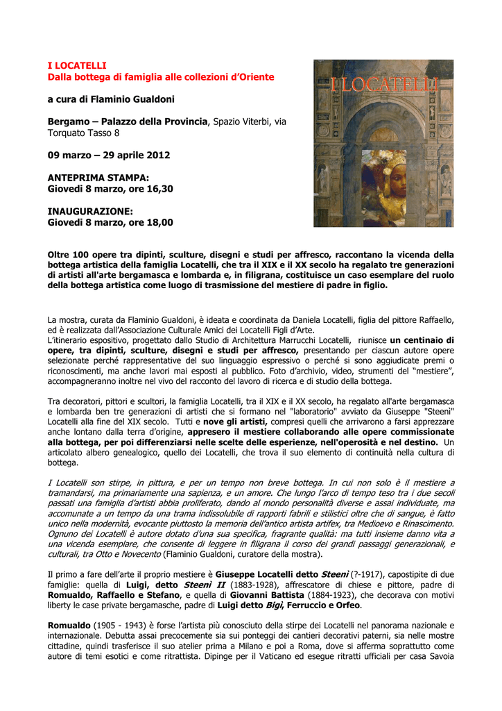 I LOCATELLI Dalla bottega di famiglia alle collezioni d’Oriente a cura di Flaminio Gualdoni Bergamo – Palazzo della Provincia, Spazio Viterbi, via Torquato Tasso 8 09 marzo – 29 aprile 2012 ANTEPRIMA STAMPA: Giovedi 8 marzo, ore 16,30 INAUGURAZIONE: Giovedi 8 marzo, ore 18,00 Oltre 100 opere tra dipinti, sculture, disegni e studi per affresco, raccontano la vicenda della bottega artistica della famiglia Locatelli, che tra il XIX e il XX secolo ha regalato tre generazioni di artisti all'arte bergamasca e lombarda e, in filigrana, costituisce un caso esemplare del ruolo della bottega artistica come luogo di trasmissione del mestiere di padre in figlio. La mostra, curata da Flaminio Gualdoni, è ideata e coordinata da Daniela Locatelli, figlia del pittore Raffaello, ed è realizzata dall’Associazione Culturale Amici dei Locatelli Figli d’Arte. L’itinerario espositivo, progettato dallo Studio di Architettura Marrucchi Locatelli, riunisce un centinaio di opere, tra dipinti, sculture, disegni e studi per affresco, presentando per ciascun autore opere selezionate perché rappresentative del suo linguaggio espressivo o perché si sono aggiudicate premi o riconoscimenti, ma anche lavori mai esposti al pubblico. Foto d’archivio, video, strumenti del “mestiere”, accompagneranno inoltre nel vivo del racconto del lavoro di ricerca e di studio della bottega. Tra decoratori, pittori e scultori, la famiglia Locatelli, tra il XIX e il XX secolo, ha regalato all'arte bergamasca e lombarda ben tre generazioni di artisti che si formano nel "laboratorio" avviato da Giuseppe "Steenì" Locatelli alla fine del XIX secolo. Tutti e nove gli artisti, compresi quelli che arrivarono a farsi apprezzare anche lontano dalla terra d’origine, appresero il mestiere collaborando alle opere commissionate alla bottega, per poi differenziarsi nelle scelte delle esperienze, nell'operosità e nel destino. Un articolato albero genealogico, quello dei Locatelli, che trova il suo elemento di continuità nella cultura di bottega. I Locatelli son stirpe, in pittura, e per un tempo non breve bottega. In cui non solo è il mestiere a tramandarsi, ma primariamente una sapienza, e un amore. Che lungo l’arco di tempo teso tra i due secoli passati una famiglia d’artisti abbia proliferato, dando al mondo personalità diverse e assai individuate, ma accomunate a un tempo da una trama indissolubile di rapporti fabrili e stilistici oltre che di sangue, è fatto unico nella modernità, evocante piuttosto la memoria dell’antico artista artifex, tra Medioevo e Rinascimento. Ognuno dei Locatelli è autore dotato d’una sua specifica, fragrante qualità: ma tutti insieme danno vita a una vicenda esemplare, che consente di leggere in filigrana il corso dei grandi passaggi generazionali, e culturali, tra Otto e Novecento (Flaminio Gualdoni, curatore della mostra). Il primo a fare dell’arte il proprio mestiere è Giuseppe Locatelli detto Steenì (?-1917), capostipite di due famiglie: quella di Luigi, detto Steenì II (1883-1928), affrescatore di chiese e pittore, padre di Romualdo, Raffaello e Stefano, e quella di Giovanni Battista (1884-1923), che decorava con motivi liberty le case private bergamasche, padre di Luigi detto Bigì, Ferruccio e Orfeo. Romualdo (1905 - 1943) è forse l’artista più conosciuto della stirpe dei Locatelli nel panorama nazionale e internazionale. Debutta assai precocemente sia sui ponteggi dei cantieri decorativi paterni, sia nelle mostre cittadine, quindi trasferisce il suo atelier prima a Milano e poi a Roma, dove si afferma soprattutto come autore di temi esotici e come ritrattista. Dipinge per il Vaticano ed esegue ritratti ufficiali per casa Savoia prima di partire per l’Estremo Oriente, prima a Java a poi a Bali, dove acquisisce rapidamente una prestigiosa committenza internazionale. Alla scoppio della guerra mondiale raggiunge Manila dove, nel 1943, scompare senza lasciar traccia durante una partita di caccia. Raffaello (1915-1984), di dieci anni più giovane del fratello Romualdo, amante del colore dolce e malinconico, assimila l’insegnamento di Cézanne con freschezza moderna; pittore eminentemente da cavalletto, è uno dei protagonisti della grande stagione italiana dei premi degli anni ’50, in cui si distingue come paesaggista e ritrattista. Stefano (1920-1989), unico scultore della famiglia, dà vita a imponenti monumenti come la statua di Papa Giovanni XXIII, gli viene affidata la cattedra di ornato e modellato presso il Liceo Artistico Statale di Brera sezione di Bergamo, che terrà per dodici anni. Luigi detto Bigì (1904-1983) dipinge per pochi anni, lasciando opere degne di nota tra Bergamo e Parigi. Ferruccio (1906-1966), grande amico di Giacomo Manzù con il quale condivide un soggiorno a Parigi, sperimenta diversi linguaggi artistici, sino a realizzare una serie di prove in chiave astratto-lirica. Orfeo (1919 - 2000), infine, senza abbandonare il figurativo, esprime una pittura istintiva ridotta all’essenziale, conquistando numerosi riconoscimenti nella stagione dei premi nazionali degli anni ’50. E’ docente prima alla Scuola Fantoni, poi al Liceo Artistico cittadino fino al 1977. La mostra è accompagnata dalla pubblicazione del volume monografico “I Locatelli”, a cura di Flaminio Gualdoni (Ed. Bandecchi & Vivaldi) , che raccoglie testimonianze di Fernando Noris, Fernando Rea, Lino Lazzari, Amanzio Possenti e indaga anche il periodo di decorazione parietale, “a fresco” o “a tempera”, principale attività della bottega ai tempi di Luigi Steenì II, oltre a presentare per la prima volta opere mai riprodotte, come le opere provenienti dalle collezioni orientali. I LOCATELLI Dalla bottega di famiglia alle collezioni d’Oriente Bergamo – Palazzo della Provincia, Spazio Viterbi, via Torquato Tasso 8 9 marzo – 29 aprile 2012 Inaugurazione: giovedì 8 marzo, ore 18.00 Orari: venerdì 9 marzo 10-12 e 16-19; martedì-venerdì 16-19; sabato, domenica e f