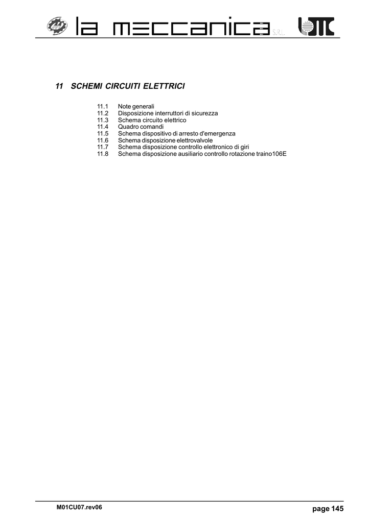 11 SCHEMI CIRCUITI ELETTRICI 11.1 11.2 11.3 11.4 11.5 11.6 11.7 11.8 M01CU07.rev06 Note generali Disposizione interruttori di sicurezza Schema circuito elettrico Quadro comandi Schema dispositivo di arresto d'emergenza Schema disposizione elettrovalvole Schema disposizione controllo elettronico di giri Schema disposizione ausiliario controllo rotazione traino106E page 145 11.1 Note generali Tutti i collegamenti elettrici devono essere da Voi eseguiti compresa l’installazione di tutti gli interruttori necessari (di Vostra fornitura) ATTENZIONE Per l’esecuzione degli allacciamenti elettrici è opportuno osservare le regole generali e le disposizioni riportate nella Norma CEI 64-8. L’installazione ed i collegamenti devono essere effettuati esclusivamente da personale qualificato. ATTENZIONE E’ obbligatorio eseguire la messa a terra della macchina. Inoltre la pressa deve essere dotata di un sistema di interblocco che eviti l’avviamento dei motori con la porta aperta. ATTENZIONE Si raccomanda di inserire un modulo di arresto d’emergenza in serie sulla linea del circuito ausiliario. La Meccanica consiglia di installare un modula PICONTROL tipo PNOZ oppure di altro costruttore ma avente caratteristiche analoghe. Controllare sempre che la tensione e la frequenza di rete corrispondano a quelle indicate sulle targhe dei motori prima di procedere all’alimentazione della pressa Si consiglia di inserire nel circuito di alimentazione dell’amperometro un contatto N.A. del D per evitare all’indicatore dello strumento di sbattere a fondo scala ad ogni avviamento e si raccomanda di proteggere tutti i motori tramite salvamotore. Sequenza di avviamento dei motori pressa: prima di avviare i motori della pressa, si devono avviare tutte le macchine poste a valle i.e. coclee, elevatori, ventilatore di aspirazione, etc. Quindi l’avviamento dei motori della pressa avviene secondo la seguente sequenza: - motore principale; - motore mescolatore; - motore coclea. La Meccanica declina ogni responsabilità per danni a persone e/o cose derivanti da mancati o da errati collegamenti dei seguenti interruttori di sicurezza. page 146 M01CU07.rev06 11.2 Disposizione interruttori di sicurezza Disposizione interruttori di sicurezzaai paragrafi 11.2.1, 11.2.2, 11.2.3. 1- Sulla parte posteriore del basamento della pressa è posto un interruttore di sicurezza per salvaguardare la macchina dai sovraccarichi accidentali. Quando viene azionato questo interruttore si devono arrestare tutti i motori della pressa. 2- Sulla parte terminale della coclea è montato un interruttore che interviene qualora dovesse accidentalmente verificarsi un intasamento del mescolatore. Quando viene azionato questo interruttore si devono arrestare il motore della coclea di alimentazione ed il motore del mescolatore. 3- All’interno dello sportello laterale del carter principale della pressa, lato inferiore, è posto un interruttore che interviene quando si pare lo sportello stesso. Quando viene azionato questo interruttore si devono arrestare tutti i motori della pressa. 4- Sul carter di protezione del giunto della trasmissione, è posto un interruttore che interviene quando si apre la parte superiore del carter stesso. Quando viene azionato questo interruttore si devono arrestare tutti i motori della pressa. 5- Sulla parte fissa della porta principale, è posto un interruttore di sicurezza che impedisce l’apertura della porta stessa per il tempo necessario al gruppo traino per fermarsi. Quando la porta è aperta e quindi è azionato questo interruttore nessuno dei motori della pressa deve essere avviabile. 6- Sulla cerniera superiore della porta principale, è posto un interruttore che interviene all’apertura della porta stessa. Quando viene azionato questo interruttore si devono arrestare tutti i motori della pressa. 7- Sulla parte posteriore del carter principale della pressa, è posto un interruttore che interviene all’apertura dello sportello circolare. Quando viene azionato questo interruttore si devono arrestare tutti i motori della pressa. 8- Sulla parte superiore del serbatoio della pompa automatica per ingrassaggio é posto un interruttore che interviene quando il grasso é giunto al livello minimo. Quando viene azionato questo interruttore si deve arrestare il motore della coclea di alimentazione. M01CU07.rev06 page 147 11.2.1 page 148 Schema disposizione interruttori di sicurezza (modello ST) M01CU07.rev06 11.2.2 Schema disposizione interruttori di sicurezza (modello OR) M01CU07.rev06 page 149 11.2.3 page 150 Schema disposizione interruttori di sicurezza (modello VE) M01CU07.rev06 11.3 Schema circuito elettrico Descrizione A Comando a distanza per le bobine 18A e 18B dell’elettrovalvola di regolazione velocità del variatore che aziona la coclea di alimentazione della pressa. I pulsanti per azionare le bobine sono montati sul pannello di comando fornito con la pressa. B Comando motore mescolatore M1 (avviamento diretto): I pulsanti di avviamento e di arresto con rispettive lampade di segnalazione (riportati sullo schema) sono montati sul pannello di comando fornito con la pressa. In caso sia previsto l’avviamento del motore anche dal quadro di potenza, detti pulsanti dovranno essere collegati in parallelo ai pulsanti del quadro di potenza C Comando motore variatore: comando motore coclea M2 (avviamento diretto). L’avviamento del motore M2 deve essere effettuato dopo l’avviamento del motore mescolatore M1 (M1-1, M1-2). I pulsanti di avviamento e di arresto con rispettive lampade di segnalazione (riportati sullo schema) sono montati sul pannello di comando fornito con la pressa. In caso sia previsto l’avviamento del motore anche dal quadro di potenza, detti pulsanti dovranno essere collegati in parallelo ai pulsanti del quadro di potenza. La coclea è fornita completa di un micro di sicurezza MI1 che interviene e arresta il motore M2 in caso di intasamento il quale dovrà essere collegato in serie con il tele
