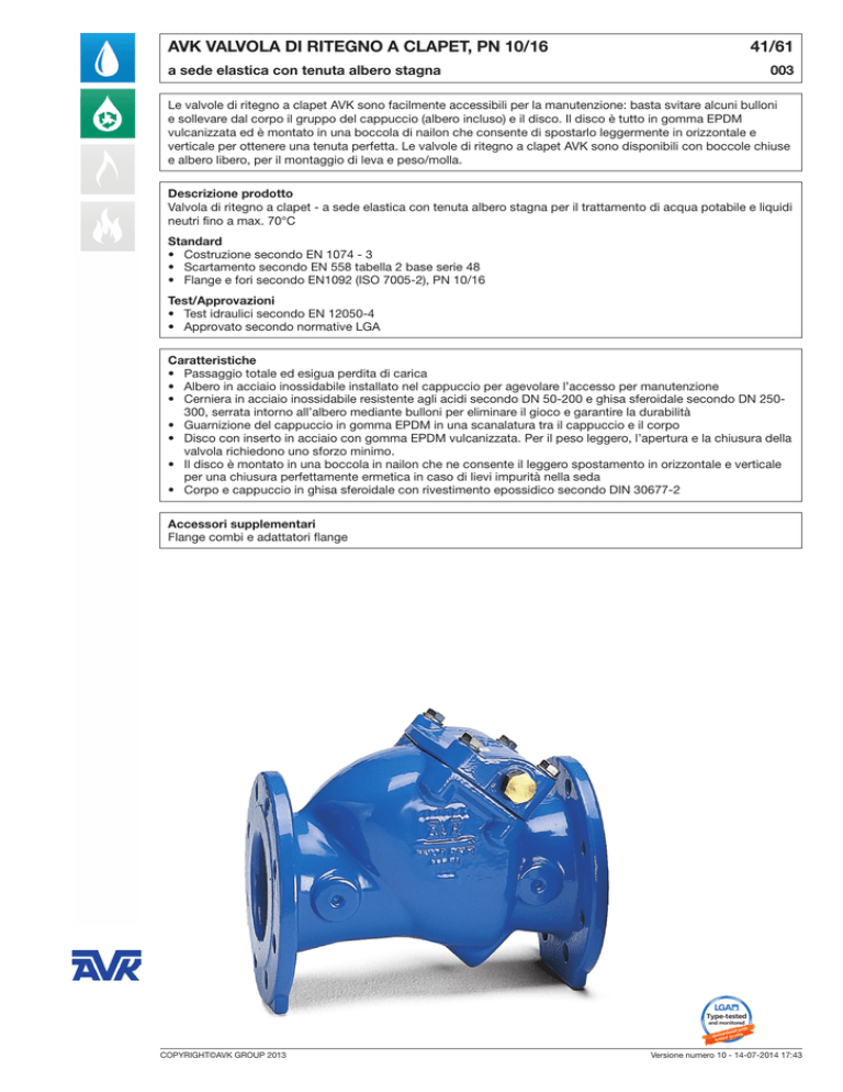 AVK VALVOLA DI RITEGNO A CLAPET, PN 10/16 a sede elastica con tenuta albero stagna 41/61 003 Le valvole di ritegno a clapet AVK sono facilmente accessibili per la manutenzione: basta svitare alcuni bulloni e sollevare dal corpo il gruppo del cappuccio (albero incluso) e il disco. Il disco è tutto in gomma EPDM vulcanizzata ed è montato in una boccola di nailon che consente di spostarlo leggermente in orizzontale e verticale per ottenere una tenuta perfetta. Le valvole di ritegno a clapet AVK sono disponibili con boccole chiuse e albero libero, per il montaggio di leva e peso/molla. Descrizione prodotto Valvola di ritegno a clapet - a sede elastica con tenuta albero stagna per il trattamento di acqua potabile e liquidi neutri fino a max. 70°C Standard • Costruzione secondo EN 1074 - 3 • Scartamento secondo EN 558 tabella 2 base serie 48 • Flange e fori secondo EN1092 (ISO 7005-2), PN 10/16 Test/Approvazioni • Test idraulici secondo EN 12050-4 • Approvato secondo normative LGA Caratteristiche • Passaggio totale ed esigua perdita di carica • Albero in acciaio inossidabile installato nel cappuccio per agevolare l’accesso per manutenzione • Cerniera in acciaio inossidabile resistente agli acidi secondo DN 50-200 e ghisa sferoidale secondo DN 250300, serrata intorno all’albero mediante bulloni per eliminare il gioco e garantire la durabilità • Guarnizione del cappuccio in gomma EPDM in una scanalatura tra il cappuccio e il corpo • Disco con inserto in acciaio con gomma EPDM vulcanizzata. Per il peso leggero, l’apertura e la chiusura della valvola richiedono uno sforzo minimo. • Il disco è montato in una boccola in nailon che ne consente il leggero spostamento in orizzontale e verticale per una chiusura perfettamente ermetica in caso di lievi impurità nella seda • Corpo e cappuccio in ghisa sferoidale con rivestimento epossidico secondo DIN 30677-2 Accessori supplementari Flange combi e adattatori flange COPYRIGHT©AVK GROUP 2013 Versione numero 10 - 14-07-2014 17:43 AVK VALVOLA DI RITEGNO A CLAPET, PN 10/16 41/61 a sede elastica con tenuta albero stagna 003 41XXX610X8.pdf 1 14-09-2012 10:21:15 10:21:15 1 2 3 4 5 6 7 8 9 10 11 12 13 14 15 16 17 H3 W1 L Elenco dei componenti 1. 3. 5. 7. 9. 11. 13. 15. 17. Dado Rondella Disco Bullone Guarn. del cappello Rondella Corpo O-ring Cappello Acciaio inossidabile A4 Acciaio inossidabile A4 EPDM con inserto in acciaio Acciaio inossidabile A2 Gomma EPDM Acciaio inossidabile A4 Ghisa sferoidale, EN-GJS-500-7 Gomma NBR Ghisa sferoidale, EN-GJS-500-7 2. 4. 6. 8. 10. 12. 14. 16. Bullone Distanziale Rondella Cerniera Chiave Bullone Tappo filettato Albero Acciaio inossidabile A4 Nailon Acciaio inossidabile A2 AISI 316/GGG-50 secondo DN 250-300 Acciaio inossidabile A4 Acciaio inossidabile A4 Ottone dezincificato Acciaio inossidabile AISI 420 I componenti possono essere sostituiti con materiali equivalenti o di classe superiore. N° rif. e dimensioni Nr. rif. AVK DN mm Foratura flange L mm H3 mm W1 mm Peso netto kg 41-050-61-018 41-065-61-018 41-080-61-018 41-100-61-018 41-125-61-018 41-150-61-018 41-200-61-008 41-200-61-018 41-250-61-008 41-250-61-018 41-300-61-008 41-300-61-018 50 65 80 100 125 150 200 200 250 250 300 300 PN16 PN10/16 PN16 PN16 PN10/16 PN16 PN10 PN16 PN10 PN16 PN10 PN16 200 240 260 300 350 400 500 500 600 600 700 700 193 233 240 260 322 338 400 400 473 473 541 541 160 160 160 175 220 220 240 240 415 415 415 415 13 17 20 26 40 51 83 83 183 183 231 231 I progetti, i materiali e le specifiche qui riportati sono soggetti a variazioni senza preavviso dovute al nostro programma di sviluppo prodotti continuativo. Versione numero 10 - 14-07-2014 17:43