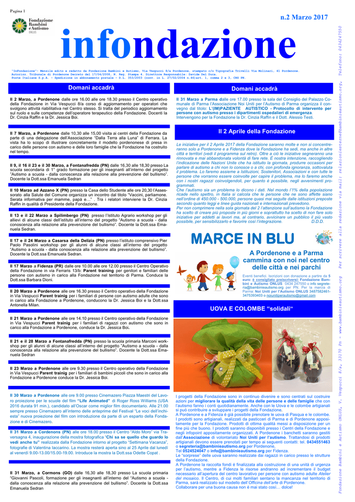 Pagina 1 Domani accadrà Il 2 Marzo, a Pordenone dalle ore 16.00 alle ore 18.30 presso il Centro operativo della Fondazione in Via Vespucci 8/a corso di aggiornamento per operatori che svolgono attività riabilitativa nel Centro stesso. Si tratta del periodico aggiornamento sul ruolo e sulle competenze dell’operatore terapeutico della Fondazione. Docenti la Dr. Cinzia Raffin e la Dr. Jessica Boi. Il 7 Marzo, a Pordenone dalle 10,30 alle 15,00 visita ai centri della Fondazione da parte di una delegazione dell’Associazione “Dalla Terra alla Luna” di Ferrara. La vista ha lo scopo di illustrare concretamente il modello pordenonese di presa in carico delle persone con autismo e delle loro famiglie che la Fondazione ha costruito nel tempo. Il 9, il 16 il 23 e il 30 Marzo, a Fontanafredda (PN) dalle 16,30 alle 18,30 presso La scuola secondaria di 1° grado formazione per gli insegnanti all’interno del progetto ”Autismo a scuola - dalla conoscenza alla relazione alla prevenzione del bullismo”. Docente la Dott.ssa Emanuela Sedran Il 10 Marzo ad Azzano X (PN) presso la Casa dello Studente alle ore 20,30 l’Assessorato alla Salute del Comune organizza un incontro dal titolo “Vaccini, parliamone. Serata informativa per mamme, papà e…” . Tra i relatori interviene la Dr. Cinzia Raffin in qualità di Presidente della Fondazione. Il 13 e il 22 Marzo a Spilimbergo (PN) presso l’Istituto Agrario workshop per gli allievi di alcune classi dell’istituto all’interno del progetto “Autismo a scuola - dalla conoscenza alla relazione alla prevenzione del bullismo”. Docente la Dott.ssa Emanuela Sedran. Il 17 e il 24 Marzo a Casarsa della Delizia (PN) presso l’istituto comprensivo Pier Paolo Pasolini workshop per gli alunni di alcune classi all’interno del progetto “Autismo a scuola - dalla conoscenza alla relazione alla prevenzione del bullismo”. Docente la Dott.ssa Emanuela Sedran. Il 17 Marzo a Fidenza (PR) dalle ore 10.00 alle ore 12.00 presso il Centro Operativo della Fondazione in via Ferraris 13/b: Parent training per genitori e familiari delle persone con autismo in carico alla Fondazione nel territorio di Parma. Conduce la Dott.ssa Barbara Dioni. Il 20 Marzo a Pordenone alle ore 16.30 presso il Centro operativo della Fondazione in Via Vespucci Parent trainig per i familiari di persone con autismo adulte che sono in carico alla Fondazione a Pordenone, conducono la Dr. Jessica Boi e la Dott.ssa Antonella Milan. Domani accadrà Il 31 Marzo a Parma dalle ore 17.00 presso la sala del Consiglio del Palazzo Comunale di Parma l’Associazione Noi Uniti per l’Autismo di Parma organizza il convegno dal titolo: L’(IM)PAZIENTE AUTISTICO - Protocollo di intervento per persone con autismo presso i dipartimenti ospedalieri di emergenza. Intervengono per la Fondazione la Dr. Cinzia Raffin e il Dott. Alessio Testi. Il 2 Aprile della Fondazione Le iniziative per il 2 Aprile 2017 della Fondazione saranno molte e non si concentreranno solo a Pordenone e a Fidenza dove la Fondazione ha sedi, ma anche in altre città e territori (vedi il programma sul retro). Oltre a ciò le iniziative segneranno una rinnovata e mai abbandonata volontà di fare rete. È nostra intenzione, raccogliendo l’indicazione delle Nazioni Unite che ha istituito la giornata, produrre occasioni per parlare di autismo a chi non lo conosce o a chi, con profonda ignoranza, sottovaluta il problema. Lo faremo assieme a Istituzioni, Sostenitori, Associazioni e con tutte le persone che vorranno essere coinvolte per capire il problema, ma lo faremo anche con i nostri ragazzi coinvolgendoli, per quanto è possibile, negli avvenimenti programmati. Che l’autismo sia un problema lo dicono i dati. Nel mondo l’1% della popolazione ricade nello spettro, in Italia si calcola che le persone che ne sono affette siano nell’ordine di 450.000 - 500.000, persone quasi mai seguite dalle istituzioni preposte secondo quanto leggi e linee guida nazionali e internazionali prevedono. Per non comprimere nella sola giornata del 2 l’attenzione sull’autismo la Fondazione ha scelto di creare più proposte in più giorni e soprattutto ha scelto di non fare solo iniziative per addetti ai lavori ma, al contrario, avvicinare un pubblico il più vasto possibile, per sensibilizzarlo e favorire così l’integrazione. D.D.D. MARCE IN BLU A Pordenone e a Parma cammina con noi nel centro delle città e nei parchi Eventi benefici. Iscrizioni con donazione a partire da 5 euro: è consigliato preiscriversi: Fondazione Bambini e Autismo ONLUS 0434 247550 o info [email protected] per PN. Per la marcia di Parma: Noi Uniti per l’Autismo ONLUS 34875824613475393403 o [email protected] UOVA E COLOMBE “solidali” Il 21 Marzo a Pordenone alle ore 14.10 presso il Centro operativo della Fondazione in Via Vespucci Parent trainig per i familiari di ragazzi con autismo che sono in carico alla Fondazione a Pordenone, conduce la Dr. Jessica Boi. Il 21 e il 28 Marzo a Fontanafredda (PN) presso la scuola primaria Marconi workshop per gli alunni di alcune classi all’interno del progetto ”Autismo a scuola - dalla conoscenza alla relazione alla prevenzione del bullismo”. Docente la Dott.ssa Emanuela Sedran Il 23 Marzo a Pordenone alle ore 9.30 presso il Centro operativo della Fondazione in Via Vespucci Parent trainig per i familiari di bambini piccoli che sono in carico alla Fondazione a Pordenone conduce la Dr. Jessica Boi. Il 30 Marzo a Pordenone alle ore 9.00 presso Cinemazero Piazza Maestri del Lavoro proiezione per le scuole del film “Life Animated” di Roger Ross Williams (USA 2016 durata 91 min.), candidato all’Oscar come miglior film documentario. Alle 21.00 sempre presso Cinemazero all’interno delle anteprime del Festival “Le voci dell’inchiesta” nuova proiezione del film con introduzione da parte di un esparto della Fondazione e di Cinemazero. Il 31 Marzo a Cordenons (PN) alle ore 18.00 presso il Centro “Aldo Moro” via Traversag