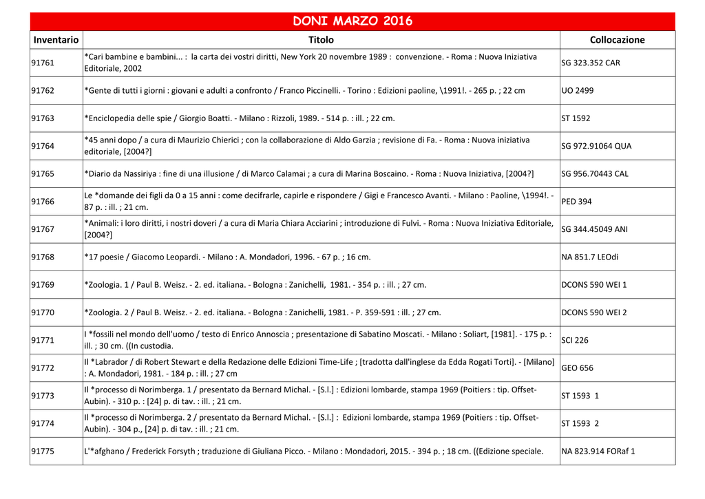 DONI MARZO 2016 Inventario Titolo Collocazione 91761 *Cari bambine e bambini... : la carta dei vostri diritti, New York 20 novembre 1989 : convenzione. - Roma : Nuova Iniziativa Editoriale, 2002 SG 323.352 CAR 91762 *Gente di tutti i giorni : giovani e adulti a confronto / Franco Piccinelli. - Torino : Edizioni paoline, \1991!. - 265 p. ; 22 cm UO 2499 91763 *Enciclopedia delle spie / Giorgio Boatti. - Milano : Rizzoli, 1989. - 514 p. : ill. ; 22 cm. ST 1592 91764 *45 anni dopo / a cura di Maurizio Chierici ; con la collaborazione di Aldo Garzia ; revisione di Fa. - Roma : Nuova iniziativa editoriale, [2004?] SG 972.91064 QUA 91765 *Diario da Nassiriya : fine di una illusione / di Marco Calamai ; a cura di Marina Boscaino. - Roma : Nuova Iniziativa, [2004?] SG 956.70443 CAL 91766 Le *domande dei figli da 0 a 15 anni : come decifrarle, capirle e rispondere / Gigi e Francesco Avanti. - Milano : Paoline, \1994!. PED 394 87 p. : ill. ; 21 cm. 91767 *Animali: i loro diritti, i nostri doveri / a cura di Maria Chiara Acciarini ; introduzione di Fulvi. - Roma : Nuova Iniziativa Editoriale, SG 344.45049 ANI [2004?] 91768 *17 poesie / Giacomo Leopardi. - Milano : A. Mondadori, 1996. - 67 p. ; 16 cm. NA 851.7 LEOdi 91769 *Zoologia. 1 / Paul B. Weisz. - 2. ed. italiana. - Bologna : Zanichelli, 1981. - 354 p. : ill. ; 27 cm. DCONS 590 WEI 1 91770 *Zoologia. 2 / Paul B. Weisz. - 2. ed. italiana. - Bologna : Zanichelli, 1981. - P. 359-591 : ill. ; 27 cm. DCONS 590 WEI 2 91771 I *fossili nel mondo dell'uomo / testo di Enrico Annoscia ; presentazione di Sabatino Moscati. - Milano : Soliart, [1981]. - 175 p. : ill. ; 30 cm. ((In custodia. SCI 226 91772 Il *Labrador / di Robert Stewart e della Redazione delle Edizioni Time-Life ; [tradotta dall'inglese da Edda Rogati Torti]. - [Milano] GEO 656 : A. Mondadori, 1981. - 184 p. : ill. ; 27 cm 91773 Il *processo di Norimberga. 1 / presentato da Bernard Michal. - [S.l.] : Edizioni lombarde, stampa 1969 (Poitiers : tip. OffsetAubin). - 310 p. : [24] p. di tav. : ill. ; 21 cm. ST 1593 1 91774 Il *processo di Norimberga. 2 / presentato da Bernard Michal. - [S.l.] : Edizioni lombarde, stampa 1969 (Poitiers : tip. OffsetAubin). - 304 p., [24] p. di tav. : ill. ; 21 cm. ST 1593 2 91775 L'*afghano / Frederick Forsyth ; traduzione di Giuliana Picco. - Milano : Mondadori, 2015. - 394 p. ; 18 cm. ((Edizione speciale. NA 823.914 FORaf 1 DONI MARZO 2016 Inventario Titolo Collocazione 91776 *Volevo vedere l'Africa : swing, cannoni, cammelli e musette. Storia di un giovane, oltre il mare di Alboran : romanzo / Teresio Asola. - Boves : Araba Fenice, 2010. - 413 p. : ill. ; 21 cm. NA 853.92 ASOvo 91777 *Allende : l'altro 11 settembre : 30 anni fa / a cura di Maurizio Chierici ; con la collaborazione d. - Roma : Nuova iniziativa editoriale, [2003! SG 983.065 ALL 91778 Il *bacio del traditore / Anna Grue. - Milano : Corriere della Sera, 2015. - 413 p. ; 20 cm. ((Traduzione di Ingrid Basso. - Edizione speciale per Corriere della Sera NA 839.8138 GRUba 91779 L'*isola / Peter Benchley ; traduzione di Andrea Terzi. - Milano : A. Mondadori, 1979. - 270 p. ; 23 cm. UO 2500 91780 *Discorsi sull'Europa / Alcide De Gasperi ; a cura e con un saggio introduttivo di Roberto Gualtieri. - Roma : Nuova Iniziativa Editoriale, stampa 2004 SG 327.17094 DEG 91781 *Mi piaci da morire / Federica Bosco. - Roma : Newton & Compton, 2005. - 187 p. ; 21 cm. NA 853.92 BOSmip 91782 *Miss Marple: le ricette del delitto : Miss Marple nei Caraibi, Miss Marple al Bertram Hotel, Miss M. - Milano : Edizione Club del libro, stampa 1982 UE 1622 91783 *Veronese / [testi di Stefano Zuffi]. - [Roma] : L'Unita ; Milano : Elemond arte, c1992. - 63 p. : ill. color. ; 23 cm. ((Ed. fuori commercio riservata ai lettori dell'Unita. AR 966 91784 *Carpaccio / [testi di Stefano Zuffi]. - [Roma] : L'unità ; Milano : Elemond arte, c1991. - 63 p. : ill. color. ; 23 cm. ((Ed. f. c. riservata AR 967 ai lettori de L'unità. 91785 *Correggio / [testi di Valerio Terraroli]. - [Roma] : L'unità ; Milano : Elemond arte, c1992. - 63 p. : ill. color. ; 23 cm. ((Ed. f. c. riservata ai lettori de L'unità. AR 968 91786 *Tintoretto / [testi di Stefano Zuffi]. - [Roma] : L'unità ; Milano : Elemond arte, c1992. - 63 p. : ill. color. ; 23 cm. ((Ed. f. c. riservata ai lettori de L'unità. AR 969 91787 *Giorgione / [testi di Stefano Zuffi]. - [Roma] : L'Unita ; Milano : A. Mondadori arte, c1991. - 63 p. : ill. color. ; 23 cm. ((Ed. fuori commercio riservata ai lettori de L'Unita. AR 970 91788 *A sud del sole / traduzione di Laura Grimaldi. - Milano : A. Mondadori, 1962. - 214 p. ; 19 cm. . UI 707 91789 *Incalza la mia verde età / Josephine Carson ; traduzione di Bruno Oddera. - Milano : A. Mondadori, 1963. - 228 p. ; 19 cm. UI 708 91790 *Lavorare stanca / Cesare Pavese . - Torino : Einaudi, stampa 1974. - 169 p. ; 20 cm. AU 886 DONI MARZO 2016 Inventario Titolo Collocazione 91791 Il *viaggio di Dove / Robin L. Graham, Derek L. T. Gill. - Milano : Garzanti, 1973. - 239 p., [16] p. di tav. : ill. ; 21 cm. ((Traduzione di F. Greenburger. 91792 *Giulio Romano / [testi di Franco Ambrosio]. - [Roma] : L'unità ; Milano : Elemond arte, 1992. - 63 p. : ill. color. ; 23 cm. ((Ed. f. c. AR 971 riservata ai lettori dell'Unità. 91793 *Guercino / [testi di Stefano Zuffi]. - [Roma] : L'unità ; Milano : Elemond arte, ©1992. - 63 p. : ill. ; 23 cm. ((Ed. f.c. riservata ai lettori dell'Unità. AR 972 91794 *De Chirico / [testi di Virginia Bertone ; commento alle illustrazioni di Francesco Poli]. - [Roma] : L'unità ; Milano : Elemond arte, c1992. - 63 p. : ill. color. ; 23 cm. ((Ed. f. c. AR 973 91795 *Giovanni Bellini / [testi di Stefano Zuffi]. - [Roma] : l'Unità ; Milano : A. Mondadori Arte, ©1991. - 63 p. : ill. ; 23 cm ((Ed. f. c. AR 974 91796 La *vera storia di Jesse James / Jesse James Jr. ; a cura di Cristiano Armati ; traduzione di Dario Morelli. - Ed. integrale. - Roma : Biblioteca economica Newton, 2007. - 205 p. : ill. ; 22 cm. NA 813.4 JAMEve 