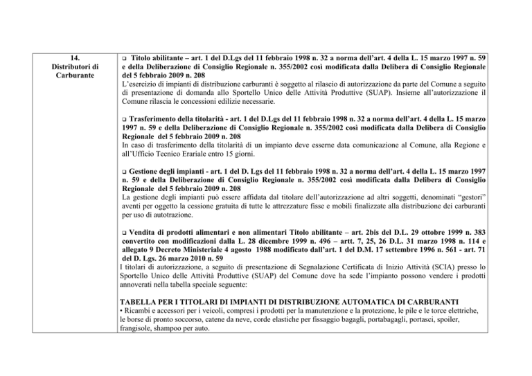 14. Distributori di Carburante Titolo abilitante – art. 1 del D.Lgs del 11 febbraio 1998 n. 32 a norma dell’art. 4 della L. 15 marzo 1997 n. 59 e della Deliberazione di Consiglio Regionale n. 355/2002 così modificata dalla Delibera di Consiglio Regionale del 5 febbraio 2009 n. 208 L’esercizio di impianti di distribuzione carburanti è soggetto al rilascio di autorizzazione da parte del Comune a seguito di presentazione di domanda allo Sportello Unico delle Attività Produttive (SUAP). Insieme all’autorizzazione il Comune rilascia le concessioni edilizie necessarie. Trasferimento della titolarità - art. 1 del D.Lgs del 11 febbraio 1998 n. 32 a norma dell’art. 4 della L. 15 marzo 1997 n. 59 e della Deliberazione di Consiglio Regionale n. 355/2002 così modificata dalla Delibera di Consiglio Regionale del 5 febbraio 2009 n. 208 In caso di trasferimento della titolarità di un impianto deve esserne data comunicazione al Comune, alla Regione e all’Ufficio Tecnico Erariale entro 15 giorni. Gestione degli impianti - art. 1 del D. Lgs del 11 febbraio 1998 n. 32 a norma dell’art. 4 della L. 15 marzo 1997 n. 59 e della Deliberazione di Consiglio Regionale n. 355/2002 così modificata dalla Delibera di Consiglio Regionale del 5 febbraio 2009 n. 208 La gestione degli impianti può essere affidata dal titolare dell’autorizzazione ad altri soggetti, denominati “gestori” aventi per oggetto la cessione gratuita di tutte le attrezzature fisse e mobili finalizzate alla distribuzione dei carburanti per uso di autotrazione. Vendita di prodotti alimentari e non alimentari Titolo abilitante – art. 2bis del D.L. 29 ottobre 1999 n. 383 convertito con modificazioni dalla L. 28 dicembre 1999 n. 496 – artt. 7, 25, 26 D.L. 31 marzo 1998 n. 114 e allegato 9 Decreto Ministeriale 4 agosto 1988 modificato dall’art. 1 del D.M. 17 settembre 1996 n. 561 - art. 71 del D. Lgs. 26 marzo 2010 n. 59 I titolari di autorizzazione, a seguito di presentazione di Segnalazione Certificata di Inizio Attività (SCIA) presso lo Sportello Unico delle Attività Produttive (SUAP) del Comune dove ha sede l’impianto possono vendere i prodotti annoverati nella tabella speciale seguente: TABELLA PER I TITOLARI DI IMPIANTI DI DISTRIBUZIONE AUTOMATICA DI CARBURANTI • Ricambi e accessori per i veicoli, compresi i prodotti per la manutenzione e la protezione, le pile e le torce elettriche, le borse di pronto soccorso, catene da neve, corde elastiche per fissaggio bagagli, portabagagli, portasci, spoiler, frangisole, shampoo per auto. 1 • Carte geografiche e stradali, mappe e guide turistiche su qualsiasi supporto realizzate, manuali tecnici per auto, impermeabili tascabili pronto impiego. • Specchi, pettini, forbici, nastri, spazzole, ventagli, necesseires per viaggio e per toletta, purché in metalli e materie non preziosi. • Pellicole fotocinematografiche, compact disc, musicassette e video-cassette registrate o da registrare. • Articoli per la cura e l'igiene della persona, nonché prodotti cosmetici e di profumeria. • Articoli di pelletteria (escluse le calzature, la valigeria e la borsetteria). • Apriscatole, levacapsule, tagliacarte in metalli e materie non preziosi. • Spaghi, turaccioli, stuzzicadenti. • Fazzoletti, piatti, posate, bicchieri "usa e getta" e simili. • Callifughi, cerotti, garze, siringhe, profilattici, assorbenti igienici, pannolini per bambini, cotone idrofilo, disinfettanti, (alcool denaturato, acqua ossigenata, tintura di iodio e simili). • Articoli ricordo (esclusi gli articoli di oreficeria).. Dotazione negli impianti self-Service Pre – Payment – art. 2 D.L. 06 luglio 2011 n. 9 convertito nella L. 15 luglio 2011 n. 111 Tutti gli impianti di distribuzione di carburanti devono dotarsi di self-service pre-payment. La possibilità di erogazione in self-service pre-payment durante l’apertura dell’impianto non è soggetta a vincoli, fermo restando l’obbligo di presenza del gestore o dei suoi dipendenti. Somministrazione di alimenti e bevande e vendita di quotidiani e periodici e tabacchi - art. 17 D.L. 24 gennaio 2012 n. 1 convertito con modificazioni nella legge 24 marzo 2012 n. 27 Negli impianti di distribuzione dei carburanti è sempre consentito: - l’esercizio dell’attività di somministrazione di alimenti e bevande ai sensi della L.R. 26 luglio 2003 n. 14; - l’esercizio dell’attività di un punto di vendita non esclusivo di quotidiani e periodici senza limiti di ampiezza della superficie dell’impianto; - l’esercizio della rivendita di tabacchi (con una superficie minima di 500 mq).; - la vendita di ogni bene e servizio, nel rispetto della vigente normativa relativa al bene e al servizio posto in vendita. Il titolare deve essere in possesso dei requisiti professionali per la vendita di prodotti alimentari i quali devono essere venduti in locali attrezzati e nel rispetto delle disposizioni igienico-sanitarie. Esposizione dei prezzi dei prodotti petroliferi – caratteristiche dei caratteri e ordine di esposizione – art. 15 D.Lgs. 6 settembre 2005 n. 206 “ Codice del Consumo “, art. 2 D.Lgs. 3 marzo 1998 n. 114 e art. 2 D.M. dello Sviluppo Economico 17 gennaio 2013 2 Il titolare o gestore di impianti di distribuzione carburanti deve esporre i prezzi dei prodotti petroliferi per uso di autotrazione. I prezzi esposti e pubblicizzati devono essere esclusivamente quelli effettivamente praticati ai consumatori. Gli stessi devono essere esposti in modo visibile dalla carreggiata stradale. L’altezza dei caratteri usati per indicare i prezzi esposti sui supporti e sui cartelli deve essere determinata in modo da garantire la visibilità in condizioni di sicurezza, assicurando indicativamente una dimensione minima dei caratteri di almeno 12 centimetri, salvo incompatibilità derivante da altre disposizioni. I prezzi devono essere esposti in euro per litro o , per il metano, in euro per chilogrammo, indicando le cifre decimali fino alla terza. Le prime 