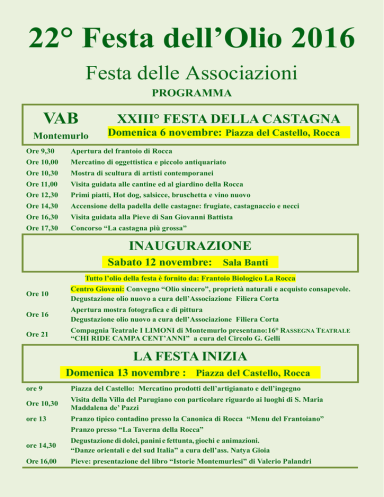 22° Festa dell’Olio 2016 Festa delle Associazioni PROGRAMMA VAB XXIII° FESTA DELLA CASTAGNA Montemurlo Domenica 6 novembre: Piazza del Castello, Rocca… Ore 9,30 Apertura del frantoio di Rocca Ore 10,00 Mercatino di oggettistica e piccolo antiquariato Ore 10,30 Mostra di scultura di artisti contemporanei Ore 11,00 Visita guidata alle cantine ed al giardino della Rocca Ore 12,30 Primi piatti, Hot dog, salsicce, bruschetta e vino nuovo Ore 14,30 Accensione della padella delle castagne: frugiate, castagnaccio e necci Ore 16,30 Visita guidata alla Pieve di San Giovanni Battista Ore 17,30 Concorso “La castagna più grossa” INAUGURAZIONE Sabato 12 novembre: Sala Banti… Tutto l’olio della festa è fornito da: Frantoio Biologico La Rocca Ore 10 Centro Giovani: Convegno “Olio sincero”, proprietà naturali e acquisto consapevole. Degustazione olio nuovo a cura dell’Associazione Filiera Corta Ore 16 Apertura mostra fotografica e di pittura Degustazione olio nuovo a cura dell’Associazione Filiera Corta Ore 21 Compagnia Teatrale I LIMONI di Montemurlo presentano:16° RASSEGNA TEATRALE “CHI RIDE CAMPA CENT’ANNI” a cura del Circolo G. Gelli LA FESTA INIZIA Domenica 13 novembre : Piazza del Castello, Rocca… ore 9 Piazza del Castello: Mercatino prodotti dell’artigianato e dell’ingegno Ore 10,30 Visita della Villa del Parugiano con particolare riguardo ai luoghi di S. Maria Maddalena de’ Pazzi ore 13 Pranzo tipico contadino presso la Canonica di Rocca “Menu del Frantoiano” Pranzo presso “La Taverna della Rocca” ore 14,30 Degustazione di dolci, panini e fettunta, giochi e animazioni. “Danze orientali e del sud Italia” a cura dell’ass. Natya Gioia Ore 16,00 Pieve: presentazione del libro “Istorie Montemurlesi” di Valerio Palandri OLIO IN TAVOLA – OLIO IN FESTA Venerdì 18 Novembre: Villa Scarfantoni… Ore 19 Visita alla villa appena restaurata, aperitivo nella limonaia, Concorso dell’Olio Ore 20 Cena in villa, menù tipico contadino. ARTE & OLIO Sabato 19 Novembre : Piazza del Castello, Rocca Ore 10 Convegno sui Templari nella cantine del castello: “Santo Stefano Papa e martire, il suo ordine, Montemurlo e la sua Rocca” a seguire aperitivo Ore 16 Processione dalla Pieve fino all’Oratorio di S. Niccolò a Rocca, con la partecipazione delle Associazioni di volontariato ed i Gruppi Parrocchiali. Ore 16,30 S. Messa con benedizione e presentazione della Madonna col Bambino di Albiano e atto di affidamento a Maria. Presiede l’Eucarestia il nuovo parroco del Sacro Cuore don Maurizio Andreini Presentazione della mostra: “Olio in tavola: sacralità e convivialità”, allestimento a cura di Cinzia Menichetti e Claudia Baroncelli A seguire Ore 18 Concerto di S. Cecilia a cura Filarmonica G. Verdi di Montemurlo, diretto da Liana Lascialfari Sabato 19 Novembre : Palestra di Oste “Anna Frank” Gran galà della Festa dell’Olio “BALLANDO CON L'OLIO (e speriamo che 'un si scivoli)” Spettacolo a cura dei gruppi di ballo di Montemurlo, organizzato dalla ASD Corallo Ore 21,00 FESTA DELL’OLIO Domenica 20 Novembre: Borgo Della Rocca In piazza sarà disponibile la “BOZZA alle OLIVE ” Ricostruzioni di vita medievale a cura del “Gruppo Storico di Montemurlo”: Cantastorie, giocolieri e giochi con Arti e mestieri medioevali Tutto l’olio della festa è fornito da: Frantoio Biologico La Rocca Dalle ore 9 Stand delle Associazioni, Mercatino tipico e dell'Antiquariato Ore 9,30 Apertura dell’antico frantoio della Azienda Agricola La Rocca Esposizione degli olii prodotti dalle aziende agricole del territorio 9° Concorso di pittura Mostra fotografica Mostra delle miniature di macchine agricole di Nedo Zeuri Mostra a cura della Ass. Naz. Alpini di Montemurlo Mostra di antichi attrezzi agricoli presso il B&B Borgo della Rocca CAMMINOLIO: passeggiata fra gli olivi. Partenza da Piazza don Milani Ore 10 VISITA GUIDATA : A spasso nel borgo su prenotazione, con animazione d'epoca. Apertura straordinaria del Giardino del Castello, e visita alla pieve ed a tutto il borgo medievale. Apertura degli stand tradizionali della Festa dell’olio (fettunta, minestra di pane, mezze maniche alla cacciatora, salsicce e fagioli, vino novello, frugiate, berlingozzo montemurlese e dolci vari), e il chiosco del porchettaio, lampredottaio e trippaio. Ore 11,00 Dalle 12,30 presso la Canonica Della Pieve: Desinare nel campo con tipico menù dei contadini “quando tutti s'era nel campo e le donne ci preparavano pane e companatico e dietro buon vino” Ore 13 Pranzo presso “La Taverna della Rocca” Danze rinascimentali a cura della ASD Corallo Gruppo Folkloristico I Maggiaioli di Bagnolo. dalle 14 Sfilata del Gruppo storico Montemurlo con Musici e sbandieratori A spasso per il borgo mangiatori di fuoco, giocolieri e musici Accampamento celtico, usi e costumi, uso dell’olio a cura della Ass. Teuta Rasna Boi Esibizione dell’Associazione Boscaioli Alta Toscana e Mostra di sculture in legno Nella Pieve di San Giovanni dec. a Rocca:... dalle 15,00 Concerto del coro Gospel: BLACK & WHITE ENSEMBLE GOSPEL CHOIR Ore 18,00 Ringraziamenti delle autorità Ore 18,30 Conclusione con i FALO’ dell’aria CHIUSURA Sabato 26 novembre: Ore 10 Misericordia di Montemurlo… Apertura mostra di pittura: saranno esposti i primi 12 classificati nel concorso Premiazione dei vincitori dell’Ottavo concorso di pittura legato alla Festa dell’Olio Ore 11 Presentazione del calendario 2017 “Montemurlo nascosta” promosso da Teleidea Aperitivo LA BEFANA AL CASTELLO Venerdì 6 gennaio 2017: Borgo Della Rocca… In collaborazione con la VAB Montemurlo www.comune.montemurlo.po.it - www.facebook.com/montemurlo.eventi Le associazioni: Misericordia di Montemurlo e di Oste, Croce D’Oro di Montemurlo e di Bagnolo, ASD Jolly e Montemurlo dalle ore 13.45 effettueranno il servizio bus-navetta con partenza da: Piazza don Milani, Piazza del Comune, Piazza P. Contardi, Piazza di Bagnolo, Piazza Amendola, P