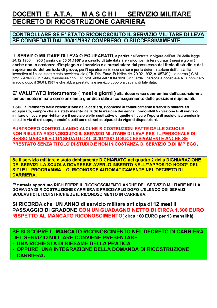 DOCENTI E A.T.A. M A S C H I SERVIZIO MILITARE DECRETO DI RICOSTRUZIONE CARRIERA CONTROLLARE SE E’ STATO RICONOSCIUTO IL SERVIZIO MILITARE DI LEVA SE CONGEDATI DAL 30/01/1987 COMPRESO O SUCCESSIVAMENTE IL SERVIZIO MILITARE DI LEVA O EQUIPARATO, a partire dall’entrata in vigore dell’art. 20 della legge 24.12.1986, n. 958 ( ossia dal 30.01.1987 o a cavallo di tale data ), è valido, per l’intera durata ( mesi e giorni ) anche non in costanza d’impiego o di servizio e a prescindere dal possesso del titolo di studio e dal superamento del periodo di prova, per l’inquadramento economico e per la determinazione dell’anzianità lavorativa ai fini del trattamento previdenziale ( Cir. Dip. Funz. Pubblica del 20.02.1992, n. 85749 ). La norma ( C.M. prot. 29 del 03.01.1996, trasmessa con C.P. prot. 4884 del 18.04.1996 ) riguarda il personale docente e ATA nominato in ruolo dopo il 30.01.1987 e che abbia prestato tale servizio dopo o a cavallo di tale data. E’ VALUTATO interamente ( mesi e giorni ) alla decorrenza economica dell’assunzione a tempo indeterminato come anzianità giuridica utile al conseguimento delle posizioni stipendiali. Il SIDI, al momento della ricostruzione della carriera, riconosce automaticamente il servizio militare ed equiparato, sempre che sia stato inserito nella dichiarazione dei servizi, nodo KNAA - Sezione B -Il servizio militare di leva o per richiamo o il servizio civile sostitutivo di quello di leva o l’opera di assistenza tecnica in paesi in via di sviluppo, nonché quelli considerati equiparati da vigenti disposizioni. PURTROPPO CONTROLLANDO ALCUNE RICOSTRUZIONI FATTE DALLE SCUOLE NON RISULTA RICONOSCIUTO IL SERVIZIO MILITARE DI LEVA PER IL PERSONALE DI SESSO MASCHILE CONGEDATO DAL 30/01/1987 O SUCCESSIVAMENTE ANCHE SE PRESTATO SENZA TITOLO DI STUDIO E NON IN COSTANZA DI SERVIZIO O DI IMPIEGO. Se il servizio militare è stato debitamente DICHIARATO nel quadro 2 della DICHIARAZIONE DEI SERVIZI LA SCUOLA DOVREBBE AVERLO INSERITO NELL’”APPOSITO NODO” DEL SIDI E IL PROGRAMMA LO RICONOSCE AUTOMATICAMENTE NEL DECRETO DI CARRIERA. E’ tuttavia opportuno RICHIEDERE IL RICONOSCIMENTO ANCHE DEL SERVIZIO MILITARE NELLA DOMANDA DI RICOSTRUZIONE CARRIERA E PRECISARLO DOPO L’ELENCO DEI SERVIZI SCOLASTICI DI CUI SI RICHIEDE IL RICONOSCIMENTO IN CARRIERA. SI RICORDA che UN ANNO di servizio militare anticipa di 12 mesi il PASSAGGIO DI GRADONE CON UN GUADAGNO NETTO DI CIRCA 1.300 EURO RISPETTO AL MANCATO RICONOSCIMENTO( circa 100 EURO per 13 mensilità) SE SI SCOPRE IL MANCATO RICONOSCIMENTO NEL DECRETO DI CARRIERA DEL SERVIZIO MILITARE,CONVIENE PRESENTARE - UNA RICHIESTA DI RIESAME DELLA PRATICA - OPPURE UNA INTEGRAZIONE DELLA DOMANDA DI RICOSTRUZIONE CARRIERA.