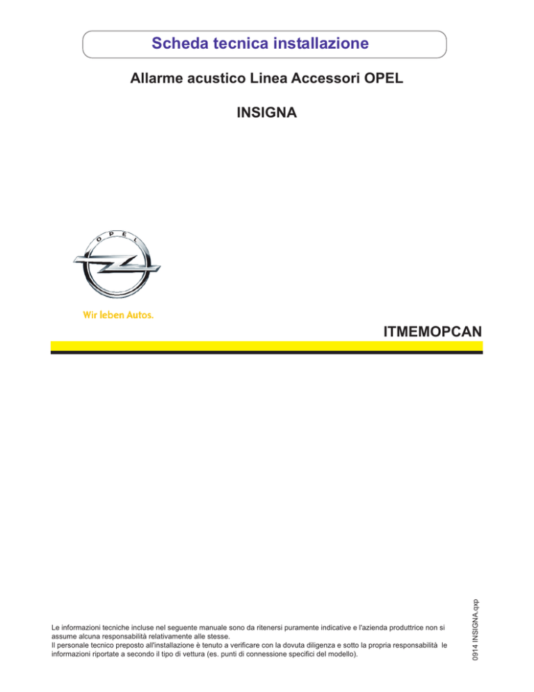 Scheda tecnica installazione Allarme acustico Linea Accessori OPEL INSIGNA Le informazioni tecniche incluse nel seguente manuale sono da ritenersi puramente indicative e l'azienda produttrice non si assume alcuna responsabilità relativamente alle stesse. Il personale tecnico preposto all'installazione è tenuto a verificare con la dovuta diligenza e sotto la propria responsabilità le informazioni riportate a secondo il tipo di vettura (es. punti di connessione specifici del modello). 0914 INSIGNA.qxp ITMEMOPCAN NORME D’INSTALLAZIONE - Prima di eseguire qualsiasi operazione scollegare il polo negativo della batteria. - L’allarme deve essere installato esclusivamente all’interno dell’abitacolo vettura, mentre la sirena in in punto protetto all’interno del vano motore o nei passaruota. - Per il fissaggio delle parti, è consigliato utilizzare del velcro. - Per i collegamenti è buona norma fare riferimento a quanto indicato sulle istruzioni. - Evitare nel modo più assoluto connessioni elettriche di tipo rapido. - Per i collegamenti effettuare la stagnatura del filo isolando la giuntura tramite guaina termorestringente o nastro isolante e fasciare i cablaggi con nastro in tessuto. PROGRAMMAZIONI necessarie per il funzionamento dell’allarme Prima dell’installazione, tramite il programmatore, selezionare : Il passo 10 (COMANDO FRECCE) e selezionare BLINKER. Il passo 11 (COM PULS BLINKER) e selezionare IMPULSO. Il passo 25 (SETUP MODULO) e selezionare 71 B GM “OPEL 3”. INSTALLAZIONE Posizionamento sirena Fissare la sirena WFR sulla traversa posta sopra il radiatore sfuttando un’asola già esistente. Fissare la sirena WFR utilizzando il dado in dotazione. Collegamento positivo fisso e negativo sirena Tramite un faston a occhiello 6mm collegare il filo ROSSO del cablaggio sirena alla derivazione +30 nella scatola porta fusibili presente nel vano motore lato guida.Foto A. Tramite un faston a occhiello 6mm collegare il filo NERO del cablaggio sirena alla derivazione di massa originale individuabile nel vano motore lato guida, nei pressi del pistoncino apertura cofano.Foto B. N.B.: Per il collegamento positivo fisso si consiglia di proteggere la linea interponendo un fusibile da minimo 5A. A B Posizionamento pulsante cofano Installare il pulsante cofano in prossimità della serratura cofano. Forare con una punta da 10mm e fissare il pulsante con viti e staffa inclusi nel kit Posizionamento centralina allarme Con il velcro in dotazione, fissare la centralina allarme sulla centralina command dietro al tunnel centrale. Collegamento alimentazione + 30 Allarme Collegare il filo ROSSO del cablaggio allarme al filo ROSSO/BIANCO o ROSSO/VIOLA pos.4 del connettore Azzurro a 27 poli individuabile sulla centralina command posizionata sotto il cruscotto lato guida, accessibile rimuovendo il cassetto portaoggetti. N.B. E’ necessario l’inserimento in linea del fusibile da 15A . Collegamento negativo di alimentazione Allarme Collegare il filo NERO del cablaggio centrale allarme al filo NERO pos.4 del connettore OBD, posto sotto il cruscotto, lato guida. Collegamento indicatori di direzione Collegare il filo AZZURRO dell’allarme al filo BLU/VIOLA pos.4 del connettore Nero a 26 poli (Foto A) e il filo AZZURRO/VERDE dell’allarme al filo filo VERDE/BIANCO pos.26 del connettore Azzurro a 27 poli (Foto B).I connettori sono sulla centralina command posizionata sotto il cruscotto lato guida. A Collegamento Can- Bus Collegare il filo NERO/ROSSO dell’allarme al filo VERDE pos.22 del connettore Azzurro a 27 poli individuabile sulla centralina command posizionata sotto il cruscotto, lato guida. B Posizionamento capsule ultrasuoni Installare il supporto capsule sulla parte alta del montante lato passeggero, prestando molta cura al passaggio dei cavi per evitare che intralcino l’eventuale apertura del cuscino AirBag laterale e il movimento della cinghia di sicurezza lato passeggero. N.B. In questa vettura seguire le indicazioni riportate sul manuale installatore “INSTALLAZIONE SU COPERTURA COPRIMONTANTE VETTURA”. Posizione led Posizionare il led sulla mascherina del cruscotto centrale. Praticare un foro di 6mm. Inserire il led nel supporto solo dopo aver posizionato lo stesso nel foro precedentemente realizzato. SOLO DOPO TERMINATA L’INSTALLAZIONE ELETTRICA COLLEGARE IL MORSETTO NEGATIVO DELLA BATTERIA, abbinare la sirena wireless (vedi pag.8 del manuale installatore) ed eseguire tutti i test funzionali del sistema prima di consegnare la vettura all’utilizzatore.