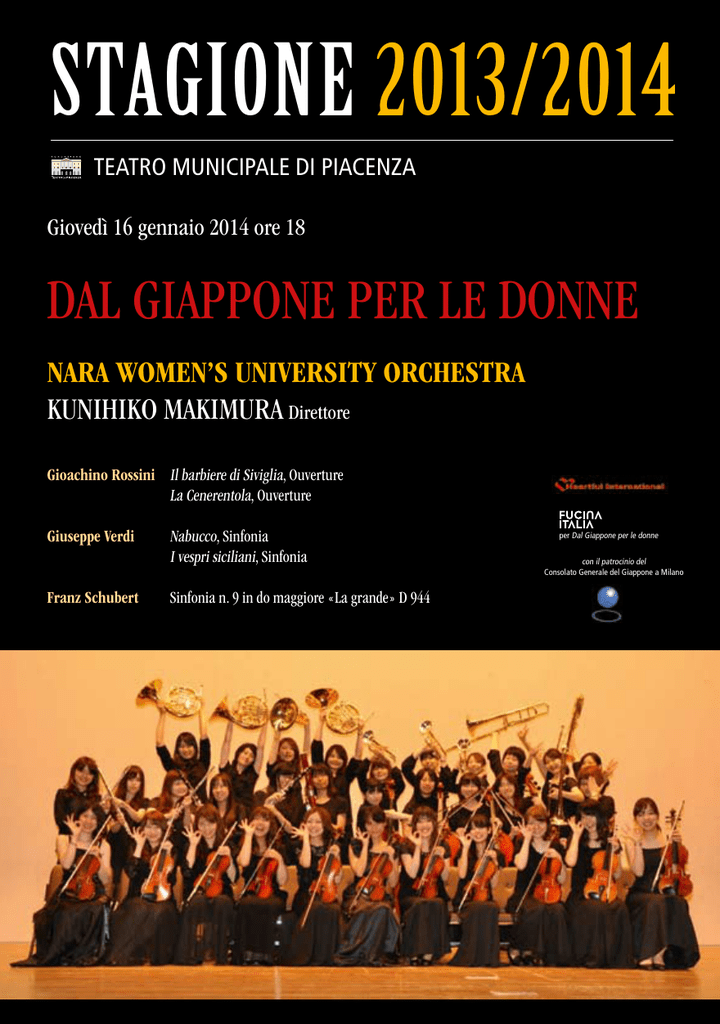 STAGIONE 2013/2014 TEATRO MUNICIPALE DI PIACENZA Giovedì 16 gennaio 2014 ore 18 DAL GIAPPONE PER LE DONNE NARA WOMEN’S UNIVERSITY ORCHESTRA KUNIHIKO MAKIMURA Direttore Gioachino Rossini Il barbiere di Siviglia, Ouverture La Cenerentola, Ouverture Giuseppe Verdi Franz Schubert Nabucco, Sinfonia I vespri siciliani, Sinfonia Sinfonia n. 9 in do maggiore «La grande» D 944 per Dal Giappone per le donne con il patrocinio del Consolato Generale del Giappone a Milano Soci fondatori COMUNE DI PIACENZA si ringrazia con il contributo di MINISTERO PER I BENI E LE ATTIVITÀ CULTURALI STAGIONE 2013/2014 TEATRO MUNICIPALE DI PIACENZA DAL GIAPPONE PER LE DONNE NARA WOMEN’S UNIVERSITY ORCHESTRA KUNIHIKO MAKIMURA Direttore Gioacchino Rossini (Pesaro, 29 febbraio 1792 - Parigi, 13 novembre 1878) Il barbiere di Siviglia, Ouverture La Cenerentola, Ouverture Giuseppe Verdi (Roncole di Busseto, 10 ottobre 1813 - Milano, 27 gennaio 1901) Nabucco, Sinfonia I vespri siciliani, Sinfonia Franz Schubert (Vienna, 31 gennaio 1797 - Vienna, 19 novembre 1828) Sinfonia n. 9 in do maggiore «La grande» D 944 I - Andante. Allegretto ma non troppo II - Andante con moto III - Scherzo. Allegro vivace IV - Allegro vivace Gentili Signore e Signori, desidero ringraziarvi per essere intervenuti al concerto di questa orchestra che nasce con il solo scopo di fare musica insieme per diletto e che abbiamo voluto si tenesse in questo straordinario Teatro, qui a Piacenza, nel cuore della civiltà operistica italiana. Desidero destinare un mio particolare segno di gratitudine al Teatro Municipale di Piacenza e alla Città di Piacenza che hanno voluto sin dal principio indirizzare i nostri sforzi comuni perché questo concerto fosse certo una festa in musica ma anche, se non soprattutto, l’occasione per richiamare l’attenzione sul tema tristemente attuale della violenza sulle donne, violenza che ferisce tutti noi. “Dal Giappone per le Donne” è il nome del progetto che abbiamo insieme costruito e che gode del patrocinio del Consolato Generale del Giappone. La Nara University è forse il più alto esempio di come la società giapponese consideri fondamentale fornire alle donne con particolare talento la possibilità di crescere in un luogo protetto e senza costrizioni esterne, per poter occupare con capacità e preparazione ruoli di primissimo piano in ogni ambito: culturale, politico, economico, per poter raggiungere quel grado di autoconsapevolezza che è la prima difesa contro vergognosi soprusi. Ma torniamo alla musica. Le ragazze della Nara University, assieme ai pochi ragazzi coinvolti per completare un organico davvero inusuale nelle dimensioni, hanno lavorato insieme e intensamente per più di un anno, desiderosi di presentarsi a voi al meglio delle loro possibilità e quanto mai entusiasti per questa rara occasione di festa in musica. Io sono Schichihei Yamakawa, Presidente e Amministratore Delegato della compagnia Heartful International che ha prodotto e coordinato questa tournée e vi ringrazio tutti ancora per averci accolto Heartful International Co., Ltd. Shichihei Yamakawa, President and CEO ENNkAkU NO kAzE (VENTO DI CAMbIAMENTO) Dal Giappone per le Donne: a Piacenza, l’orchestra della Università femminile più prestigiosa del Giappone. L’idea che molti di noi hanno del Giappone e della sua cultura, della sua società, ci deriva dalla letteratura e dalle mode che da quel paese sono arrivate anche nel mondo occidentale: pensiamo per esempio ai fumetti e ai manga che da oltre quarant’anni influenzano milioni di giovani. Un’enorme semplificazione dei messaggi, derivata dalla massificazione delle informazioni, non ci aiuta a ricordare che la cultura giapponese ha invece proprio nelle sfumature, nelle mille possibili sfaccettature, il suo segno distintivo. Riportare anche il rapporto tra la donna e la società all’interno di canoni e schemi “occidentali” può dunque condurre a fraintendimenti. Quello che più colpisce nel leggere la storia della Nara University, è che non nasce sulla scia di esempi europei o statunitensi; fu invece fondata nel 1908 con gli stessi obiettivi che si prefigge ancora oggi: preparare le donne alla leadership. Dignità e rispetto sono parole chiave nella vita di questa istituzione. Il “vento di cambiamento”, un motto non ufficiale che si percepisce nei corridoi di questa Università così speciale, si fonda ovviamente sulla coesione nella crescita, sullo spirito di corporazione. Sono elementi questi che, naturalmente, ritroviamo “amplificati” nella sua orchestra. In un mondo in cui la prevaricazione sulle donne e in genere sui più deboli è una piaga di proporzioni endemiche, l’omaggio musicale della Nara University vuol dire, non solo per le donne ma per tutti i piacentini, accettare un esempio vivo di abnegazione al miglioramento e di piacere della crescita. L’Orchestra dell’Università di Nara è nata nel 1969 e dalla sua fondazione tiene regolarmente due concerti l’anno. Questi concerti richiamano nella splendida città che fu antica capitale del Giappone, e che è stata dichiarata patrimonio dell’umanità dall’UNESCO, appassionati e turisti colti da tutto il paese. Da qualche anno è usanza che uno dei due concerti si tenga all’estero, proprio nello spirito di apertura e confronto che anima l’università. Anzi, a completare l’organico di quasi ottanta elementi l’orchestra ospita spesso provenienti da altre scuole della regione: questo è ciò che avviene anche nel concerto di stasera a Piacenza. Sul podio della Nara Women University Orchestra, salirà l’esperto kunihiko Makimura che dedica gran parte della sua attività alla formazione di giovani talenti ed è per questo chiamato a dirigere le migliori orchestre giovanili del Sol Levante. Dopo essersi formato a Vienna, si è impegnato nel repertorio operistico divenendo in breve tempo un punto di riferimento nel suo paese, tanto da meritarsi più volte il plauso della critica. I progra