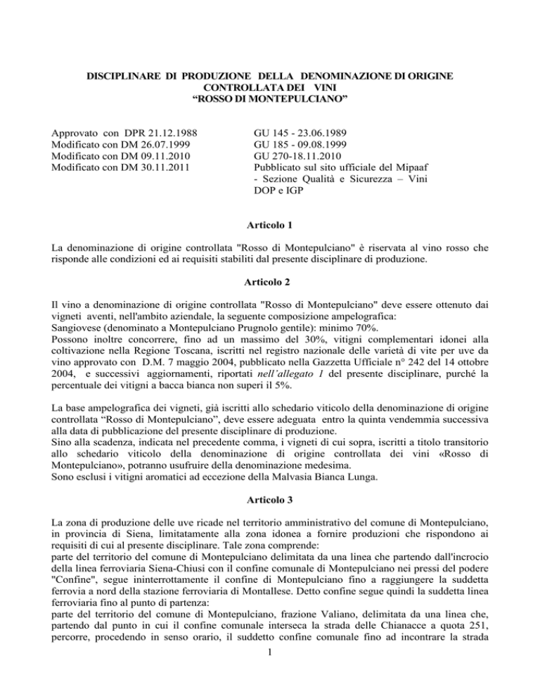 DISCIPLINARE DI PRODUZIONE DELLA DENOMINAZIONE DI ORIGINE CONTROLLATA DEI VINI “ROSSO DI MONTEPULCIANO” Approvato con DPR 21.12.1988 Modificato con DM 26.07.1999 Modificato con DM 09.11.2010 Modificato con DM 30.11.2011 GU 145 - 23.06.1989 GU 185 - 09.08.1999 GU 270-18.11.2010 Pubblicato sul sito ufficiale del Mipaaf - Sezione Qualità e Sicurezza – Vini DOP e IGP Articolo 1 La denominazione di origine controllata "Rosso di Montepulciano" è riservata al vino rosso che risponde alle condizioni ed ai requisiti stabiliti dal presente disciplinare di produzione. Articolo 2 Il vino a denominazione di origine controllata "Rosso di Montepulciano" deve essere ottenuto dai vigneti aventi, nell'ambito aziendale, la seguente composizione ampelografica: Sangiovese (denominato a Montepulciano Prugnolo gentile): minimo 70%. Possono inoltre concorrere, fino ad un massimo del 30%, vitigni complementari idonei alla coltivazione nella Regione Toscana, iscritti nel registro nazionale delle varietà di vite per uve da vino approvato con D.M. 7 maggio 2004, pubblicato nella Gazzetta Ufficiale n° 242 del 14 ottobre 2004, e successivi aggiornamenti, riportati nell’allegato 1 del presente disciplinare, purché la percentuale dei vitigni a bacca bianca non superi il 5%. La base ampelografica dei vigneti, già iscritti allo schedario viticolo della denominazione di origine controllata “Rosso di Montepulciano”, deve essere adeguata entro la quinta vendemmia successiva alla data di pubblicazione del presente disciplinare di produzione. Sino alla scadenza, indicata nel precedente comma, i vigneti di cui sopra, iscritti a titolo transitorio allo schedario viticolo della denominazione di origine controllata dei vini «Rosso di Montepulciano», potranno usufruire della denominazione medesima. Sono esclusi i vitigni aromatici ad eccezione della Malvasia Bianca Lunga. Articolo 3 La zona di produzione delle uve ricade nel territorio amministrativo del comune di Montepulciano, in provincia di Siena, limitatamente alla zona idonea a fornire produzioni che rispondono ai requisiti di cui al presente disciplinare. Tale zona comprende: parte del territorio del comune di Montepulciano delimitata da una linea che partendo dall'incrocio della linea ferroviaria Siena-Chiusi con il confine comunale di Montepulciano nei pressi del podere "Confine", segue ininterrottamente il confine di Montepulciano fino a raggiungere la suddetta ferrovia a nord della stazione ferroviaria di Montallese. Detto confine segue quindi la suddetta linea ferroviaria fino al punto di partenza: parte del territorio del comune di Montepulciano, frazione Valiano, delimitata da una linea che, partendo dal punto in cui il confine comunale interseca la strada delle Chianacce a quota 251, percorre, procedendo in senso orario, il suddetto confine comunale fino ad incontrare la strada 1 Padule a quota 253; segue quindi la predetta strada fino al bivio con la strada vicinale delle Fornaci con la quale si identifica fino all'innesto con la strada Lauretana per Valiano; la percorre verso ovest, per breve tratto, raggiunge la strada delle Chianacce, che segue fino a ricongiungersi con il punto di partenza. I vigneti iscritti allo schedario viticolo per la denominazione di origine controllata”Rosso di Montepulciano” sono utilizzabili anche per produrre vini DOC “Vin Santo di Montepulciano” alle condizioni stabilite dal relativo disciplinare di produzione. Articolo 4 Le condizioni ambientali e di coltura dei vigneti destinati alla produzione del vino a denominazione di origine controllata "Rosso di Montepulciano" devono essere quelle normali della zona e comunque atte a conferire alle uve ed al vino derivato le specifiche caratteristiche. Sono pertanto da considerarsi idonei unicamente i vigneti ben esposti situati ad un'altitudine compresa tra i 250 e i 600 metri s.l.m. I sesti di impianto, le forme di allevamento ed i sistemi di potatura, devono essere quelli generalmente usati e comunque atti a non modificare le caratteristiche peculiari dell'uva e del vino. E' vietata ogni pratica di forzatura. E’ consentita l’irrigazione di soccorso. Per i nuovi impianti ed i reimpianti dei vigneti idonei alla produzione del vino a denominazione di origine controllata "Rosso di Montepulciano", la densità minima ad ettaro deve essere di 3.330 ceppi. La resa massima di uva ammessa per la produzione di vino a denominazione di origine controllata "Rosso di Montepulciano" non deve essere superiore a t. 10 per ettaro di coltura specializzata. Per i vigneti in coltura promiscua la produzione massima di uva ad ettaro deve essere rapportata alla superficie effettivamente impegnata dalla vite. A detto limite, anche in annate eccezionalmente favorevoli, la resa dovrà essere riportata nel limite di cui sopra, purché la produzione non superi del 20% il limite medesimo. Le uve destinate alla vinificazione, devono assicurare al vino a denominazione di origine controllata “Rosso di Montepulciano”, un titolo alcolometrico volumico naturale minimo di 11,00% vol. Nella vinificazione sono ammesse soltanto le pratiche enologiche leali e costanti, atte a conferire al vino le sue peculiari caratteristiche. Articolo 5 Le operazioni di vinificazione devono essere effettuate nell'ambito del territorio comunale di Montepulciano. Sono tuttavia consentite su autorizzazione del Ministero delle politiche agricole, alimentari e forestali, previa istruttoria della Regione Toscana e parere favorevole del Consorzio di Tutela del Vino Nobile di Montepulciano la vinificazione fuori zona di produzione per le aziende che abbiano almeno, a far data dalla entrata in vigore del decreto del Presidente della Repubblica 1° luglio 1980 (decreto di riconoscimento della DOCG vino nobile di Montepulciano), le strutture di vinificazione in prossimità del confine comunale di Montepulciano e comunque a distanza non superiore a mt. 3.800 in linea d'aria. La resa massima dell’uva in vino non deve esse