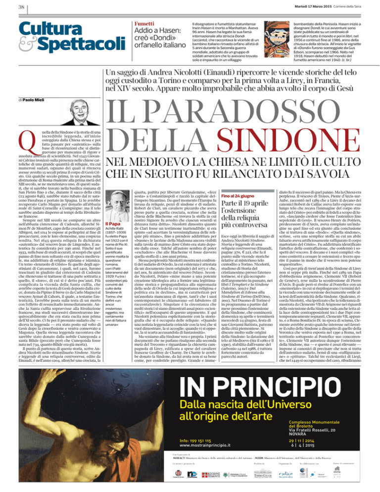Martedì 17 Marzo 2015 Corriere della Sera 38 Cultura & Spettacoli Fumetti Addio a Hasen: creò «Dondi» orfanello italiano Il disegnatore e fumettista statunitense Irwin Hasen è morto a Manhattan. Aveva 96 anni. Hasen ha legato la sua fama internazionale alla striscia Dondi (accanto), che raccontava le vicende di un bambino italiano rimasto orfano all’età di 5 anni durante la Seconda guerra mondiale, adottato da un gruppo di soldati americani che lo avevano trovato solo e impaurito in un villaggio bombardato della Penisola. Hasen iniziò a disegnare Dondi, le cui avventure sono state pubblicate su un centinaio di giornali in tutto il mondo e poi in libri, nel 1956 e continuò fino al 1986, anno della chiusura della striscia. All’inizio le vignette di «Dondi» furono sceneggiate da Gus Edson, scomparso nel 1966. Nato nel 1918, Hasen debuttò nel mondo del fumetto americano nel 1940. (c. br.) Un saggio di Andrea Nicolotti (Einaudi) ripercorre le vicende storiche del telo oggi custodito a Torino e comparso per la prima volta a Lirey, in Francia, nel XIV secolo. Appare molto improbabile che abbia avvolto il corpo di Gesù di Paolo Mieli Q uella della Sindone è la storia di una incredibile leggenda, all’inizio osteggiata dalla Chiesa stessa e poi fatta passare per «autentica» sulla base di ricostruzioni che si distinguevano per mancanza di rigore e assoluta assenza di scientificità. Nel 1543 Giovanni Calvino ironizzò sulla presenza nelle chiese cattoliche di una grande quantità di reliquie, tra cui numerosi sudari, ognuno dei quali si riteneva avesse avvolto 15 secoli prima il corpo di Gesù Cristo. Già qualche secolo prima, in un poema sulla distruzione di Roma risalente alla prima metà del XIII secolo, se ne menzionava uno, di questi sudari, che si sarebbe trovato nella basilica romana di San Pietro fino a che, durante il sacco della città (23 agosto 846), sarebbe stato rubato dal re saraceno Fierabras e portato in Spagna. Lì lo avrebbe recuperato Carlo Magno per donarlo all’abbazia reale di Saint-Corneille a Compiègne: ma il telo sarebbe andato disperso ai tempi della Rivoluzione francese. Sempre nel XIII secolo ne comparve un altro nell’abbazia cistercense di Cadouin, allorché Simon IV de Montfort, capo della crociata contro gli Albigesi, nel 1214 lo espose ai pellegrini al fine di procacciarsi, con le loro elemosine, una cospicua rendita. Nel 1643 questa reliquia fu dichiarata «autentica» dal vescovo Jean de Lingendes. E autentica fu considerata per 290 anni. Finché nel 1933, sulla base di studi accurati, si scoprì che quel panno di lino non soltanto era di epoca medievale, ma addirittura di origine egiziana e islamica. Un terzo «lenzuolo di Cristo» fu quello degli agostiniani di Carcassonne, i quali, nel 1402, furono trascinati in giudizio dai cistercensi di Cadouin che ritenevano si trattasse di una parte sottratta a quello, il «loro», di cui si è detto poc’anzi. Più complicata la vicenda della Santa cuffia, che avrebbe coperto la testa di Gesù deposto dalla croce, donata da Pipino il breve (o da Carlo Magno) al vescovo Aymat di Cahors, il quale, a testarne l’autenticità, l’avrebbe posta sulla testa di un morto con l’effetto di resuscitarlo immediatamente. Anche la Santa cuffia sopravvisse alla Rivoluzione francese, ma studi successivi dimostrarono inequivocabilmente che era stata cucita non prima dell’XI secolo. Ci fu poi il presunto sudario che — diceva la leggenda — era stato posto sul volto di Gesù dopo la crocefissione e veniva conservato a Magonza. Quella stessa leggenda raccontava che sarebbe stato donato dalla nobile Cunegonda a santa Bilide (peccato però che Cunegonda fosse nata nel 734, quanto Bilide era già morta). Il punto di partenza di questa storia, scrive Andrea Nicolotti nello straordinario Sindone. Storia e leggende di una reliquia controversa, edito da Einaudi, è nell’anno 1204, allorché una crociata, la IL PARADOSSO DELLA SINDONE NEL MEDIOEVO LA CHIESA NE LIMITÒ IL CULTO CHE IN SEGUITO FU RILANCIATO DAI SAVOIA ll Papa Achille Ratti (1857-1939) fu eletto Papa nel 1922 con il nome di Pio XI. Sotto il suo pontificato venne risolta la questione romana, con i Patti lateranensi del 1929. Fu tra i sostenitori più convinti del culto della Sindone di Torino, che definì «un ancor misterioso oggetto, ma certamente non di fattura umana» quarta, partita per liberare Gerusalemme, «fece sosta» a Costantinopoli e razziò la capitale dell’impero bizantino. Da quel momento l’Europa fu invasa da reliquie, pezzi di sindone e di sudario. Robert de Clari, un cavaliere piccardo che aveva preso parte a quella crociata, scrisse che nella chiesa delle Blacherne «si trovava la stoffa in cui nostro Signore fu avvolto che ciascun venerdì si drizzava tutta dritta». Nicolotti dimostra quanto de Clari fosse un testimone inattendibile: si era spinto «ad accettare la verosimiglianza delle reliquie più strane», fino a prendere addirittura per «buone» le lacrime della Madonna ancora visibili sulla tavola di marmo dove Cristo era stato deposto dalla croce. Talché all’autore sembra di poter «escludere» che alle Blacherne vi fosse davvero quella stoffa di 1.200 anni prima. Stessa perplessità Nicolotti mostra nei confronti del sudario di Oviedo, la cui esistenza è attestata da un documento (non originale) del 1075 e che, nel 1101, fu autenticato dal vescovo Pelayo. Secondo Nicolotti, Pelayo «mise mano a una potente creazione ideologica atta a fornire una legittimazione storica e propagandistica alla supremazia della sede di Oviedo la cui importanza religiosa e politica era in declino», ma si caratterizzò per un’assoluta mancanza di rigore, tant’è che i suoi contemporanei lo chiamavano «el fabulero» (il raccontafavole). Singolare è la circostanza che molti storici si siano dimostrati assai poco «scientifici» nell’occuparsi di questo argomento. E qui Nicolotti polemizza esplicitamente con la storiografia che