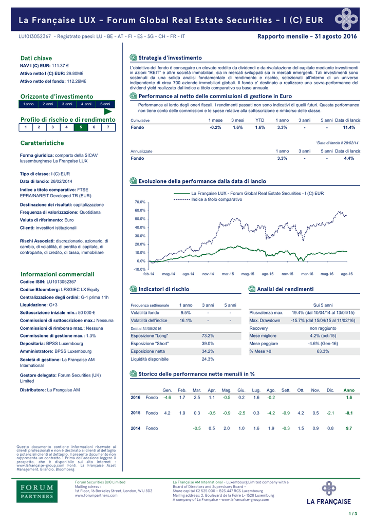 La Française LUX - Forum Global Real Estate Securities - I (C) EUR Rapporto mensile - 31 agosto 2016 LU1013052367 - Registrato paesi: LU - BE - AT - FI - ES - SG - CH - FR - IT Strategia d'investimento Dati chiave NAV I (C) EUR: 111.37 € L'obiettivo del fondo è conseguire un elevato reddito da dividendi e da rivalutazione del capitale mediante investimenti in azioni “REIT” e altre società immobiliari, sia in mercati sviluppati sia in mercati emergenti. Tali investimenti sono sostenuti da una solida analisi fondamentale di rendimento e rischio, selezionati all'interno di un universo indipendente di circa 700 aziende immobiliari globali. Il fondo e’ destinato a realizzare una sovra-performance del dividend yield realizzato dal indice a titolo comparativo su base annuale. Attivo netto I (C) EUR: 29.80M€ Attivo netto del fondo: 112.26M€ Performance al netto delle commissioni di gestione in Euro Orizzonte d'investimento 5 1 anno 2 anni 3 anni 4 anni 5 anni Profilo di rischio e di rendimento 1 2 3 4 5 6 7 TabPerformance al lordo degli oneri fiscali. I rendimenti passati non sono indicativi di quelli futuri. Questa performance non tiene conto delle commissioni e le spese relative alla sottoscrizione e rimborso delle classe. Cumulative 1 mese 3 mesi YTD 1 anno 3 anni -0.2% 1.6% 1.6% 3.3% - Fondo 5 anni Data di lancio - Caratteristiche 11.4% *Data di lancio il 28/02/14 Forma giuridica: comparto della SICAV lussemburghese La Française LUX Annualizzate 1 anno 3 anni 3.3% - Fondo 5 anni Data di lancio - 4.4% Tipo di classe: I (C) EUR Data di lancio: 28/02/2014 Evoluzione della performance dalla data di lancio Indice a titolo comparativo: FTSE EPRA/NAREIT Developed TR (EUR) Destinazione dei risultati: capitalizzazione GraphPerfEnEUr La Française LUX - Forum Global Real Estate Securities - I (C) EUR Indice a titolo comparativo 70.0% Frequenza di valorizzazione: Quotidiana 60.0% Valuta di riferimento: Euro 50.0% Clienti: investitori istituzionali 40.0% 30.0% Rischi Associati: discrezionario, azionario, di cambio, di volatilità, di perdita di capitale, di controparte, di credito, di tasso, immobiliare 20.0% 10.0% 0.0% Informazioni commerciali -10.0% feb-14 mag-14 ago-14 nov-14 mar-15 mag-15 ago-15 nov-15 mar-16 mag-16 ago-16 Codice ISIN: LU1013052367 Codice Bloomberg: LFSGIEC LX Equity Indicatori di rischio Analisi dei rendimenti Centralizzazione degli ordini: G-1 prima 11h IndicateurRisque_Forum AnalyseRendement_ExIndice Liquidazione: G+3 Frequenza settimanale 1 anno 3 anni 5 anni Sottoscrizione iniziale min.: 50 000 € Volatilità fondo 9.5% - - Plusvalenza max. 19.4% (dal 10/04/14 al 13/04/15) Commissioni di sottoscrizione max.: Nessuna Volatilità dell'indice 16.1% - - Max. Drawdown -15.7% (dal 15/04/15 al 11/02/16) Sui 5 anni Recovery non raggiunto Commissioni di rimborso max.: Nessuna Dati al 31/08/2016 Commissione di gestione max.: 1.3% Esposizione "Long" 73.2% Mese migliore 4.2% (oct-15) Depositaria: BPSS Luxembourg Esposizione "Short" 39.0% Mese peggiore -4.6% (Gen-16) Amministratore: BPSS Luxembourg Esposizione netta 34.2% % Mese >0 Società di gestione: La Française AM International Liquidità disponibile 24.3% Gestore delegato: Forum Securities (UK) Limited Storico delle performance nette mensili in % HistPerfMens_E Distributore: La Française AM Questo documento contiene informazioni riservate ai clienti professionali e non è destinato ai clienti al dettaglio o potenziali clienti al dettaglio. Il presente documento non rappresenta un contratto - Prima dell'adesione leggere il prospetto, che è disponibile sul sito internet : www.lafrançaise-group.com Fonti: La Française Asset Management, Bilancio, Bloomberg 63.3% 1 31 2 28 3 31 4 30 5 31 6 30 7 31 8 31 Gen. Feb. Mar. Apr. Mag. Giu. Lug. Ago. 9 30 Sett. 10 31 Ott. 11 30 Nov. 12 31 Dic. Anno 2016 Fondo -4.6 1.7 2.5 1.1 -0.5 0.2 1.6 -0.2 2015 Fondo 4.2 1.9 0.3 -0.5 -0.9 -2.5 0.3 -4.2 -0.9 4.2 0.5 -2.1 -0.1 2014 Fondo -0.5 0.5 2.0 1.0 1.6 1.9 -0.3 1.5 0.9 0.8 9.7 1.6 Fondo Fondo Forum Securities (UK) Limited Mailing adress : 1st Floor, 16 Berkeley Street, London, W1J 8DZ www.forumpartners.com La Française AM International - Luxembourg Limited company with a Board of Directors and Supervisory Board – Share capital €2 525 000 – B23.447 RCS Luxembourg Mailing address: 2, Boulevard de la Foire L- 1528 Luxemburg A company of La Française - www.lafrancaise-group.com 1/3 La Française LUX - Forum Global Real Estate Securities - I (C) EUR Rapporto mensile - 31 agosto 2016 LU1013052367 - Registrato paesi: LU - BE - AT - FI - ES - SG - CH - FR - IT Portafoglio Long StrucPortfeuille_Long Ripartizione settoriale In % dell'attivo netto ExpoSecto_LongShort Settore immobiliare Esposizione Long/Short Retail Edilizia Privilegiate: 6.1% REOC: 12.6% Liquidità: 26.8% Esposizione valuta Expodevise_Engag EUR SGD HKD CAD GBP JPY AUD MXN CNY NOK SEK Option USD Option 3.2% 4.3% -1.1% -4.0% -4.0% Ripartizione per area geografica Esposizione netta RépartGeo_LongShort Esposizione Long/Short 39.8% 7.4% 7.4% 4.0% 3.2% 2.8% 2.5% 1.8% 0.7% 0.0% America del Nord -15.3% Regno Unito -0.6% 4.6% 5.5% 11.5% 0.1% 70.5% 52.9% 27.7% 18.1% 1.8% Indice Statistiche del portafoglio 2.8% Giappone -5.3% 8.1% Cina+HK -3.0% 10.2% -3.9% 10.7% 8.2% 6.3% Principali linee (monetari esclusi) PrincipalesLignes Denominazione Settore Paese Cheung Kong Property Diversificati Hong Kong 2.4% Stockland (Aud) Diversificati Australia 2.3% Retail Francia 2.2% Mitsui Fudosan Co Ltd Diversificati Giappone 2.1% Care Capital Properties Inc Sanità Stati Uniti 2.0% Digital Realty Trust Inc Pref. Specialità e Immagazzinamento Stati Uniti 2.0% Mapletree Greater China Comm (Sgd) Diversificati Singapore 1.9% Frasers Logistics & Industrial Industriale e ufficio Singapore 1.9% British Land Co Plc Diversificati Regno Unito 1.8% Keppel Reit Industriale e ufficio Singapore 1.7% Numero di titoli in portafoglio 90 Nuove posizioni Numero di posizioni long 61 CyrusOne / USA % attivo alla dat
