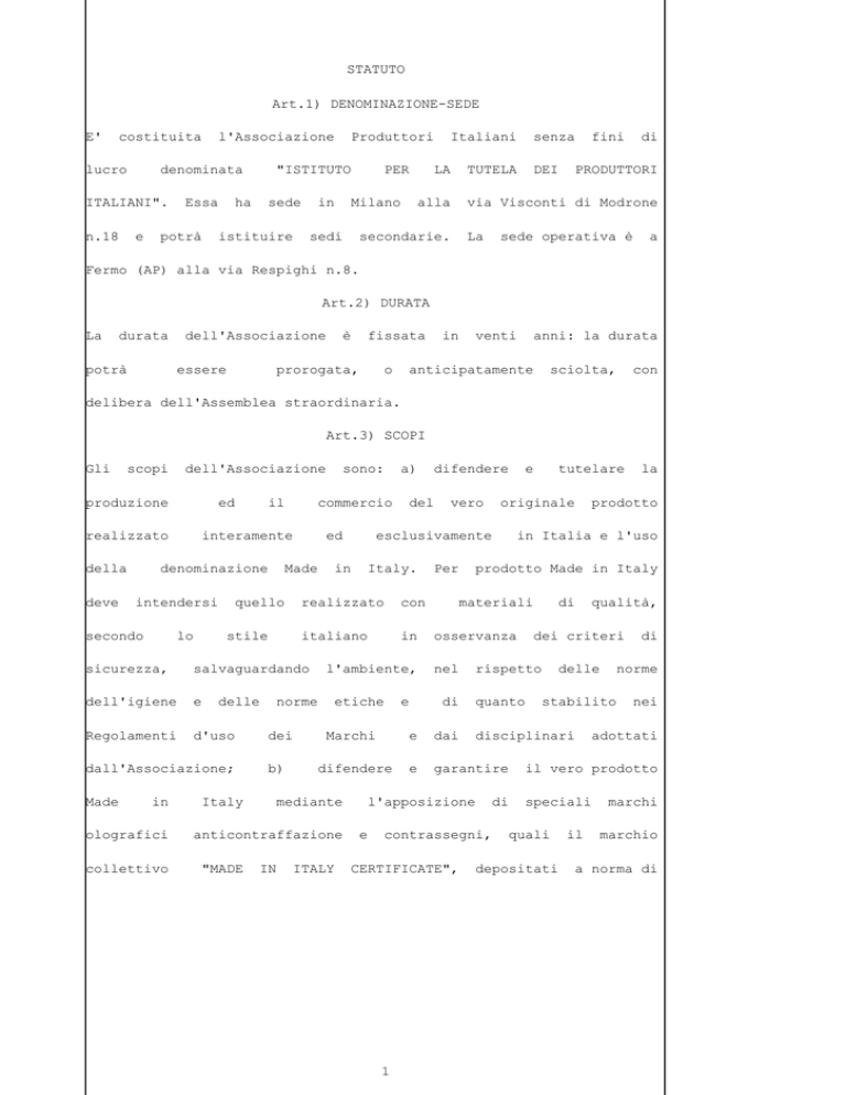 STATUTO Art.1) DENOMINAZIONE-SEDE E' costituita lucro l'Associazione denominata ITALIANI". n.18 e Essa "ISTITUTO ha potrà Produttori sede in PER istituire Italiani LA Milano sedi senza TUTELA alla DEI fini di PRODUTTORI via Visconti di Modrone secondarie. La sede operativa è a Fermo (AP) alla via Respighi n.8. Art.2) DURATA La durata potrà dell'Associazione essere è fissata prorogata, o in venti anni: la durata anticipatamente sciolta, con delibera dell'Assemblea straordinaria. Art.3) SCOPI Gli scopi dell'Associazione produzione ed realizzato della deve il denominazione secondo lo ed Made quello stile Regolamenti d'uso Made in olografici collettivo l'ambiente, norme etiche e Per materiali osservanza nel di difendere e garantire ITALY di norme stabilito nei adottati il vero prodotto di contrassegni, 1 delle disciplinari l'apposizione CERTIFICATE", qualità, dei criteri quanto b) IN di rispetto dai e prodotto prodotto Made in Italy e anticontraffazione la in Italia e l'uso Marchi mediante tutelare originale dei Italy "MADE Italy. in e dall'Associazione; in italiano dell'igiene vero e esclusivamente con salvaguardando difendere del realizzato sicurezza, delle a) commercio interamente intendersi sono: speciali quali depositati il marchi marchio a norma di legge; c) attuare perfezionamento Made in ed Italy, di vigilanza sulla Italy, agli carattere contrassegni tecnico; della e associativi, irregolarità a per e giudiziarie e/o favorire, organizzare quanto valorizzare il esercitare commercio impedire degli degli del marchi e tutte quelle legge; ed abusi dei o dei diritti anche azioni e) promuovere, iniziative italiano Made e reprimere promuovendo dalla di prodotto dei e consentito prodotto un'attività interessi associati, prodotto del al necessarie direttive ed denominazione, danno dell'Associazione le d) sul sua tendenti qualitativo associati produzione sull'uso iniziative miglioramento dando assistenza in al opportune a accrescerne la ad intese rinomanza in Italia ed all'estero. Art.4) OGGETTO L'Associazione il Made promuove valorizzare in Italy, e con archivi, diffusione di ed nonchè all'estero; - Italy); valorizzare la individuare, qualificate opportunità - istituire e riviste per la convegni, dibattiti, incontri, missioni economiche in Italia e sulle centri e e/o 2 mezzo imprese organizzare gestire e - notiziari, sulle delegazioni - a azione internazionali; lettere, informazioni imprenditoriali; in segnalare interne studi, qualsiasi (Made e imprenditoriali intesa assumendo i seguenti compiti: - tutelare, nazionale selezionare ed iniziativa promuovere produzione riunioni ogni iniziative promuovere corsi di istruzione tecnico-professionale, coordinamento gli enti delle qualificazione attività locali, regionali e concorrere promuovere elevato contenuto e imprenditoriali perfezionamento, e statali alla innovativo e culturali pubblici attivazione di e con privati; - di iniziative ad processi, di prodotto e di organizzazione sia in Italia che all'estero. Art.5) SOCI Possono essere ammessi all'Associazione facciano richiesta, requisiti previsti dalla statuto. Inoltre sono soci enti pubblici dell'Associazione. del Made tutti Gli in i soci, purchè ne produttori italiani che hanno i lett. italy, quali a) a dell'art.3 del presente pieno titolo interessati possono richiedere i fondatori ai problemi di far parte dell'Associazione in qualità di soci sostenitori. Art.6) AMMISSIONE DEI SOCI La domanda Consiglio di ammissione Direttivo Consiglio Direttivo Tecnico di a socio deve essere presentata al dell'Associazione. su settore. conforme Il Sulla parere nuovo domanda consultivo decide del il Comitato ammesso sarà iscritto nel libro soci all'atto della relativa delibera del Consiglio Direttivo. Art.7) OBBLIGHI DEL SOCIO I soci hanno regolamento prese dallo dagli stabiliti l'obbligo: a stesso Organi norma a) previsto sociali; del di e osservare di b) lo attenersi di versare statuto, il alle delibere i contributi presente statuto; c) di utilizzare i 3 marchi ed i contrassegni definiti dall'Associazione. Art.8) DIRITTI DEL SOCIO Fermi restando gli all'Associazione dà contrassegni ed in sempre Italy, (salvo obblighi i diritto marchi in socio produzione questa rispetto inderogabili, cui all'art.7, l'appartenenza al di che il di materia); ottenere: della risponda delle di produzione i Made alle norme regolamentari normative b) a) le di legge, anche assistenze ed i vantaggi previsti dal presente Statuto. Art.9) PERDITA DELLA QUALITA' DI SOCIO La qualità di socio esclusione. Il recesso l'attività o al è socio sia pervenire all'Associazione dandosi comunque salvo inviata successivo ancora determinato Consiglio quel o il che regolamentare all'immagine dei su si giorni o del di reso altri di che novanta novanta qualsiasi dalla La data dovrà giorni, giorni, eventuale residuo dell'evento decadenza parere del è che ha deliberata Comitato dal Tecnico, a colpevole di infrazione statutaria atti marchio A.R. comunicazione dovrà essere fatta conforme sia che abbia cessato detti di recesso. Direttivo socio decorso 60 decadenza ed il recesso sarà efficace solo per relativa entro socio preavviso che La dall'interessato un pagamento dovuto. al recesso, raccomandata con al il per che ne faccia richiesta, purché tale mediante atto sempre perde consentito richiesta l'esercizio si che e 4 abbiano arrecato nocumento dell'Associazione. Contro le deliberazioni prese ricorrere, a entro norma provvedimento, trenta al La qualunque non dei contributi e giorni dei perdita versati alcun comunicazione qualità alcun né l'interessato Probiviri della comporta 9 dalla Collegio inappellabilmente. motivo, dell'art.6 diritto che di del decide socio, alla può per restituzione diritto alla liquidazione di quota del Fondo sociale. Art.10) FONDO SOCIALE Il fondo sociale è costituito: a)dalle quote di amministrazione dei soci; b)dai versamenti versamenti effettuati ulteriori di dai detti fondatori fondatori e da originari, dai qu