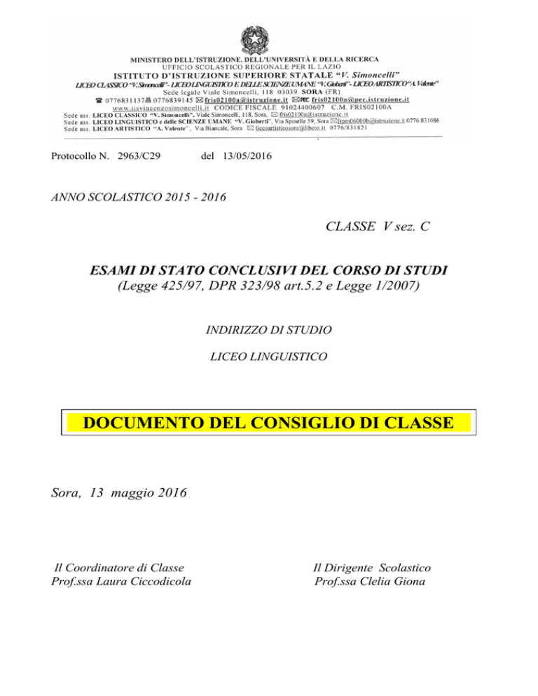 Protocollo N. 2963/C29 del 13/05/2016 ANNO SCOLASTICO 2015 - 2016 CLASSE V sez. C ESAMI DI STATO CONCLUSIVI DEL CORSO DI STUDI (Legge 425/97, DPR 323/98 art.5.2 e Legge 1/2007) INDIRIZZO DI STUDIO LICEO LINGUISTICO vvv DOCUMENTO DEL CONSIGLIO DI CLASSE Sora, 13 maggio 2016 Il Coordinatore di Classe Prof.ssa Laura Ciccodicola Il Dirigente Scolastico Prof.ssa Clelia Giona INDICE DEL DOCUMENTO Presentazione dell’Istituto Caratteri specifici dell’Indirizzo e profilo professionale in uscita Presentazione del Consiglio di Classe Orario settimanale delle lezioni nel triennio Elenco studenti Profilo della classe - Storia della classe nel triennio - Continuità didattica nel triennio - Situazione di partenza nel corrente anno scolastico Percorso formativo realizzato sulla base della progettazione collegiale Obiettivi definiti nella programmazione del Consiglio di classe - Obiettivi trasversali formativo – cognitivi - Conoscenze, competenze e capacità acquisite nell’ambito disciplinare Obiettivi perseguiti/raggiunti in termini di conoscenze, competenze e capacità per area linguistica Scheda informativa generale del Consiglio di Classe Obiettivi minimi Attività extra – para- interculturali Metodologie didattiche seguite Materiali e strumenti didattici utilizzati Strumenti di verifica e valutazione Griglia per il criterio di valutazione Griglia per il metodo di misurazione del profitto finalizzato all’espressione del giudizio Simulazioni prove di Esame (calendario) Situazione finale della classe nel corrente anno scolastico Griglia di valutazione: Italiano Griglia di valutazione: Lingua straniera (seconda prova scritta) Griglia di valutazione: Terza prova scritta Griglia di valutazione: Colloquio Griglie di valutazione Esabac Simulazioni Esame di Stato Programmi Relazioni 2 PRESENTAZIONE DELL’ISTITUTO Il nostro Istituto ha ben presente che il suo ruolo è finalizzato a: a) formare la persona. Formare significa orientare, sviluppare la capacità di conoscere se stessi e di strutturare la propria personalità, di costruire percorsi formativi autonomi. La scuola deve guidare e sostenere il giovane nella sua crescita aiutandolo a misurare i punti di forza e gli ambiti di miglioramento, a relazionarsi, a fronteggiare il nuovo, a compiere le scelte, ad individuare/inventare le adeguate strategie per vivere serenamente il proprio rapporto con la società. b) educare alla cittadinanza attiva. Educare il cittadino ad esercitare diritti ed a riconoscere e a rispettare doveri è compito precipuo della scuola, che si intreccia con quello di istruire. Alla scuola la società chiede di affiancare la famiglia nel difficile il compito di una educazione che si fondi sulle virtù civili della giustizia, della tolleranza, della solidarietà, della legalità, del rispetto e della valorizzazione delle diversità. c) istruire al lavoro. Insegnare la cultura e la tecnica, compiere l’esercizio intellettuale e realizzare il prodotto concreto, imparare ad essere consapevoli di sé e ad interagire proficuamente con gli altri, di fatto la scuola incoraggia nei propri studenti la costruzione di un proprio autonomo percorso di realizzazione del sé e prepara all’ingresso nel mondo del lavoro, orienta a scelte di vita. CONTRATTO FORMATIVO La classe è stata invitata a riflettere sulla necessità di darsi e riconoscere delle regole di comportamento per una civile convivenza sociale. Si è trattato di ‘contrattare’ con gli studenti gli orientamenti indicati nel POF e di adattarli alla realtà della classe V sezione D. Dal confronto, in un primo momento informale e formale poi, il gruppo ha elaborato un insieme di obiettivi, da perseguire, e di regole condivise, da rispettare nei rapporti interpersonali alunnoalunno/i e alunno/i-docente/i, che si riportano fedelmente : Tenere un contegno corretto e rispettoso nei confronti di tutto il personale della scuola e dei propri compagni. Prendere coscienza dei personali diritti e doveri e rispettare persone, ambienti ed attrezzature. Conoscere e rispettare il regolamento d’Istituto. Presentarsi con puntualità alle lezioni. Rispettare i tempi di consegna dei lavori assegnati. Spegnere i cellulari e gli altri dispositivi elettronici durante le ore di lezione (C.M. 15/03/07). Usare un linguaggio consono all’ambiente educativo in cui si vive e si opera. Evitare comportamenti ed atteggiamenti di bullismo. Evitare di provocare danni a cose, persone, suppellettili ed al patrimonio della Scuola. Gli alunni dovranno indennizzare il danno prodotto. 3 Chiedere di uscire dalla classe solo in caso di necessità e non più di uno per volta. Avere consapevolezza della valutazione: o conoscere le modalità e la scansione temporale delle verifiche; o conoscere i criteri di misurazione e valutazione. Il Consiglio di Classe si è proposto di far acquisire e conseguire alle alunne, al termine del percorso di studi, le competenze chiave di cittadinanza indicate, in modo da favorire il pieno sviluppo: - della persona nella costruzione del sé; - di corrette e significative relazioni con gli altri; - di una positiva interazione con la realtà naturale e sociale. CARATTERI SPECIFICI DELL’INDIRIZZO Il Liceo Linguistico è caratterizzato dalla presenza di tre lingue straniere e di una quarta a richiesta, in un contesto formativo completato dalle discipline letterarie, filosofiche, matematiche e scientifiche, con esperienze pratiche nei laboratori specializzati di cui l’Istituto è fornito. La caratterizzazione linguistica dell’indirizzo è potenziata dallo studio delle civiltà e delle culture straniere, dalle conversazioni con le insegnanti in madre–lingua, da scambi culturali. Concorre alla formazione linguistica l’utilizzo di specifici laboratori linguistici e multimediali, con riferimento al QRE (Quadro di Riferimento Europeo), con il raggiungimento del livello B2 al termine del quinquennio. Il diploma del Liceo Linguistico garantisce l’accesso a tutte le facoltà univer