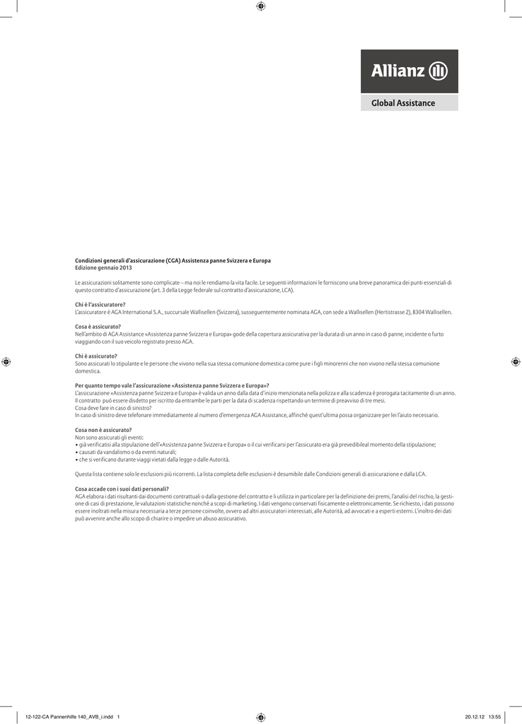 Condizioni generali d’assicurazione (CGA) Assistenza panne Svizzera e Europa Edizione gennaio 2013 Le assicurazioni solitamente sono complicate – ma noi le rendiamo la vita facile. Le seguenti informazioni le forniscono una breve panoramica dei punti essenziali di questo contratto d’assicurazione (art. 3 della Legge federale sul contratto d’assicurazione, LCA). Chi è l‘assicuratore? L’assicuratore è AGA International S.A., succursale Wallisellen (Svizzera), susseguentemente nominata AGA, con sede a Wallisellen (Hertistrasse 2), 8304 Wallisellen. Cosa è assicurato? Nell’ambito di AGA Assistance «Assistenza panne Svizzera e Europa» gode della copertura assicurativa per la durata di un anno in caso di panne, incidente o furto viaggiando con il suo veicolo registrato presso AGA. Chi è assicurato? Sono assicurati lo stipulante e le persone che vivono nella sua stessa comunione domestica come pure i figli minorenni che non vivono nella stessa comunione domestica. Per quanto tempo vale l’assicurazione «Assistenza panne Svizzera e Europa»? L’assicurazione «Assistenza panne Svizzera e Europa» è valida un anno dalla data d’inizio menzionata nella polizza e alla scadenza è prorogata tacitamente di un anno. Il contratto può essere disdetto per iscritto da entrambe le parti per la data di scadenza rispettando un termine di preavviso di tre mesi. Cosa deve fare in caso di sinistro? In caso di sinistro deve telefonare immediatamente al numero d’emergenza AGA Assistance, affinché quest‘ultima possa organizzare per lei l’aiuto necessario. Cosa non è assicurato? Non sono assicurati gli eventi: • già verificatisi alla stipulazione dell’«Assistenza panne Svizzera e Europa» o il cui verificarsi per l’assicurato era già prevedibileal momento della stipulazione; • causati da vandalismo o da eventi naturali; • che si verificano durante viaggi vietati dalla legge o dalle Autorità. Questa lista contiene solo le esclusioni più ricorrenti. La lista completa delle esclusioni è desumibile dalle Condizioni generali di assicurazione e dalla LCA. Cosa accade con i suoi dati personali? AGA elabora i dati risultanti dai documenti contrattuali o dalla gestione del contratto e li utilizza in particolare per la definizione dei premi, l’analisi del rischio, la gestione di casi di prestazione, le valutazioni statistiche nonché a scopi di marketing. I dati vengono conservati fisicamente o elettronicamente. Se richiesto, i dati possono essere inoltrati nella misura necessaria a terze persone coinvolte, ovvero ad altri assicuratori interessati, alle Autorità, ad avvocati e a esperti esterni. L’inoltro dei dati può avvenire anche allo scopo di chiarire o impedire un abuso assicurativo. 12-122-CA Pannenhilfe 140_AVB_i.indd 1 20.12.12 13:55 Condizioni generali di assicurazione (CGA) Edizione gennaio 2013 La copertura assicurativa garantita da AGA International SA, succursale Wallisellen (Svizzera), susseguentemente nominata AGA, è definita dalla polizza d’assicurazione e dalle Condizioni generali d’assicurazione (CGA) riportate qui di seguito. I Disposizioni comuni per tutte le componenti dell’assicurazione Le disposizioni comuni per tutte le componenti dell’assicurazione valgono solo se nelle disposizioni particolari delle singole componenti dell’assicurazione oppure delle prestazioni di servizio non sono previste disposizioni diverse. 1 1.1 Persone assicurate Sono assicurati lo stipulante e le persone che vivono nella sua comunione domestica come pure i figli minorenni che non vivono nella stessa comunione domestica. Sono assicurate le persone di cui al punto I 1.1, con domicilio permanente in Svizzera. 1.2 2 2.1 2.2 Validità territoriale L’assicurazione è valida in Svizzera, nel Principato del Liechtenstein e in Europa. L’assicurazione è valida un anno a partire dalla data d’inizio menzionata nella polizza e alla scadenza è prorogata tacitamente di anno in anno. Il contratto di assicurazione può essere disdetto per iscritto da entrambe le parti per la data di scadenza rispettando un termine di preavviso di tre mesi. 3 3.1 3.2 3.4 3.5 Obblighi in caso di sinistro La persona assicurata è tenuta a fare tutto il possibile per contribuire a limitare il danno e a chiarire il caso. La persona assicurata è tenuta ad adempiere interamente ai propri obblighi contrattuali o legali di notifica, informazione o comportamento (tra cui la notifica immediata dell’evento assicurato all’indirizzo di contatto indicato nelle disposizioni comuni). Se il sinistro si è verificato in seguito a malattia o infortunio, la persona assicurata deve provvedere ad esonerare i medici curanti dal loro obbligo di segretezza professionale nei confronti di AGA. Se la persona assicurata può fare valere anche nei confronti di terzi le prestazioni già fornite da AGA, essa è tenuta a salvaguardare tali diritti e a cederli ad AGA. Qui di seguito sono elencati i documenti che devono essere trasmessi ad AGA all’indirizzo indicato nelle disposizioni comuni: •attestato di assicurazione (polizza) •documenti di trasporto (biglietti aerei, biglietti ferroviari), biglietti d’ingresso, ricevute ecc. (originali) •ricevute delle spese impreviste (originali) •documenti, ovvero certificati che attestano il verificarsi del danno (ad es. rapporto della polizia) •fatture delle spese supplementari assicurate (originali) •verbale di accertamento dei fatti 4 Violazione degli obblighi Qualora la persona assicurata violi i propri obblighi, AGA potrà ridurre o rifiutare le proprie prestazioni. 5 5.1 Eventi non assicurati Se un evento si era già verificato al momento della stipulazione del contratto o se la persona assicurata al momento della stipulazione del contratto poteva già prevederne il verificarsi, non sussiste alcun diritto alla prestazione. Non sono assicurati quegli eventi che la persona assicurata ha provocato come segue: •abuso di alcool, droghe o medicinali •suic