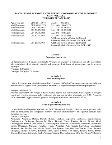 DISCIPLINARE DI PRODUZIONE DEI VINI A DENOMINAZIONE DI ORIGINE CONTROLLATA “NURAGUS DI CAGLIARI” Approvato con Modificato con Modificato con Modificato con Modificato con Modificato con DPR 28.11.1974 DPR 06.02.1979 DPR 11.05.1987 DM 30.03.2001 DM 04.11.2011 DM 30.11.2011 Modificato con DM 26.11.2013 G.U. 66 - 10.03.1975 G.U. 166 - 19.06.1979 G.U. 245 - 20.10.1987 G.U. 102 - 04.05.2001 G.U. 270 – 19.11.2011 G.U. 295 – 20.12.2011 Pubblicato sul sito ufficiale del Mipaaf Sezione Qualità e Sicurezza Vini DOP e IGP Pubblicato sul sito ufficiale del Mipaaf Sezione Qualità e Sicurezza Vini DOP e IGP Articolo 1 Denominazione e vini La denominazione di origine controllata “Nuragus di Cagliari” è riservata ai vini che rispondono alle condizioni ed ai requisiti stabiliti dal presente disciplinare di produzione, per le seguenti tipologie: “Nuragus di Cagliari” “Nuragus di Cagliari” frizzante. Articolo 2 Base ampelografica I vini a denominazione di origine controllata “Nuragus di Cagliari” devono essere ottenuti dalle uve provenienti dai vigneti aventi, nell'ambito aziendale, la seguente composizione ampelografica: Nuragus: minimo 85%; possono concorrere altri vitigni a bacca bianca idonei alla coltivazione nella regione Sardegna, iscritti nel registro nazionale delle varietà di vite per uve da vino approvato con D.M. 7 maggio 2004 e successivi aggiornamenti, presenti nei vigneti sino ad un massimo del 15 %. Articolo 3 Zona di produzione delle uve Le uve destinate alla produzione dei vini DOC “Nuragus di Cagliari”, devono essere prodotti nella zona di produzione che comprende l'intero territorio amministrativo dei seguenti comuni nelle rispettive province: Provincia di Cagliari: Armungia, Assemini, Ballao, Barrali, Burcei, Cagliari, Capoterra, Castiadas, Decimomannu, Decimoputzu, Dolianova, Domus De Maria, Donori, Elmas, Escolca, Gergei, Gesico, Goni, Guamaggiore, Guasila, Isili, Mandas, Maracalagonis, Monastir, Monserrato, Muravera, Nuraminis, Orroli, Ortacesus, Nuragus, Nurallao, Nurri, Pimentel, Pula, Quartu Sant'Elena, Quartucciu, Samatzai, San Basilio, San Nicolò Gerrei, San Sperate, San Vito, Sant'Andrea Frius, Sarroch, Selargius, Selegas, Senorbì, Serdiana, Serri, Sestu, Settimo San Pietro, Siliqua, Silius, Sinnai, Siurgus Donigala, Soleminis, Suelli, Teulada, Ussana, Uta, Vallermosa, Villa San Pietro, Villaputzu, 1 Villasalto, Villasimius, Villasor, Villaspeciosa. Provincia Carbonia Iglesias: Buggerru, Calasetta, Carbonia, Carloforte, Domusnovas, Fluminimaggiore, Giba, Gonnesa, Iglesias, Masainas, Musei, Narcao, Nuxis, Perdaxius, Piscinas, Portoscuso, San Giovanni Suergiu, Santadi, Sant'Anna Arresi, Sant'Antioco, Tratalias, Villamassargia, Villaperuccio. Provincia Medio Campidano Arbus, Barumini, Collinas, Furtei, Genuri, Gesturi, Gonnosfanadiga, Guspini, Las Plassas, Lunamatrona, Pabillonis, Pauli Arbarei, Samassi, San Gavino Monreale, Sanluri, Sardara, Segariu, Serramanna, Serrenti, Setzu, Siddi, Tuili, Turri, Ussaramanna, Villacidro, Villamar, Villanovaforru, Villanovafranca. Provincia di Oristano: Abbasanta, Aidomaggiore, Albagiara, Ales, Allai, Arborea, Ardauli, Assolo, Asuni, Baradili, Baratili San Pietro, Baressa, Bauladu, Bidonì, Bonarcado Boroneddu, Busachi, Cabras, Fordongianus, Genoni, Ghilarza, Gonnoscodina, Gonnosnò, Gonnostramatza, Marrubiu, Masullas, Milis, Mogorella, Mogoro, Morgongiori, Narbolia, Neoneli, Norbello, Nughedu Santa Vittoria, Nurachi, Nureci, Ollastra Simaxis, Oristano, Palmas Arborea, Pau, Paulilatino, Pompu, Riola Sardo, Ruinas, Samugheo, San Nicolò d'Arcidano, San Vero Milis, Santa Giusta, Santu Lussurgiu, Sedilo, Seneghe, Senis, Sennariolo, Siamaggiore, Siamanna, Siapiccia, Simala, Simaxis, Sini, Siris, Solarussa, Sorradile, Tadasuni, Terralba, Tramatza, Ulà Tirso, Uras, Usellus, Villa Sant'Antonio, Villa Verde, Villanova Truschedu, Villaurbana, Zeddiani, Zerfaliu. Articolo 4 Norme per la viticoltura Le condizioni ambientali e di coltura dei vigneti destinati alla produzione dei vini di cui all'art.1 devono essere quelle tradizionali della zona e atte a conferire alle uve ed ai vini le specifiche caratteristiche di qualità. I sesti di impianto, le forme di allevamento ed i sistemi di potatura devono essere tali da consentire l'ottenimento di uve e vini aventi le caratteristiche stabilite dal presente disciplinare. E' vietata ogni pratica di forzatura. E' consentita l'irrigazione di soccorso. I nuovi impianti ed i reimpianti devono prevedere un minimo di 3.500 ceppi per ettaro. Le rese massime di uva per ettaro di vigneto e i titoli alcolometrici volumici naturali minimi delle rispettive uve destinate alla vinificazione dei vini di cui all'articolo 1, sono i seguenti: “Nuragus di Cagliari” “Nuragus di Cagliari” frizzante 16 t/ha 16 t/ha 10 % vol 9 % vol. Eventuali eccedenze di produzione, nel limite massimo del 20%, non avranno diritto alla DOC . Articolo 5 Norme per la vinificazione Le operazioni di vinificazione devono essere effettuate all'interno della zona di produzione delimitata nel precedente articolo 3. E' tuttavia consentito che le operazioni di elaborazione della tipologia frizzante siano effettuate all’interno della regione Sardegna. 2 Nella vinificazione sono ammesse soltanto le pratiche enologiche leali, costanti e tradizionali della zona, atte a conferire al vino le sue peculiari caratteristiche. La resa massima dell'uva in vino DOC pronto per il consumo, non deve essere superiore al 70%. Qualora detta resa superi questo limite, ma non l’80%, l’eccedenza non avrà diritto alla DOC. Oltre la resa dell’80% decade il diritto a qualsiasi denominazione, sia essa DOC o IGT, per tutto il prodotto. E’ consentita la correzione dei mosti e/o dei vini di cui all’articolo 1 nei limiti stabiliti dalle normative comunitarie e nazionali. Articolo 6 Caratteristiche al consumo I vini di cui all'articolo 1, all'atto della immissione al consumo, devono rispondere alle seguenti caratteristiche: “Nuragus 