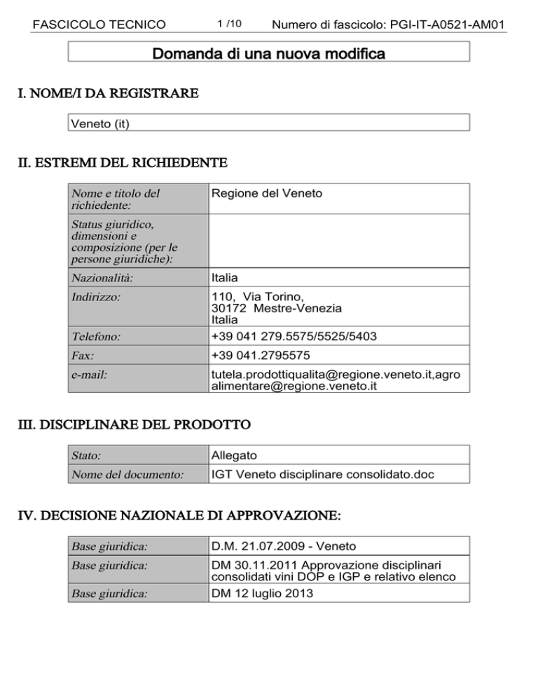 FASCICOLO TECNICO 1 /10 Numero di fascicolo: PGI-IT-A0521-AM01 Domanda di una nuova modifica I. NOME/I DA REGISTRARE Veneto (it) II. ESTREMI DEL RICHIEDENTE Nome e titolo del richiedente: Regione del Veneto Status giuridico, dimensioni e composizione (per le persone giuridiche): Nazionalità: Italia Indirizzo: Telefono: 110, Via Torino, 30172 Mestre-Venezia Italia +39 041 279.5575/5525/5403 Fax: +39 041.2795575 e-mail: [email protected],agro [email protected] III. DISCIPLINARE DEL PRODOTTO Stato: Allegato Nome del documento: IGT Veneto disciplinare consolidato.doc IV. DECISIONE NAZIONALE DI APPROVAZIONE: Base giuridica: D.M. 21.07.2009 - Veneto Base giuridica: DM 30.11.2011 Approvazione disciplinari consolidati vini DOP e IGP e relativo elenco DM 12 luglio 2013 Base giuridica: FASCICOLO TECNICO 2 /10 Numero di fascicolo: PGI-IT-A0521-AM01 V. DOCUMENTO UNICO Nome/i da registrare Veneto (it) Termine/i equivalente/i: Denominazione tradizionalmente usata: No Tipo di modifica: Corrigendum of a protected designation of origin or geographical indication La presente scheda tecnica include modifiche adottate in conformità a: Tipo di indicazione geografica: IGP - Indicazione geografica protetta 1. CATEGORIE DI PRODOTTI VITICOLI 1. Vino 8. Vino frizzante 2. DESCRIZIONE DEI VINI: Bianco, Bianco frizzante, Bianco passito, anche con specificazione del vitigno Caratteristiche analitiche: I valori chimico-fisici minimi, fra le diverse tipologie, sono: acidità totale minima 3,5 g/l; estratto non riduttore minimo 13,0 g/l; titolo alcolometrico volumico naturale minimo 9,00 % vol. Caratteristiche organolettiche: I vini bianchi sono caratterizzati da un colore che può essere da giallo chiaro paglierino con riflessi verdognoli, al giallo carico. All’olfatto presentano un profumo che può essere dal delicato all’intenso; al sapore posso essere da asciutti, ad amabili e morbidi, fino a dolci nel passito, armonici, presentano in relazione al vitigno ed alla maturità delle uve una buona struttura accompagnata da una buona sapidità. Rosso, Rosso frizzante, Rosso passito, Novello, anche con specificazione del vitigno Caratteristiche analitiche: I valori chimico-fisici minimi fra le diverse tipologie, sono: acidità totale minima 3,5 FASCICOLO TECNICO 3 /10 Numero di fascicolo: PGI-IT-A0521-AM01 g/l; estratto non riduttore minimo 17,0 g/l; titolo alcolometrico volumico naturale minimo 9,50 % vol. Caratteristiche organolettiche: I vini rossi presentano un colore che varia in relazione alla maturità che po’ essere dal rosso, al rosso rubino, per virare al granato. Si presentano talvolta all’olfatto intensi, e, a seconda del vitigno, possono presentare profumi di frutta più o meno matura, talvolta con sentori di confettura. Al sapore sono da dolci nel passito, ad amabili fino ad asciutti, intensi con eccellente sapidità. Rosato, Rosato frizzante, anche con specificazione del vitigno Caratteristiche analitiche: I valori chimico-fisici minimi fra le diverse tipologie, sono: acidità totale minima 3,5 g/l; estratto non riduttore minimo 14,0 g/l; titolo alcolometrico volumico naturale minimo 9,00 % vol. Caratteristiche organolettiche: Il rosato può essere più o meno intenso a seconda della tipologia e del vitigno di origine; presentano profumi da fini a fruttati, nell’insieme hanno un sapore da amabile ad asciutto, a morbido, sapidi e con un buon equilibrio. 3. MENZIONI TRADIZIONALI a. Punto a) Indicazione geografica tipica (IGT) b. Punto b) Passito Novello 4. PRATICHE DI VINIFICAZIONE a. Pratiche enologiche Tipo di pratica enologica: Descrizione della pratica: FASCICOLO TECNICO 4 /10 Numero di fascicolo: PGI-IT-A0521-AM01 b. Rese massime: Bianco, Rosso e Rosato, anche con specificazione del vitigno Resa massima: uva/ha: 25 t vino/ha: 200 hl Manzoni rosa Resa massima: uva/ha: 12 t vino/ha: 96 hl Syrah Resa massima: uva/ha: 15 t vino/ha: 120 hl Chardonnay, Pinot bianco, Pinot grigio, Pinot nero, Riesling renano, Cabernet franc, Traminer, Manzoni bianco, Sauvignon, Oseleta, Pedevenda, Marzemina bianca, Carménère, Rebo, Tai rosso, Petit Verdot, e Manzoni Moscato. Resa massima: uva/ha: 19 t vino/ha: 152 hl 5. ZONA DELIMITATA La zona di produzione delle uve per l’ottenimento dei mosti e dei vini a indicazione geografica tipica «Veneto» comprende: L’intero territorio amministrativo delle provincie di Belluno, Padova, Rovigo, Treviso, Venezia, Verona e Vicenza. a. Zona NUTS FASCICOLO TECNICO ITD37 ITD36 ITD35 ITD34 ITD33 ITD32 ITD31 ITD3 ITD IT 5 /10 Numero di fascicolo: PGI-IT-A0521-AM01 Rovigo Padova Venezia Treviso Belluno Vicenza Verona Veneto NORD-EST ITALIA b. Mappe della zona delimitata Numero di mappe allegate 0 6. UVE DA VINO a. Inventario delle principali varietà di uve da vino MALVASIA ROSA Rs. INCROCIO MANZONI 2.15 N. FRANCONIA N. CORVINA N. Chardonnay CABERNET SAUVIGNON N. CABERNET FRANC N. BARBERA N. SAUVIGNON B. RIESLING ITALICO B. RIESLING B. b. Varietà di uve da vino elencate dall'OIV Oseleta N Tocai Friulano B Tocai Rosso N Trebbiano di Soave Corvinone N Sangiovese N FASCICOLO TECNICO 6 /10 Numero di fascicolo: PGI-IT-A0521-AM01 Trebbiano Toscano B Refosco dal Peduncolo Rosso N Raboso Veronese N Pinella B Moscato Bianco B Verdiso B Molinara N Raboso Piave N Pinot Bianco B Rebo N Verduzzo Trevigiano B Petit Verdot N Verduzzo Friulano B Carmenere N Pedevenda N Malvasia Istriana B Manzoni Bianco B Marzemina Bianca B Muller-Thurgau B Marzemino N Manzoni Moscato N Syrah N Pinot Grigio G Vespaiola B Durella B Merlot N Malbech N Pinot Nero N Garganega B Rondinella N Traminer Aromatico Rs c. Altre varietà Glera b, Glera lunga b. 7. LEGAME CON LA ZONA GEOGRAFICA FASCICOLO TECNICO 7 /10 Numero di fascicolo: PGI-IT-A0521-AM01 Informazioni sulla zona geografica: Fattori naturali Il Veneto é una regione del Nord-est dell'Italia. La regione confina a est con il Friuli Venezia Giulia e con il Mare Adriatico, a nord con l'Austria, a nord-ovest con il Trentino Alto Adige, a ovest con la Lombardia