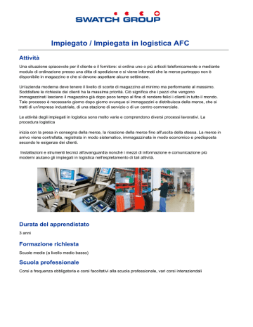 Impiegato / Impiegata in logistica AFC Attività Una situazione spiacevole per il cliente e il fornitore: si ordina uno o più articoli telefonicamente o mediante modulo di ordinazione presso una ditta di spedizione e si viene informati che la merce purtroppo non è disponibile in magazzino e che si devono aspettare alcune settimane. Un'azienda moderna deve tenere il livello di scorte di magazzino al minimo ma performante al massimo. Soddisfare le richieste dei clienti ha la massima priorità. Ciò significa che i pezzi che vengono immagazzinati lasciano il magazzino già dopo poco tempo al fine di rendere felici i clienti in tutto il mondo. Tale processo è necessario giorno dopo giorno ovunque si immagazzini e distribuisca della merce, che si tratti di un'impresa industriale, di una stazione di servizio o di un centro commerciale. Le attività degli impiegati in logistica sono molto varie e comprendono diversi processi lavorativi. La procedura logistica inizia con la presa in consegna della merce, la ricezione della merce fino all'uscita della stessa. La merce in arrivo viene controllata, registrata in modo sistematico, immagazzinata in modo economico e predisposta secondo le esigenze dei clienti. Installazioni e strumenti tecnici all'avanguardia nonché i mezzi di informazione e comunicazione più moderni aiutano gli impiegati in logistica nell'espletamento di tali attività. Durata del apprendistato 3 anni Formazione richiesta Scuole medie (a livello medio basso) Scuola professionale Corsi a frequenza obbligatoria e corsi facoltativi alla scuola professionale, vari corsi interaziendali Profilo richiesto Personalità interessata e motivata che trova sempre nuovi stimoli attraverso prestazioni ottenute grazie all'impegno personale Interesse per la comunicazione Doti organizzative Predisposizione a lavorare in team Disponibilità a lavorare a orari flessibili Disponibilità ad assumersi responsabilità Volontà di apprendere superiore alla media per affrontare con successo la costante evoluzione del settore tecnologico Formazione continua Specialista della logistica APF, specialista in processi dipl., capo di logistica dipl. Posti di apprendistato Comadur SA Col-des-Roches 33 CH-2400 Le Locle Telefono: +41 32 930 83 11 Signora Aurélie Nicolet, [email protected] Lingua di formazione: Francese Compagnie des Montres Longines, Francillon S.A. Les Longines CH-2610 Saint-Imier Telefono: +41 32 942 54 25 Lingua di formazione: Francese ETA SA Manufacture Horlogère Suisse Rue de la piscine CH-1950 Sion Telefono: +41 27 327 58 11 [email protected] Lingua di formazione: Francese ETA SA Manufacture Horlogère Suisse Route de France 29 Case postale 78 CH-2926 Boncourt [email protected] Lingua di formazione: Francese Nivarox-FAR S.A. Avenue du Collège 10 CH-2400 Le Locle Telefono: +41 32 933 43 34 Signora Aline Dubois, [email protected] Lingua di formazione: Francese Omega SA Jakob-Stämpflistrasse 96 CH-2502 Biel / Bienne Telefono: +41 32 343 92 11 Lingua di formazione: Francese ETA SA Manufacture Horlogère Suisse Schild-Rust-Strasse 17 CH-2540 Grenchen Telefono: +41 32 655 71 11 [email protected] Lingua di formazione: Tedesco Rado Uhren AG Bielstrasse 45 CH-2543 Lengnau BE Telefono: +41 32 655 61 11 [email protected] Signora Joëlle Martin, [email protected] Lingua di formazione: Tedesco The Swatch Group Services AG Längfeldweg 119 CH-2504 Biel / Bienne Telefono: +41 32 343 39 11 Lingue di formazione: Tedesco, Francese Informatico / Informatica AFC Attività Gli informatici concepiscono, realizzano, integrano, testano, gestiscono e curano la manutenzione di hardware, software e processi informatici. Gli informatici devono amare i cambiamenti, essere flessibili e sapersi integrare nel team di lavoro. Il know-how e le competenze vengono elaborati in modo autonomo, ma spesso anche all'interno del team. Occorre soddisfare le più svariate richieste dei clienti sin dalla formazione professionale di base offrendo un'assistenza ottimale. Queste le caratteristiche imprescindibili se si vuole imparare la professione di informatici. Il campo di lavoro quotidiano degli informatici comprende l'individuazione delle esigenze dei clienti, l'analisi di procedure, lo scambio di vedute con utenti, esperti del marketing e committenti, la concezione di proposte di soluzioni confacenti ai clienti, l'attuazione di concetti elaborati avvalendosi di software e sistemi idonei, l'esecuzione di test di applicazioni, la modifica di applicazioni esistenti, l'applicazione di metodi di gestione progettuale, la documentazione di soluzioni (ad es. redigendo manuali), la consulenza, la formazione di utenti, la selezione sul mercato di componenti hardware idonei nonché l'installazione e la configurazione di hardware. Durata del apprendistato 4 anni Formazione richiesta Massimo o ottimo livello della scuola dell'obbligo Scuola professionale Corsi a frequenza obbligatoria e corsi facoltativi alla scuola professionale, possibile la frequentazione della scuola media professionale (maturità professionale) Profilo richiesto Personalità interessata, motivata, comunicativa e orientata al team Disponibilità ad assumersi responsabilità Capacità di pensare in modo logico e astratto, capacità di comprensione rapida Buone prestazioni nelle scienze naturali, in matematica e nelle materie di cultura generale Buone conoscenze dell'inglese Disponibilità a lavorare a orari flessibili Capacità di individuare subito e di riparare difetti tecnici Resistenza, discrezione e diligenza Volontà di apprendere superiore alla media per affrontare con successo la costante evoluzione del settore tecnologico Formazione continua Informatico/a SSS, bachelor in informatica / master SUP / master (università) Posti di apprendistato The Swatch Group Assembly SA Via Campagna Adorna 30 CH-6852 Genestrerio Telefono: +41 91 640 30 10 Lingua di formazione: Italiano Comadur SA Col-des-Roches 33 CH-2400 Le Locle Telefono: +41 32 930 83 11 Signora Aurélie Nicol