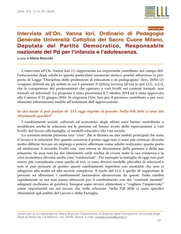 2016, VOL 12, N. 27, 79-83 INTERVISTA Intervista all’On. Vanna Iori, Ordinario di Pedagogia Generale Università Cattolica del Sacro Cuore Milano, Deputata del Partito Democratico, Responsabile nazionale del Pd per l'infanzia e l'adolescenza. a cura di Maria Boccolo L’intervista all’On. Vanna Iori (1) rappresenta un importante contributo nel campo dell’educazione degli adulti in questo particolare momento storico, poiché attraverso la proposta di Legge "Disciplina delle professioni di educatore e di pedagogista" (Iori, 2656) (2) vengono definiti sia gli ambiti in cui è presente il lifelong learning [d’ora in poi LLL, n.d.r], che le competenze dei professionisti che operano a vari livelli nei contesti formali, non formali ed informali. La proposta è stata presentata il 7 ottobre 2014 ed è stata approvata alla Camera il 21 giugno 2016. Si ringrazia l’On. Iori per il prezioso contributo e per aver rilasciato informazioni inedite all’indomani dell’approvazione. In che modo si può parlare di LLL oggi rispetto al passato. Nella Pdl 2656 ci sono dei riferimenti specifici? I cambiamenti sociali, culturali ed economici degli ultimi anni hanno contribuito a modificare anche le relazioni tra le persone ed hanno avuto delle ripercussioni a vari livelli: dal lavoro alla famiglia, ai modelli educativi alla vita sociale. Lo scenario attuale presenta una “crisi” che si dirama su due ambiti principali che sono il lavoro e le relazioni. Per quanto concerne il primo oggi non ci sono più certezze: diventa molto difficile trovare un impiego e potersi affermare come adulto realizzato; questo porta ad analizzare il secondo livello con una messa in discussione della persona e delle sue relazioni. Se essa non ha dei riferimenti saldi rischia di vivere male la sua esistenza e la crisi economica diventa anche crisi “esistenziale”. Per esempio la famiglia di oggi non può essere più considerata come quella di ieri, ci sono diversi modelli, pluralità di relazioni e non si può pensare di gestire questi cambiamenti repentini con modalità che non si adeguino alla realtà ed alla società complessa. Il ruolo del LLL è quello di supportare le persone ad affrontare i cambiamenti lasciandosi attraversare da questi. Tutto cambia rapidamente se noi non siamo attrezzati per il cambiamento con dei “costrutti mentali” adeguati rischiamo di perderci, bisogna saper invece alimentare e “cogliere l’imprevisto” come opportunità sia sul lavoro che nelle relazioni. Nella Pdl 2656 ci sono specifici riferimenti agli ambiti del Lavoro e della Famiglia. Autore per la Corrispondenza: Maria Buccolo, Dipartimento di Scienze della Formazione, Università degli Studi di Roma tre, via Milazzo 11b, 00185, Roma. E-mail: [email protected] 79 BUCCOLO Se ieri la figura del Pedagogista veniva automaticamente abbinata all’infanzia e all’adolescenza oggi non è più così. Infatti questo professionista opera in tutte le età della vita con delle caratterizzazioni e delle competenze specifiche che si maturano sia durante il percorso di studi sia durante l’esperienza sul campo. Chi si occupa di Educazione degli Adulti, deve imparare a stare “nei cambiamenti” per leggere la realtà con strumenti adeguati che diano la possibilità di progettare un intervento educativo rispondente al bisogno reale della persona. Da quanto detto, sembra che nella proposta di legge in oggetto emerge una attenzione al LLL anche rispetto agli ambiti di azione, ci può indicare quali sono? La definizione degli ambiti è sicuramente il punto centrale della proposta di legge poiché l’obiettivo è proprio quello di “mettere ordine” nei settori specifici andando a comprendere anche le interfacce con le altre professioni. In particolare, mi riferisco all’ambito Sanitario dove ad oggi operano prevalentemente gli educatori professionali provenienti dal Corso di Laurea SNT-2 (Medicina). All’interno della proposta di legge gli ambiti occupazionali sono suddivisi in base alle competenze e assumono denominazioni diverse. Da un lato abbiamo la figura di ”educatore professionale socio-sanitario” che riguarderà come settore di lavoro gli ambiti sanitari e socio-sanitari, mentre dall’altra parte ci sarà un “educatore professionale sociopedagogico” che riguarderà gli educatori provenienti da una formazione universitaria in “Scienze dell’Educazione e Formazione” e opererà in ambito educativo e socio-educativo. Gli altri ambiti riferiti ad LLL sono molteplici: Lavoro, Famiglia, Immigrazione, Cooperazione Internazionale, Ambiente e Cultura, Terza età, Giustizia, Scuola (orientamento e alternanza S/L), Sociale e Welfare. Quali sono gli obiettivi specifici della Pdl 2656? L’obiettivo principale è quello di definire gli ambiti di lavoro dei professionisti dell’educazione, definirne la figura e le competenze, riordinare l’accesso alla professione, dal titolo di studio all’accesso del mercato del lavoro, ed adeguarci ad un modello Europeo per garantire la circolarità del profilo anche in altri paesi. Quali cambiamenti porterà il testo di legge una volta approvato? Il principale cambiamento rispetto al passato sarà quello di poter beneficiare di un riconoscimento di professionalità che oggi non c’è. La professione educativa è storicamente piuttosto vaga e per alcuni aspetti difficile da comprendere. L'intento è quello di “far uscire dall'ombra” la dimensione di un profilo così importante ed indispensabile oggi nella nostra società. Nello stesso tempo avere professionisti qualificati significa elevare la qualità dei servizi. 80 BUCCOLO Come sono organizzati i profili dei laureati triennali e magistrali nel testo di legge? I laureati in uscita dai Corsi di Laurea [d’ora in poi CDL, n.d.r] triennale in Scienze dell’Educazione (L-19) con il titolo di “educatore professionale socio-pedagogico” e gli studenti in uscita dal CDL triennale interclasse con Medicina (SNT-2) con il titolo di “e