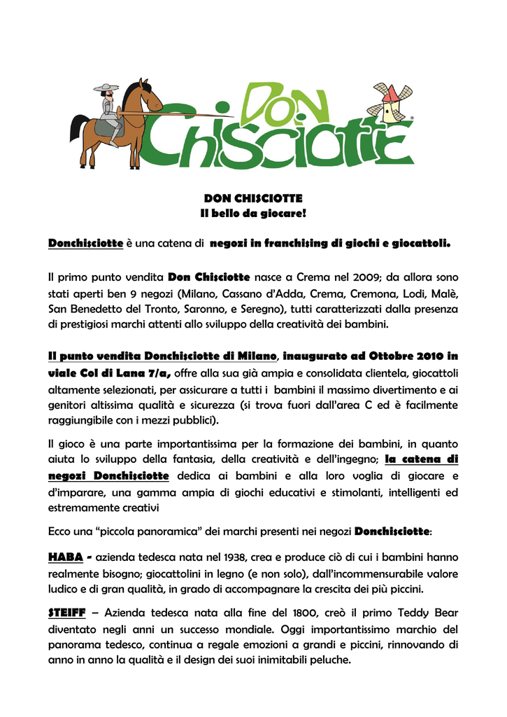 DON CHISCIOTTE Il bello da giocare! Donchisciotte è una catena di negozi in franchising di giochi e giocattoli. Il primo punto vendita Don Chisciotte nasce a Crema nel 2009; da allora sono stati aperti ben 9 negozi (Milano, Cassano d’Adda, Crema, Cremona, Lodi, Malè, San Benedetto del Tronto, Saronno, e Seregno), tutti caratterizzati dalla presenza di prestigiosi marchi attenti allo sviluppo della creatività dei bambini. Il punto vendita Donchisciotte di Milano, inaugurato ad Ottobre 2010 in viale Col di Lana 7/a, offre alla sua già ampia e consolidata clientela, giocattoli altamente selezionati, per assicurare a tutti i bambini il massimo divertimento e ai genitori altissima qualità e sicurezza (si trova fuori dall’area C ed è facilmente raggiungibile con i mezzi pubblici). Il gioco è una parte importantissima per la formazione dei bambini, in quanto aiuta lo sviluppo della fantasia, della creatività e dell’ingegno; la catena di negozi Donchisciotte dedica ai bambini e alla loro voglia di giocare e d’imparare, una gamma ampia di giochi educativi e stimolanti, intelligenti ed estremamente creativi Ecco una “piccola panoramica” dei marchi presenti nei negozi Donchisciotte: HABA - azienda tedesca nata nel 1938, crea e produce ciò di cui i bambini hanno realmente bisogno; giocattolini in legno (e non solo), dall’incommensurabile valore ludico e di gran qualità, in grado di accompagnare la crescita dei più piccini. STEIFF – Azienda tedesca nata alla fine del 1800, creò il primo Teddy Bear diventato negli anni un successo mondiale. Oggi importantissimo marchio del panorama tedesco, continua a regale emozioni a grandi e piccini, rinnovando di anno in anno la qualità e il design dei suoi inimitabili peluche. SIGIKID – Azienda tedesca nata nel 1968; produce giocattoli dal design semplice, ma estremamente accattivante, amati da un pubblico sempre più esigente e variegato. LILLIPUTIENS - Azienda belga specializzata nella progettazione e esclusiva produzione di giochi in stoffa di altissima qualità. Questa caratteristica rende questo marchio unico nell’ampio mondo delle aziende nel settore giocattolo. I giocattoli di Lilliputiens sono divertenti, belli e dall’altissimo contenuto educativo. Nei negozi Donchisciotte sarà possibile riscoprire la bellezza e l’importanza di giochi attivi e creativi che, nell’era dei videogames, pensavamo scomparsa; il fascino di una pista di treni in legno, gli strumenti musicali, le biglie, i cavalli a dondolo, le bambole di pezza, i cubi in legno, arguti rompicapo e tantissimo altro! In un ambiente stimolante e divertente, caratterizzato da pareti colorate e prodotti esposti per tipologia di marchio, all’interno dei negozi Donchisciotte troverete chi potrà darvi risposte mirate e consigliarvi sulle ultime novità del mondo dei giocattoli; lo staff dei negozi Donchisciotte infatti è sempre aggiornato e altamente preparato su tutti i prodotti presenti all’interno dei punti vendita, attento alle esigenze di grandi e piccini in materia di divertimento, sicurezza ed apprendimento. …E da oggi una novità che renderà il negozio Donchisciotte di Milano ancora più unico e speciale nel suo genere: non saranno solo i giochi a rallegrare i bambini ma anche le caramelle; nel negozio Donchisciotte Milano infatti sarà possibile scegliere tra una vasta gamma di caramelle, confezionate e sciolte, gommose e dure, dalle molteplici forme, colori e sapori. Il segreto del successo del negozio Donchisciotte? Un mix di “divertimento innovativo, creativo e di qualità” al “gusto dolce e colorato” delle caramelle. Passare del tempo di qualità con i propri bambini e sempre più importante, ora è possibile grazie ai giochi didattici venduti dalla catena di negozi Donchisciotte. www.donchisciotteonline.it UFFICIO STAMPA: BMK Cristina Ghiringhelli Via Senato, 18 20121 – Milano Tel. 02-865984/867026 E.mail: [email protected]