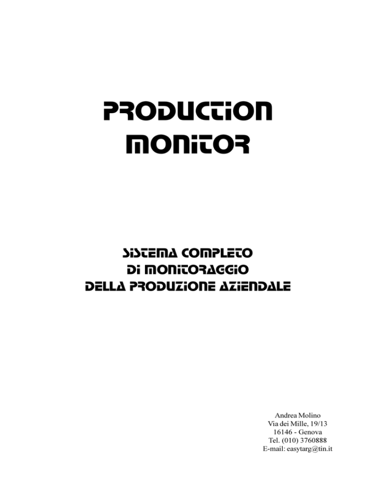 Production Monitor Sistema completo di monitoraggio della Produzione Aziendale Andrea Molino Via dei Mille, 19/13 16146 - Genova Tel. (010) 3760888 E-mail: [email protected] -1- Indice Introduzione 4 Progetto - Schema funzionale 5 - Soluzione minimale 7 - Soluzione completa 8 Base Hardware - Scheda di rilevamento 10 - Schede di rete 10 - Cablaggi 11 - Personal Computer 11 Base Dati - Struttura dellapplicazione 12 - Data di Produzione 16 - Data Base di Configurazione 19 - Data Base dei dati di reparto 28 Base Software - Gestione dellapplicazione 42 - Acquisizione Dati 42 - Causalizzazione delle fermate 43 - Visualizzazione ed analisi dei dati 43 - Utility 43 -2- Programmi Installazione CED Server - Configuration Center - Sentinel ( ConfCent.EXE ) ( Sentinel.EXE ) 44 48 - Stop Manager - Production Counter - AS/400 Broker ( StopMan.EXE ) ( ProdCnt.EXE ) ( ASBroker.EXE ) 49 51 53 ( DQServer.EXE ) ( DQServer.EXE ) ( DQServer.EXE ) 56 58 59 Installazione Data Server - Data Linker - Data Server - Data Loader Installazione Causalizzatore - Stop Client Linker - Stop Causalizer ( SCLinker.EXE ) ( StopCli.EXE ) 60 62 ( Analizer.EXE ) ( RealMon.EXE ) 66 68 ( Edit Mon.EXE ) ( DQMonito.EXE ) ( DQReReal.EXE ) ( DBBrowse.EXE ) ( RPQComp.EXE ) ( Skeduler.EXE ) 70 72 73 74 79 81 ( LabMan.EXE ) ( LabPrint.EXE ) ( MonDisc.EXE ) 92 92 93 Programmi Utente - Production Analizer - RealTime Monitor Programmi Utility - Edit Monitor - Data Monitor - DQ Repeat RealTime - Data Browser - RPQ Compress - Win Scheduler Programmi Custom - Lato Server - Lato Client - Lato User Installazione e Configurazione 94 Stabilimento DEMO 96 -3- Introduzione Sapere esattamente cosa succede e cosa è successo nei reparti produttivi, permette di individuare eventuali punti deboli della catena di produzione, di effettuare calcoli statistici per determinare i tempi necessari per una particolare produzione, di mettere a punto strategie atte ad evitare fermate inutili, di reagire immediatamente al verificarsi di imprevisti. In ogni azienda esistono canali di comunicazione bidirezionali tra il personale direttivo e quello di produzione che si basano in molti casi, su supporti cartacei spesso compilati manualmente, specie per quanto riguarda il feed-back dai reparti di produzione al centro di pianificazione. Questo genere di comunicazioni è soggetto a ritardi, imprecisioni, manipolazioni e comunque rende impossibile un controllo in tempo reale e difficoltoso qualunque tipo di ottimizzazione. Questo progetto costituisce un sistema completo di monitoraggio delle macchine di un qualunque reparto di produzione: con esso è possibile conoscere in tempo reale lo stato in cui si trova ogni macchina, quanti pezzi ha prodotto, qualè la sua produzione oraria. I dati vengono registrati in file speciali che possono essere in seguito analizzato in modo da ottenere grafici, per ogni macchina, della produzione oraria istantanea, rilevando così fermate o qualunque altra anomalia. I dati possono essere inviati a sistemi di elaborazione centralizzati dellazienda come, ad esempio, un sistema I.B.M. AS/400 per una correlazione ad altre attività aziendali, o per la pianificazione della produzione. -4- Progetto Il sistema di monitoraggio presenta il grande vantaggio di onottima scalabilità, può, cioè, essere adattato alle particolari esigenze di qualunque azienda, anche di piccole dimensioni, senza implicare delle spese eccessive. Un punto di forza della soluzione, qui proposta, è la possibilità di personalizzare ogni parte del sistema in modo da rispondere a qualunque richiesta. Grazie a questa flessibilità, i tempi di apprendimento necessari allutilizzo del software di controllo, sono minimi: in pratica non si costringe lutente ad adattarsi al sistema, ma si costruisce il sistema su misura, minimizzando le procedure di configurazione, manutenzione ed utilizzo. Di seguito verrà illustrato lo schema funzionale della catena di rilevazione, quindi si passerà alla descrizione di due possibili realizzazioni, una minimale ed una completa. Schema funzionale Ogni macchina industriale di produzione, viene guidata da un P.L.C. che esegue un programma; il P.L.C. è collegato ad una serie di sensori e di attuatori che vengono azionati in modo da ottenere lazione desiderata. Tramite il programma del P.L.C. è possibile rilevare listante in cui viene completato un ciclo, ovvero viene prodotto un pezzo, quindi è possibile fare in modo che venga emesso un segnale elettrico al verificarsi di quellevento. Tramite normali cavi elettrici bipolari, i segnali prodotti dai P.L.C. vengono raccolti da una scheda collegata ad un Personal Computer. Sul P.C., un particolare software controlla costantemente la scheda di rilevamento e scrive i dati in un file dati storico che può essere localizzato sul P.C. stesso, o sul server di rete. Viene inoltre aggiornato il file per il monitoraggio in tempo reale. I programmi di monitoraggio, tramite il collegamento di rete, legge in tempo reale i file dati, e visualizzano lo stato di ogni macchina. Ogni giorno viene creato un nuovo file dati, e quelli dei giorni passati possono essere analizzati graficamente. -5- -6- Soluzione minimale La soluzione minimale prevede un semplice P.C. per il rilevamento, a cui viene collegata la scheda che raccoglie i segnali provenienti dai P.L.C.. Il P.C. di rilevamento tramite un collegamento di rete comunica con il P.C. utilizzato per il monitoraggio e lanalisi dei dati, collocato presso lufficio di controllo e pianificazione. Con questa soluzione è sufficiente un unico operatore per mantenere sotto controllo lintera produzione; la manutenzione necessaria al sistema consiste semplicemente nella gestione dei file dati già completamente analizzati. -7- Soluzione completa La soluzione completa risulta facilmente attuabile, se lazienda è gia provvista di una rete locale; in pratica si tratta di integrare la soluzione minima del sistema di rilevamento con la rete locale. I file dei dati vengono creati s