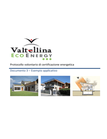 Protocollo volontario di certificazione energetica Documento 3 – Esempio applicativo Valtellina EcoEnergy – Esempio applicativo PROGETTO PROMOSSO E FINANZIATO DA: Provincia di Sondrio Camera di Commercio di Sondrio Confartigianato Imprese Sondrio Confindustria Sondrio Coldiretti Sondrio Unione del Commercio, del Turismo e dei Servizi della Provincia di Sondrio PROGETTO ESEGUITO DAL GRUPPO DI LAVORO COSTITUITO DA: Associazione Valtellina EcoEnergy Politec - Polo dell’Innovazione della Valtellina Politecnico di Milano - Polo Territoriale di Lecco COORDINAMENTO SCIENTIFICO: Prof. Ing. Marco Imperadori Prof. Ing. Gabriele Masera Politecnico di Milano - Polo Territoriale di Lecco COORDINAMENTO OPERATIVO: Ing. Graziano Salvalai - Politecnico di Milano - Polo Territoriale di Lecco STESURA DEL DOCUMENTO A CURA DI: Ing. Graziano Salvalai - Politecnico di Milano - Polo Territoriale di Lecco Ing. Francesco Pradella - Politec – Polo dell’Innovazione della Valtellina Versione 2 del 16/09/2015 Valtellina EcoEnergy – Esempio applicativo Versione 2 del 16/09/2015 Valtellina EcoEnergy – Esempio applicativo Versione 2 del 16/09/2015 SOMMARIO 1. CASO STUDIO - CASA VALTELLINA ECOENERGY 2.0 ............................................................... 58 2. INFORMAZIONI GENERALI...................................................................................................... 59 2.1. Dati di contesto dell’edificio .................................................................................................. 59 2.2. Dati relativi all’utenza e parametri gestionali ........................................................................ 59 2.3. Proprietà geometriche dell’edificio ....................................................................................... 60 3. PIANTE, SEZIONI E PROSPETTI................................................................................................ 61 3.1. Pianta piano terra................................................................................................................... 61 3.2. Pianta primo piano ................................................................................................................. 62 3.3. Pianta sottotetto .................................................................................................................... 63 3.4. Sezione A-A ............................................................................................................................ 64 3.5. Sezione B-B ............................................................................................................................. 64 3.6. Prospetto Nord....................................................................................................................... 65 3.7. Prospetto Ovest ..................................................................................................................... 65 3.8. Prospetto Sud ......................................................................................................................... 66 3.9. Prospetto Est .......................................................................................................................... 66 4. COMPONENTI STRUTTURALI DELL’EDIFICIO .......................................................................... 67 4.1. Componenti trasparenti ......................................................................................................... 67 4.1.1. Finestra anta singola 1,00x1,80 ............................................................................................. 68 4.1.2. Finestra anta doppia 2,00x1,80 ............................................................................................. 68 4.1.3. Portafinestra doppia anta 2,40x2,50 ..................................................................................... 68 4.2. Componenti opachi ................................................................................................................ 69 4.2.1. Parete esterna cappotto ........................................................................................................ 70 4.2.2. Parete garage ......................................................................................................................... 71 4.2.3. Parete interna ........................................................................................................................ 72 4.2.4. Solaio controterra radiante .................................................................................................... 73 4.2.5. Solaio controterra garage ...................................................................................................... 74 4.2.6. Solaio interno ......................................................................................................................... 75 4.2.7. Solaio verso terrazzo (zona riscaldata) .................................................................................. 76 Valtellina EcoEnergy – Esempio applicativo Versione 2 del 16/09/2015 4.2.8. Solaio verso terrazzo (garage) ............................................................................................... 77 4.2.9. Solaio verso sottotetto ........................................................................................................... 78 4.2.10. Tetto .................................................................................................................................. 79 4.2.11. Porta ingresso 1,00x2,10................................................................................................... 80 4.2.12. Porta legno 0,85x2,10 ....................................................................................................... 80 4.2.13. Porta garage 3,50x2,90..................................................................................................... 81 5. ZONA TERMICA CLIMATIZZATA ....................................................
