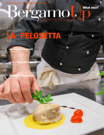 Anno Quinto numero QuarantaTre | Aprile Duemilaquattordici | Euro Tre What else? Il mensile più letto della città Storia di Copertina LA PELOSETTA Pagina 8 CINEMA 300 - L’ALBA DI UN IMPERO PAGINA 28 MUSICA R.E.M. - I SOGNATORI DI ATHENS PAGINA 30 ECONOMIA I RENDIMENTI NON SALGONO PAGINA 22 300 CUCINE SOTTOCOSTO DA 3000 EURO 220 CAMERE SOTTOCOSTO DA 1900 EURO 250 SOGGIORNI PIU’ DIVANI DA 800 EURO 140 CAMERETTE SOTTOCOSTO DA 900 EURO Via Pietro Nenni, 51 24050 | CALCINATE (Bg) | tel 035 844930 www.arredamentiriuniti.net aperto tutti i giorni 9.00 - 12.30 / 14.00 - 19.30 | Chiuso Domenica e Lunedì | Mercoledì aperto fino alle 22.00 via S. Alessandro, 26/a - Bergamo 035. 319380 - www.gionchilie.it 4 STA PER ARRIVARE L’ESTATE L’Editoriale Sta per arrivare l’estate, solo pochi mesi e potrò stare sdraiato al sole in compagnia dei miei padroni, giocare nei prati e godermi la bella stagione! Molti cani però non sono fortunati come me, per poter andare in vacanza “senza pensieri” i loro padroni preferiscono abbandonarli sulle strade (tradendo la loro fiducia e il loro incomparabile affetto) piuttosto che portarli con sé o affidarli a qualcuno di competente che si possa occupare di loro per qualche giorno. Come potete lasciarci a noi stessi dopo tutto l’amore e le attenzioni che vi diamo senza chiedere nulla in cambio? Bisogna fermare questa pessima abitudine che ogni anno di più va consolidandosi; oltre a essere un reato perseguibile per legge, ci ferisce e ci lascia nel degrado di una vita di randagismo, malattie e rischi per la nostra vita. Anche noi abbiamo il diritto di vivere una vita sana e felice! Sono più di 100.000 gli animali che ogni anno vengono abbandonati in seguito alle vacanze estive, perché nonostante gli appelli delle associazioni in nostra difesa, questo fenomeno incivile continua a ripetersi? Arturo 5 Editore Editrice BergamoUp srl Direttore Responsabile ed Editoriale Renata Sortino Redazione Chiara De Troia [email protected] Segretaria di redazione Alessia Paganelli [email protected] [email protected] Responsabile Marketing Pietro DiBilio [email protected] Marketing & Pubbliche relazioni Ghione Cristiana, Barbara Epis Responsabile grafica e impaginazione Carlo Rondi [email protected] Progetto grafico rondicarlodesign.tk Stampa Quippe.it Responsabile Web, Social e Fotografia SergioLombi.com Fotografi Matteo Mottari Sergio Lombi Chiara De Troia Carlo Rondi Hanno Collaborato: Vip International, Giorgio Arfaras, Andrea Lodetti, Massimo Buttinoni, Samuele Sortino, Nalla Ciombioni, Alice Cerea, Monica D’intino, Graziano Lanza, Cristiana Ghione, Maurizio Lorenzi, Mr. Pink, Marco Chiari. Crediti Fotografici: Per Le Immagini Senza Crediti L’editore Ha Ricercato Con Ogni Mezzo I Titolari Dei Diritti Fotografici Senza Riuscire A Reperirli. È Ovviamente A Piena Disposizione Per L’assolvimento Di Quanto Occorre Nei Loro Confronti. © Copyright Bergamoup Magazine: Testi E Immagini Della Presente Pubblicazione Non Possono Essere Riprodotti Con Mezzi Grafici, Meccanici, Elettronici O Digitali Senza Autorizzazione Firmata Da Editrice Bergamoup Srl. Ogni Violazione Sarà Perseguita A Norma Di Legge. Bergamoup, Periodico Mensile Di Informazione Locale; Iscrizione Presso Il Tribunale Di Bergamo N. 16/2009 Del Maggio 2009 Vision 82 S.r.l.s. - Concessionaria Pubblicità e Abbonamenti Sede Legale: Via Palma Il Vecchio - 24128 Bergamo (Bg) Cod. Fisc. E P.iva: 03906920164 7 8 SOMMARIO APRILE DUEMILAQUATTORDICI PUBBLIREDAZIONALI LA PELOSETTA 8 CARIMATI 10 OLTRE IL BAGNO 14 TREVIGLIO28 RUBRICHE............21 EVENT..................85 9 REDAZIONALE L STORIA DI COPERT IN A LA PELOSETTA a Pelosetta è il ristorante perfetto, ideale per tutte le occasioni. Sarà perchè rispecchia perfettamente la personalità dei proprietari Giampietro e Katia Cidali, sarà perchè l’ambiente raffinato e di design ti avvolge mettendoti subito a tuo agio, sarà perchè si mangia divinamente tutto, dal pesce alla pizza, passando dalla carne e finendo con i dolci. Sarà quel sarà, ma La Peloseta risulta essere la scelta azzecata, sempre, da 19 anni una garanzia (l’anniversario cade proprio questo mese). Nel cuore di Pedrengo un gioiello di design e buona cucina, condito (è proprio il caso di dirlo), dalla professionalità dello staff, “ La Pelosetta, Ristorante Pizzeria” vanta un’esperienza decennale a servizio dei clienti che vengono accolti con un’ inesauribile passione, e serviti con pietanze prelibate dalle note sarde. Un ristorante-pizzeria creato per soddisfare ogni desiderio culinario, dove il gusto e tradizione si fondono per esaltare i sapori e i profumi tipici della cucina mediterranea e naturalmente quella tipica sarda. Un mix vincente, che ha puntato sulle materie prime di alta qualità, abbinate con la tradizione offrendo il giusto equilibrio tra qualità e prezzo. La proposta della cucina è ispirata chiaramente ai profumi del mare della sardegna che la fanno da padrona in menù, tra i primi per esempio emergono i “Paccheri delizia di mare”, un piatto che profuma di bontà alla sola vista. Anche la tradizionale scelta della carne vanta una selezione particolare, come il maialino al forno con mirto, piatto tipico della tradizione sarda che alla Pelosetta viene cucinato decisamente ad hoc. Il reparto pizzeria merita una nota di merito, data l’ampissima scelta dalle 60 pizze presenti in menù, con la possibilità di scegliere anche la tipologia dell’impasto: da quello tradizionale, a quello glutin - free per i ciliaci, passando da quelli biologici al farro o Kamut. 10 Tutte le pietanze potranno essere accompagnati dai migliori vini presenti nel mercato, infatti La Pelosetta ha oltre 100 etichette presenti in enoteca tra fermi e champagne, e se siete amanti delle birre troverete anche una vastissima scelta tra bionde, rosse, doppie e triple malti. Il momento dedicato al dessert è decisamente catartico: una variegatissima offerta tra torte, pasticceria, creme, g