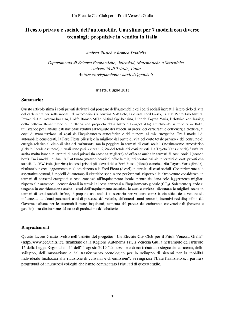 Un Electric Car Club per il Friuli Venezia Giulia Il costo privato e sociale dell’automobile. Una stima per 7 modelli con diverse tecnologie propulsive in vendita in Italia Andrea Rusich e Romeo Danielis Dipartimento di Scienze Economiche, Aziendali, Matematiche e Statistiche Università di Trieste, Italia Autore corrispondente: [email protected] Trieste, giugno 2013 Sommario: Questo articolo stima i costi privati derivanti dal possesso dell’automobile ed i costi sociali inerenti l’intero ciclo di vita del carburante per sette modelli di automobile (la benzina VW Polo, la diesel Ford Fiesta, la Fiat Punto Evo Natural Power bi-fuel metano-benzina, l’Alfa Romeo MiTo bi-fuel Gpl-benzina, l’ibrida Toyota Yaris, l’elettrica con leasing della batteria Renault Zoe e l’elettrica con proprietà della batteria Peugeot iOn) attualmente in vendita in Italia, utilizzando per l’analisi dati nazionali relativi all'acquisto dei veicoli, ai prezzi dei carburanti e dell’energia elettrica, ai costi di manutenzione, ai costi dell’inquinamento atmosferico e del rumore, al mix energetico. Tra i modelli di automobile considerati, la Ford Fiesta (diesel) è la migliore dal punto di vita del costo totale privato e del consumo di energia relativo al ciclo di vita del carburante, ma la peggiore in termini di costi sociali (inquinamento atmosferico globale, locale e rumore), i quali sono pari a circa il 2,7% del totale dei costi privati. La Toyota Yaris (ibrida) è un'altra scelta molto buona in termini di costi privati (la seconda migliore) ed efficace anche in termini di costi sociali (second best). Tra i modelli bi-fuel, la Fiat Punto (metano-benzina) offre le migliori prestazioni sia in termini di costi privati che sociali. La VW Polo (benzina) ha costi privati più elevati della Ford Fiesta (diesel) e anche della Toyota Yaris (ibrido), risultando invece leggermente migliore rispetto alla Ford Fiesta (diesel) in termini di costi sociali. Contrariamente alle aspettative comuni, i modelli di automobili elettriche sono meno performanti, rispetto alle altre vetture considerate, in termini di consumi energetici e costi connessi all’inquinamento locale mentre risultano solo leggermente migliori rispetto alle automobili convenzionali in termini di costi connessi all’inquinamento globale (CO2). Solamente quando si tengono in considerazione anche i costi dell’inquinamento acustico, le auto elettriche diventano le migliori scelte in termini di costi sociali. Infine, si propone una analisi di scenario per valutare come la classifica delle vetture sia influenzata da alcuni parametri: anni di possesso del veicolo, chilometri annui percorsi, incentivi resi disponibili dal Governo italiano per le automobili meno inquinanti, aumento del prezzo dei carburante convenzionali (benzina e gasolio), una diminuzione del costo di produzione delle batterie. Ringraziamenti Questo lavoro è stato svolto nell’ambito del progetto: “Un Electric Car Club per il Friuli Venezia Giulia” (http://www.ecc.units.it/), finanziato dalla Regione Autonoma Friuli Venezia Giulia nell'ambito dell'articolo 16 della Legge Regionale n.14 dell'11 agosto 2010 "Concessione di contributi a sostegno della ricerca, dello sviluppo, dell’innovazione e del trasferimento tecnologico per lo sviluppo di sistemi per la mobilità individuale finalizzati alla riduzione di consumi e di emissioni". Si ringrazia l’Ente finanziatore, i partners progettuali ed i numerosi colleghi che hanno commentato i risultati di questo studio. 1 Un Electric Car Club per il Friuli Venezia Giulia Acronimi usati CH4: Metano CO2: Anidride Carbonica NOx: Ossido di Azoto PM2.5: Particolato (diametro inferiore a 2.5 micron) PM10: Particolato (diametro inferior a 10 micron) SOx: Ossido di Zolfo SO2: Biossido di Zolfo TtW: Tank-to-Wheels WtT: Well-to-Tank WtW: Well-to-Wheels Introduzione Il movimento delle persone e delle merci è ritenuto fondamentale per lo sviluppo economico e sociale, anche se consuma notevoli quantità di energia e genera vari impatti ambientali, come l’inquinamento atmosferico globale e locale. Al fine di raggiungere un migliore equilibrio tra i pro ed i contro del trasporto, i governi hanno emanato normative e hanno concesso incentivi per sviluppare nuovi veicoli e favorire l'uso di carburanti più puliti. L'industria automobilistica ha reagito sviluppando veicoli con diverse tipologie di alimentazione (metano, il gas di petrolio liquefatto; l’ibrido; elettrica, elettrica ad autonomia estesa, idrogeno, celle a combustibile, ecc.), oggigiorno disponibili sul mercato. Dinanzi a questo incremento dell’offerta, il consumatore decide quale veicolo acquistare e utilizzare sulla base delle sue preferenze circa alcuni attributi, tra cui i costi di acquisto e di funzionamento, l’efficienza energetica e ambientale. Sia i governi sia i consumatori prendono le loro decisioni sulla base della conoscenza scientifica esistente e prevalente. Tuttavia, gli scienziati che cercano di stimare i costi di esercizio dei diversi veicoli e di valutare la loro efficienza energetica e ambientale si trovano ad affrontare un compito difficile in quanto sussistono molte incertezze derivanti dalla mancanza di dati, da fonti incerte, da conoscenze insufficienti, da elevata variabilità nelle misurazioni, da errori, ecc. Un’attenta analisi della letteratura scientifica sull’efficienza energetica ed ambientale, nonché sui costi privati delle diverse tipologie di alimentazione non porta, attualmente, a dati unici ed applicabili a qualsiasi Paese. Ciò nonostante, alcune convergenze sussistono, in particolare sui seguenti aspetti concernenti i nuovi sistemi propulsivi: I veicoli diesel di ultima generazione sono più efficienti, sia dal punto di vista energetico che ambientale, dei veicoli a benzina. Le automobili alimentate a gas naturale sono abbastanza efficienti anche se, in molti paesi la disponibilità di gas naturale e la sua distribuzione sono insufficienti